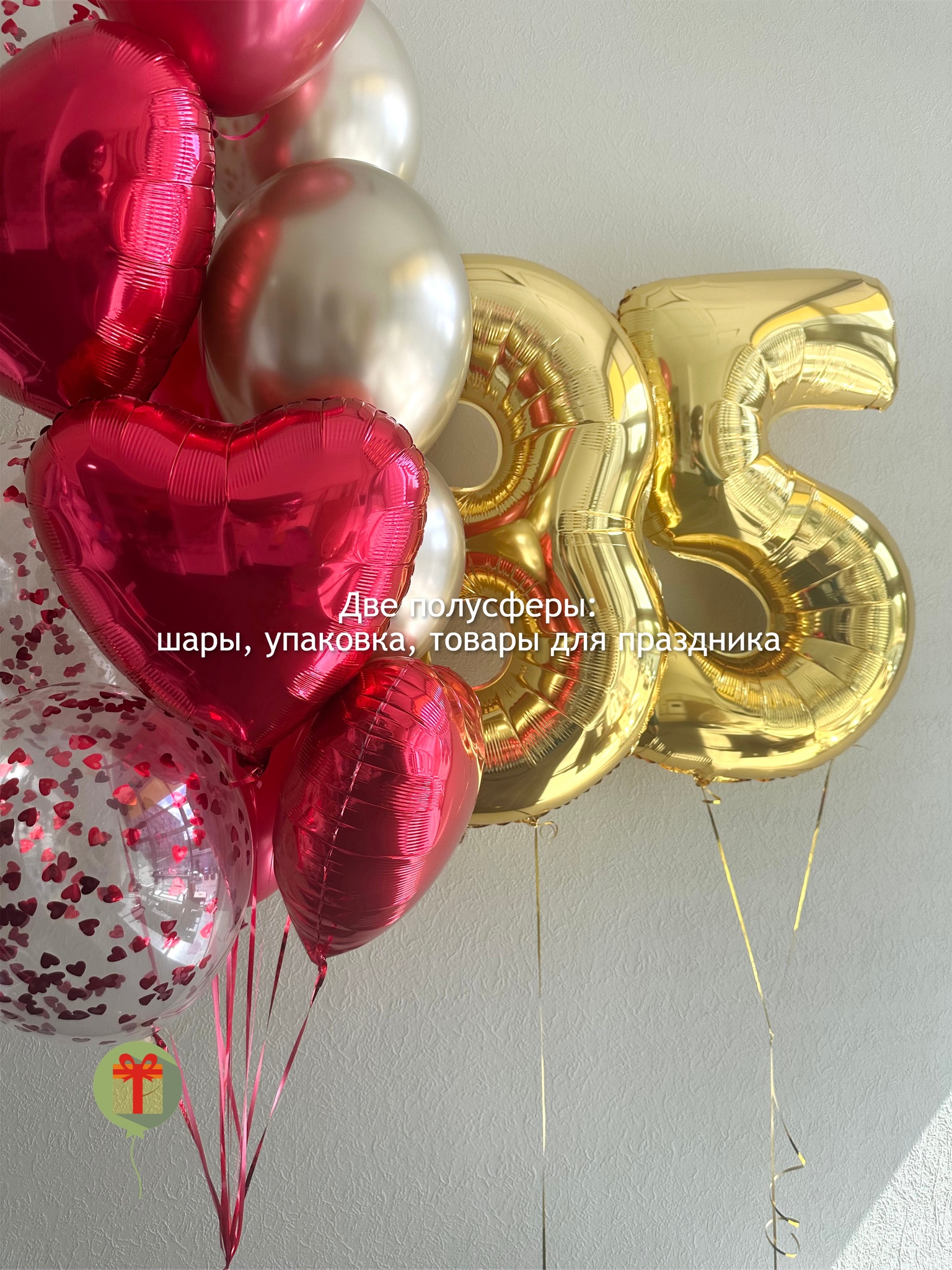 Фольгированные цифры 102 см , фонтан из 10 шаров, 2 фольгированных сердца 45 см, 3 шара с конфетти и 5 шаров хром, грузики и пакеты входят в стоимость.