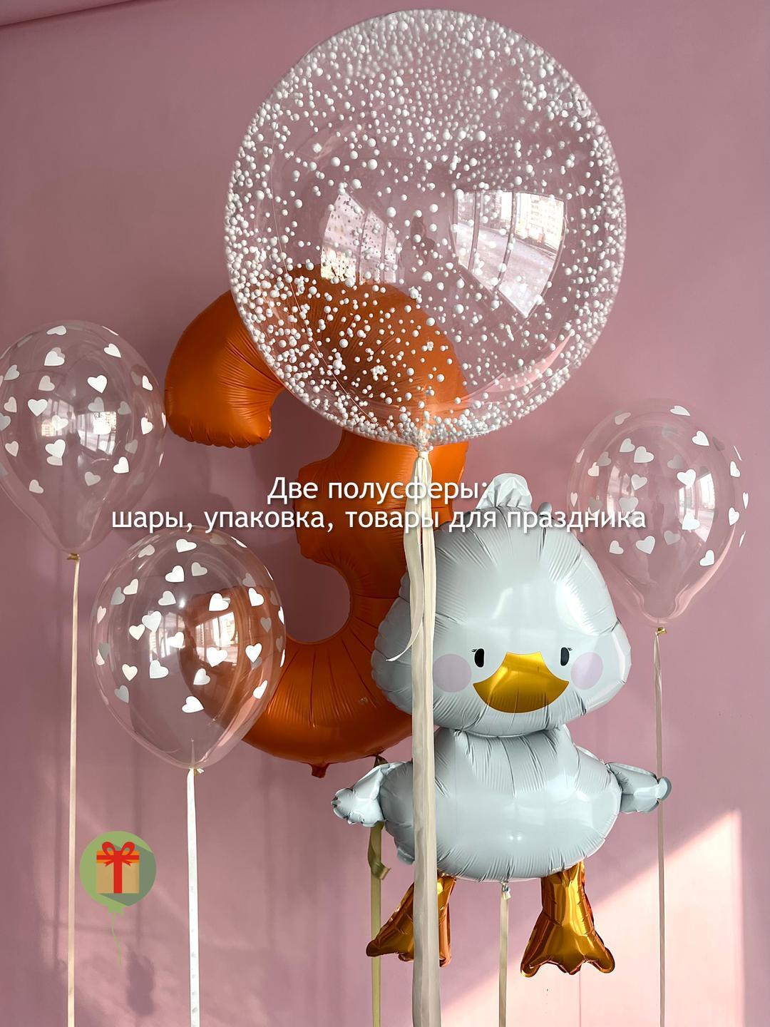 Сфера 60 см с пенопластом, фольгированная цифра 102 см, фигура уточки и 3 шара с рисунком. Грузики и пакеты включены в стоимость.