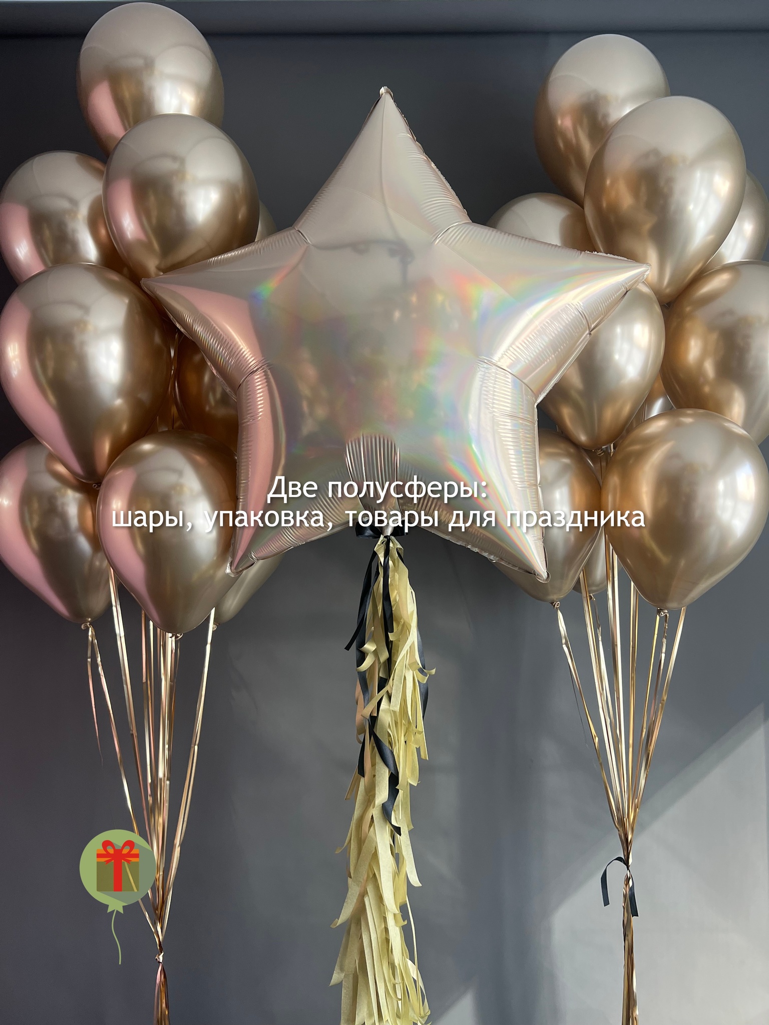 Фольгированная звезда 60 см, декорированная пышным хвостом и 2 фонтана по 10 шаров хром. Грузики и пакеты включены в стоимость.