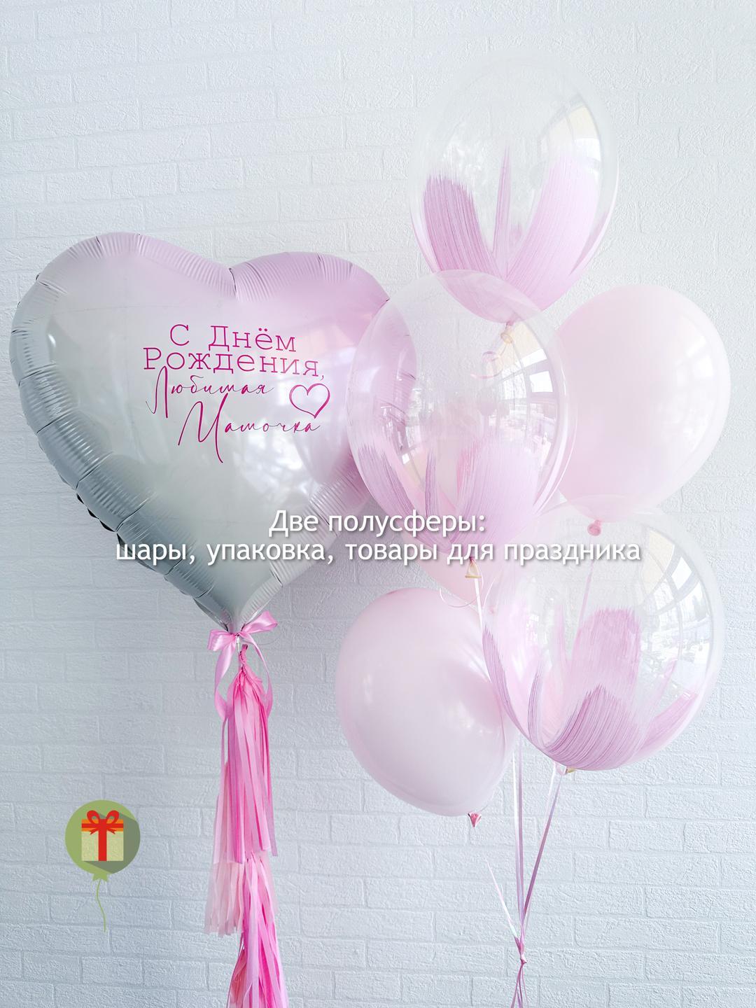 Фольгированное сердце 60 см+ надпись, декорировано пышным хвостом и фонтан из 6 штук: 3 шара браш и 3 шара пастель. Грузики и пакеты включены в стоимость.