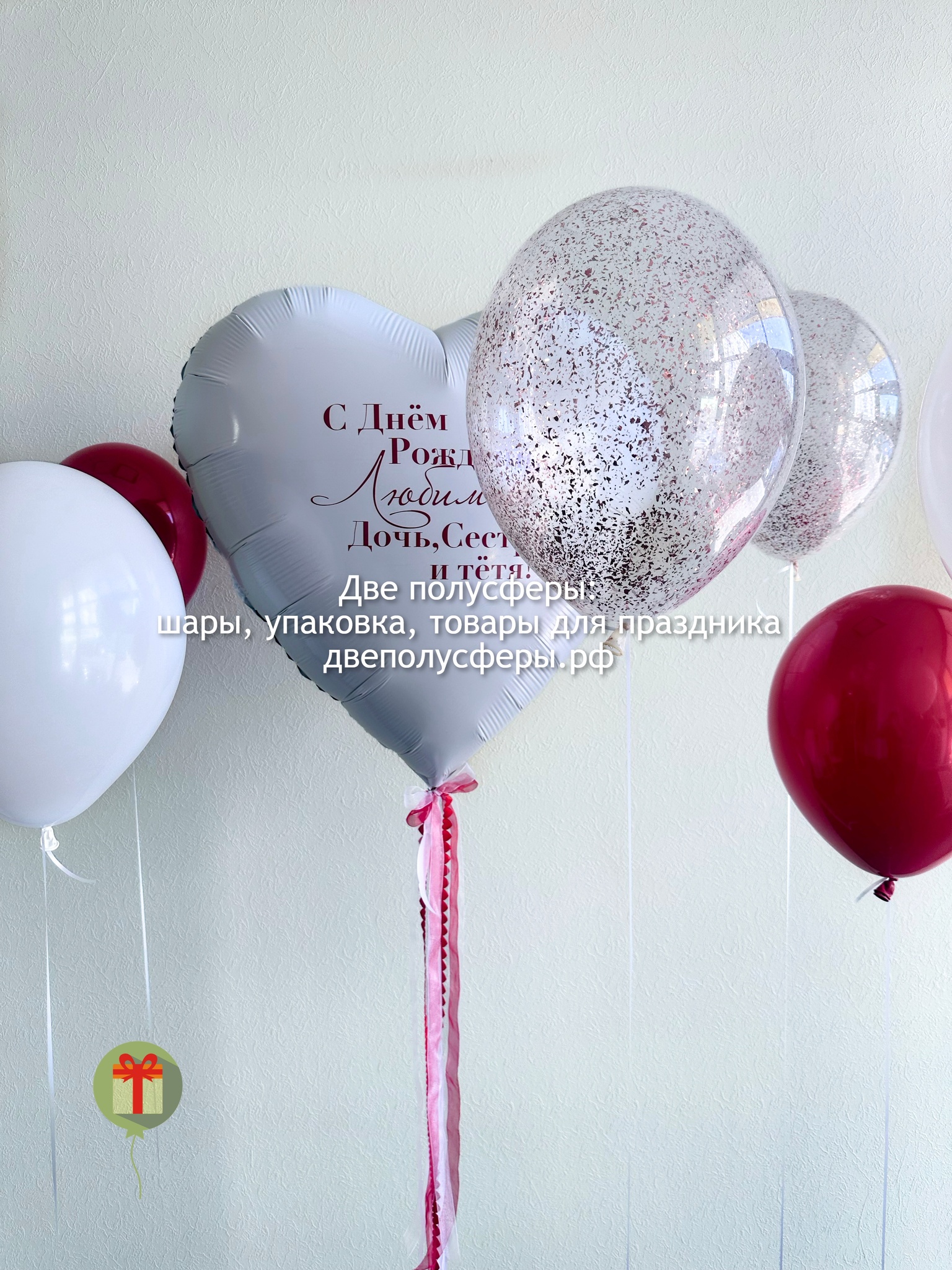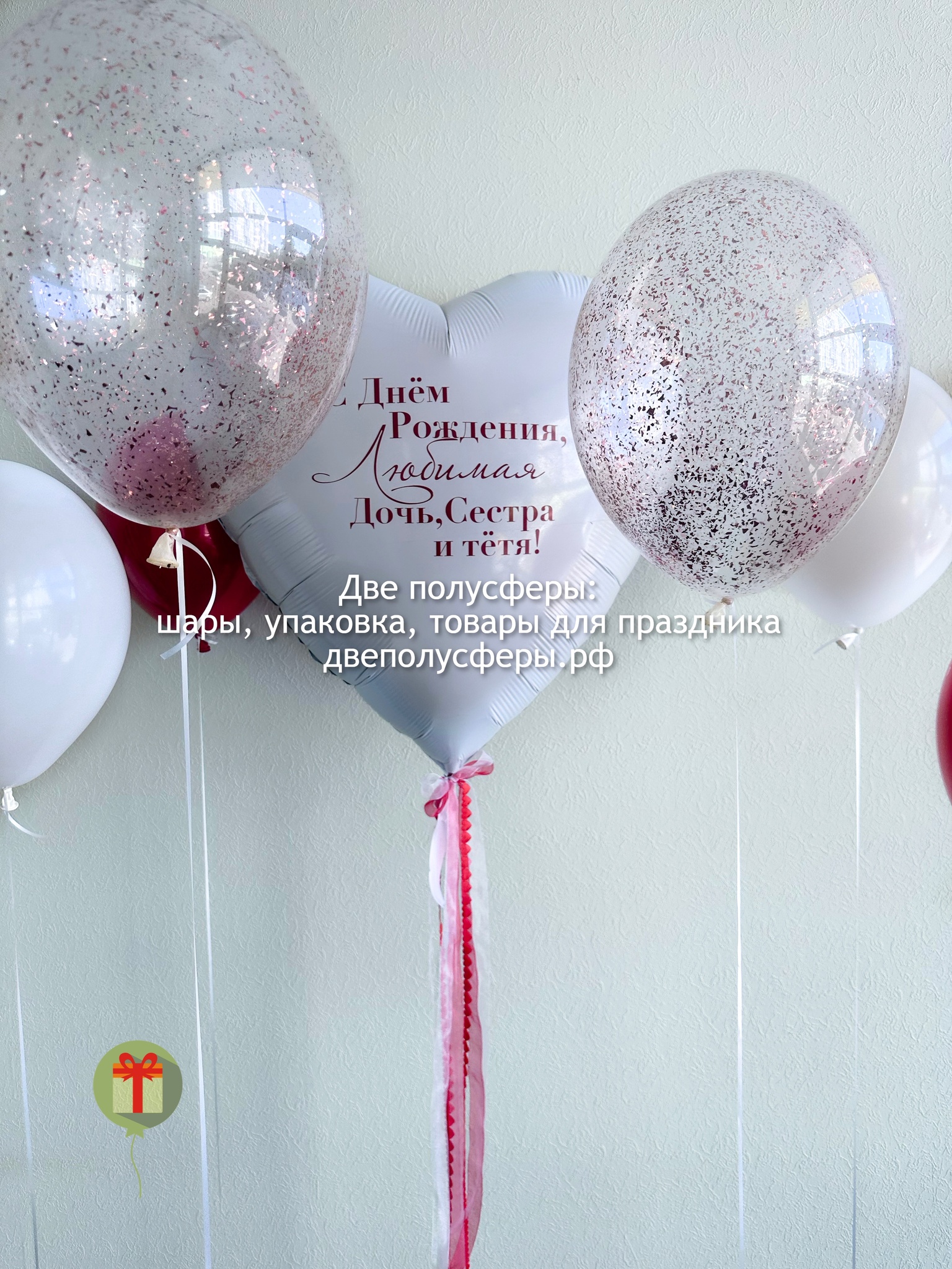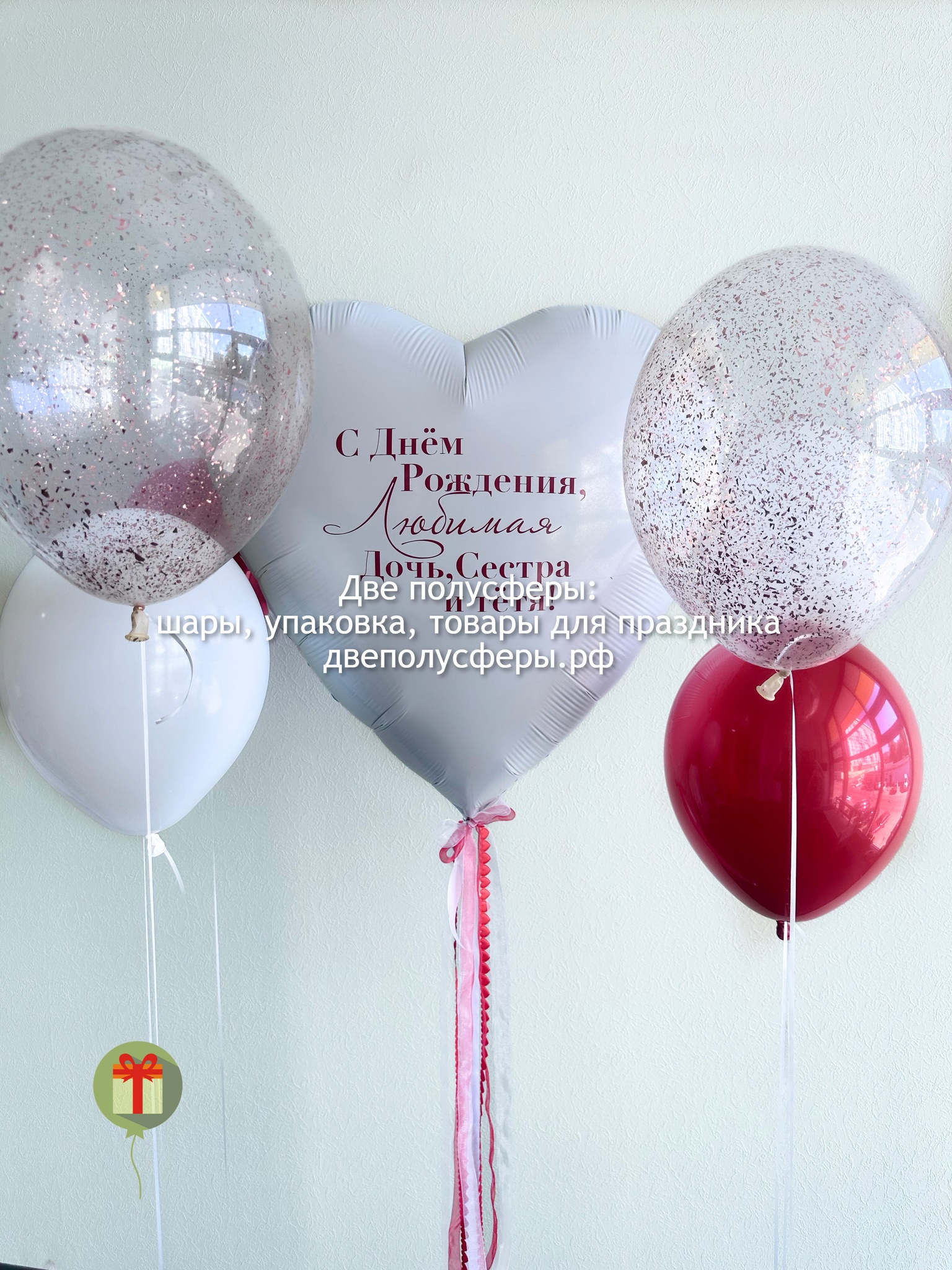 Фольгированное сердце 60 см+ надпись, 2 шара с конфетти, 2 шара хром и 2 шара пастель на индивидуальных грузах. Грузики и пакеты включены в стоимость.