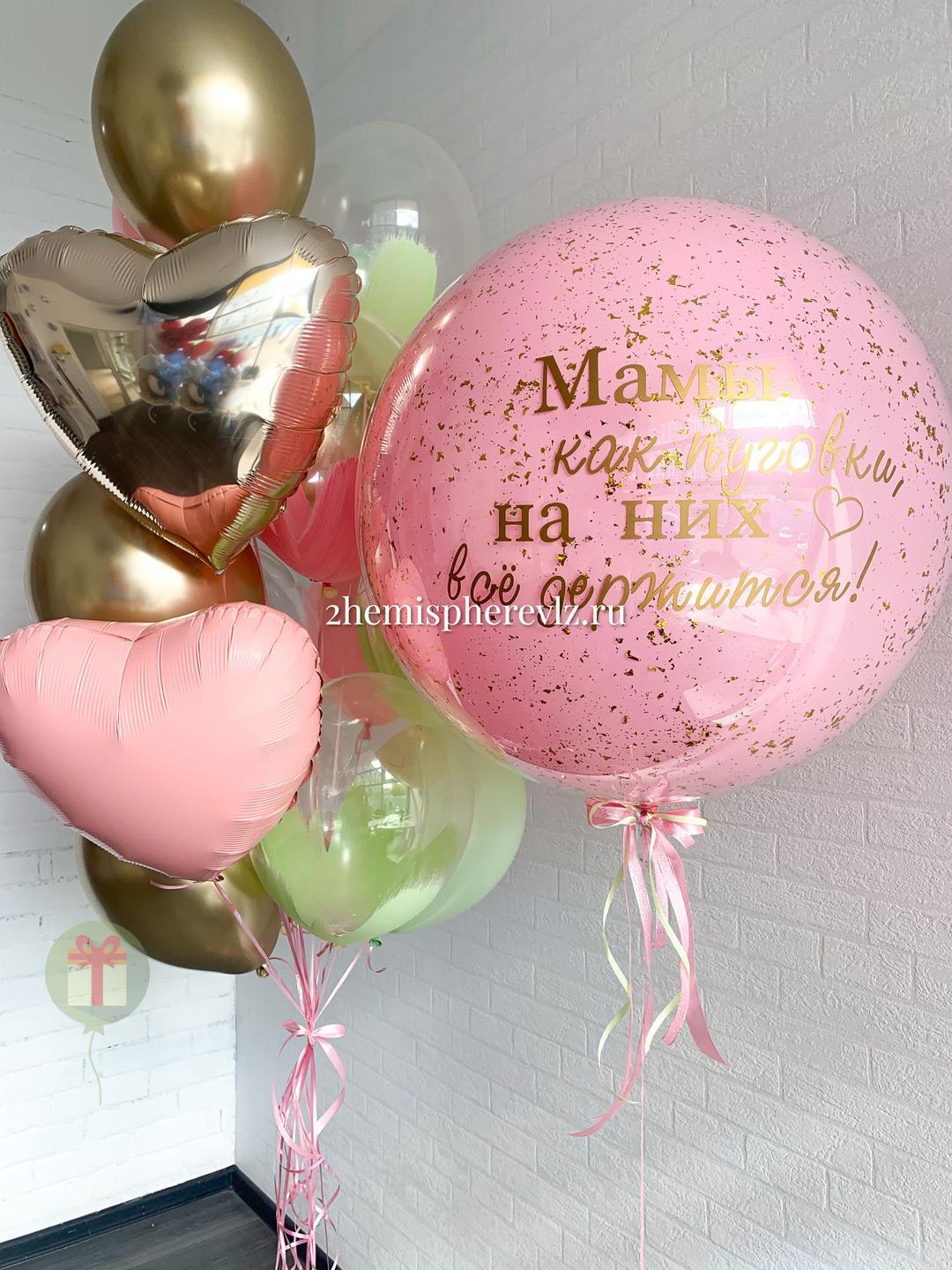 Мамы как пуговки, на них все держится! Это точно! Подарите такой набор вашей маме и она точно будет в восторге! В наборе: сфера дабл бабл 60 см с надписью, фонтан из 10 шаров (2 фольгированных сердца, 3 шара хром 35 см, 3 шара браш 35 см, 2 шара пастель 35 см). Грузики и пакеты включены в стоимость
