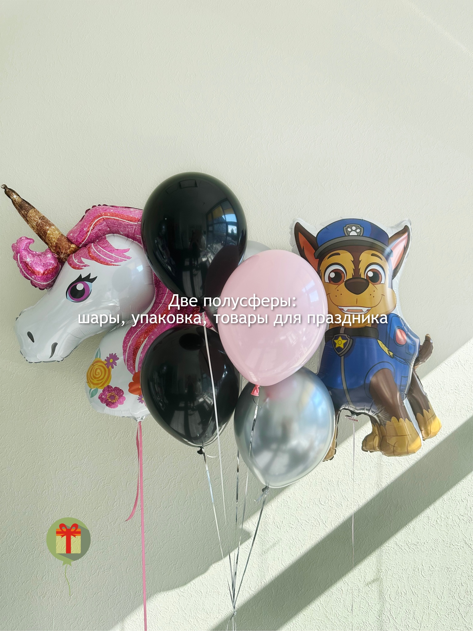 Набор шаров для деток с двумя фольгированными фигурками и фонтаном из 5 шаров, 2 шара хром и 3 шара пастель, грузик и пакет входят в стоимость.