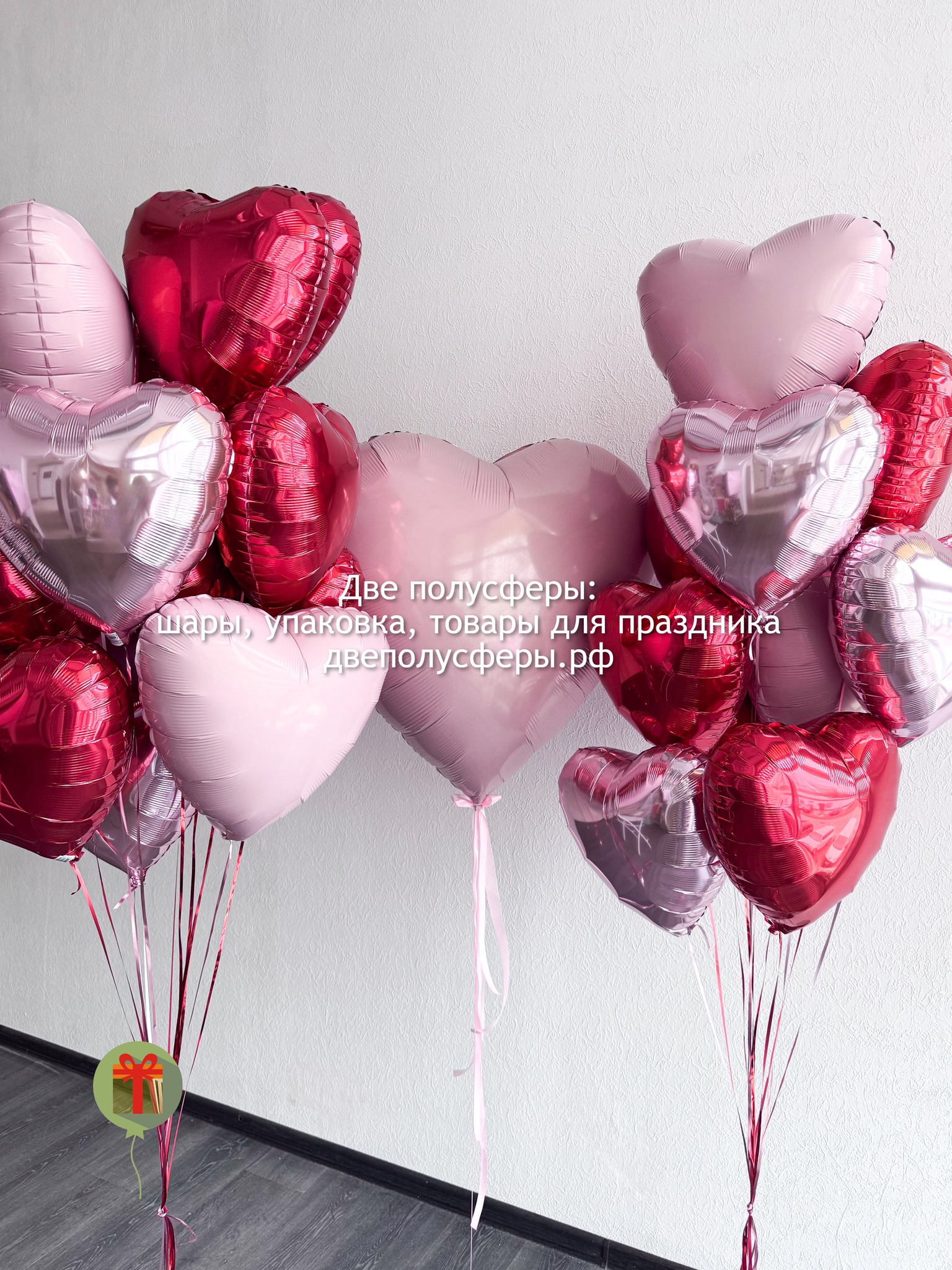 Большой шар с большим сердцем 60 см и двумя фонтанами по 10 фольгированных сердец 45см, грузики и пакеты входят в стоимость.