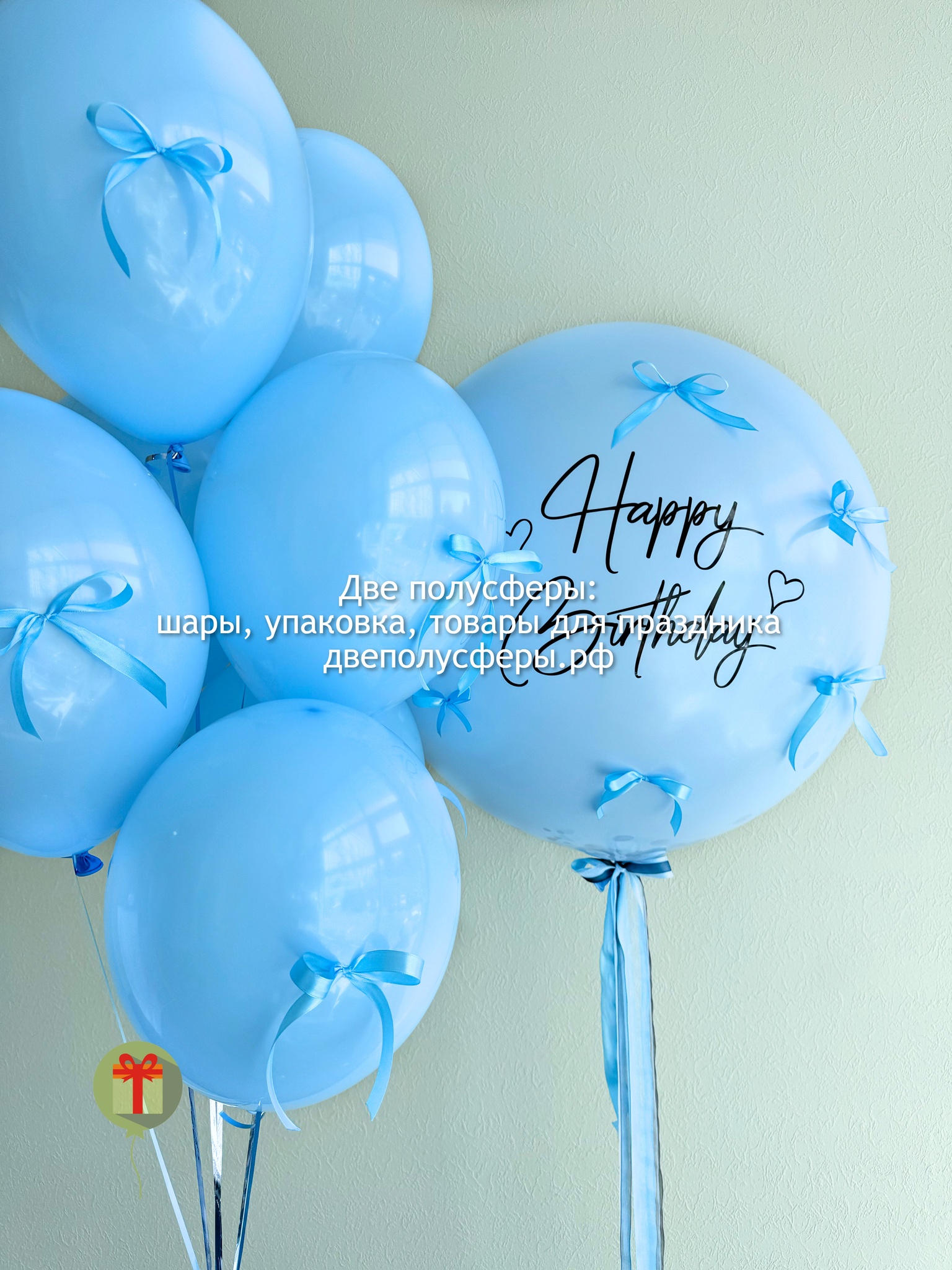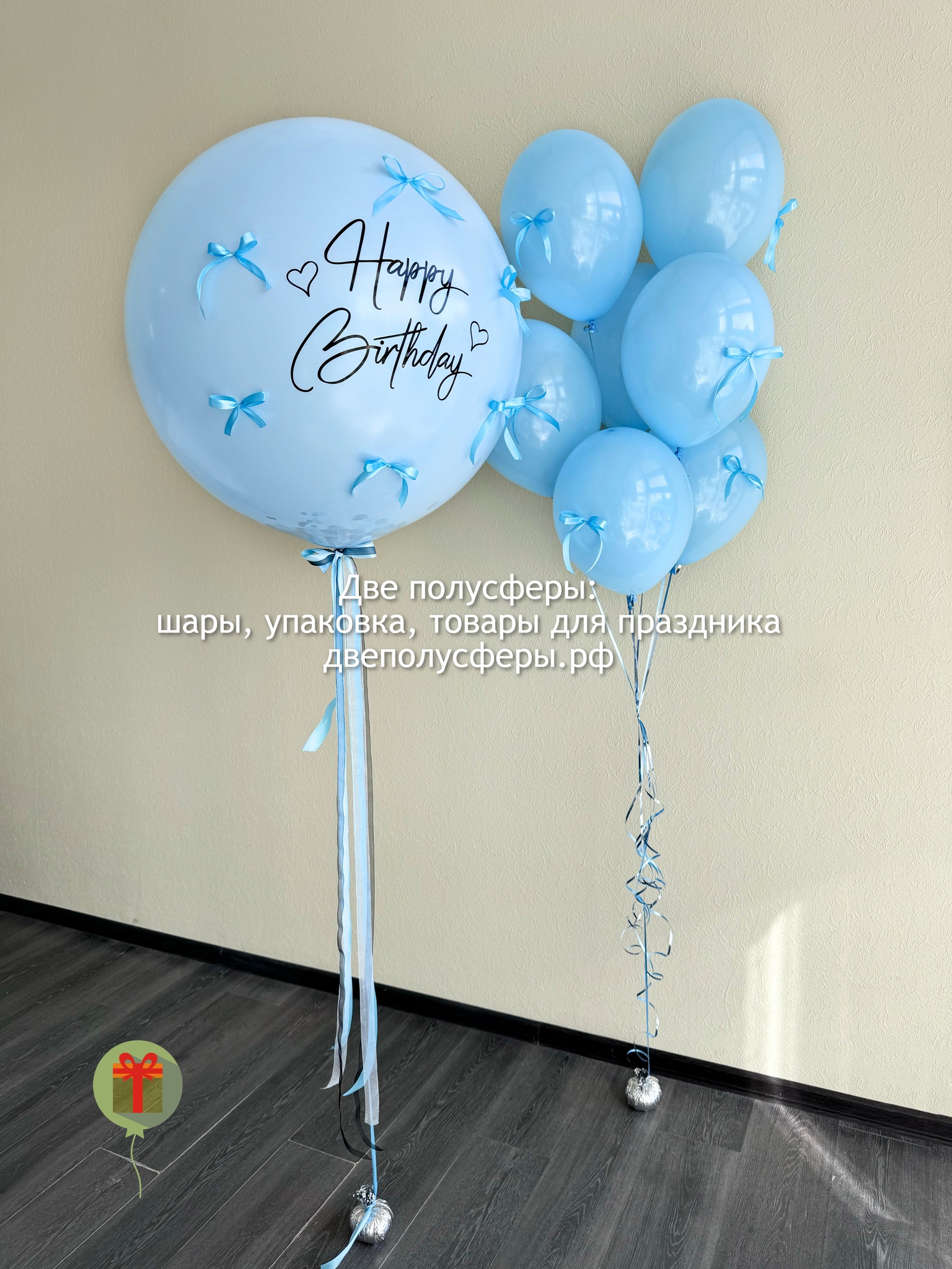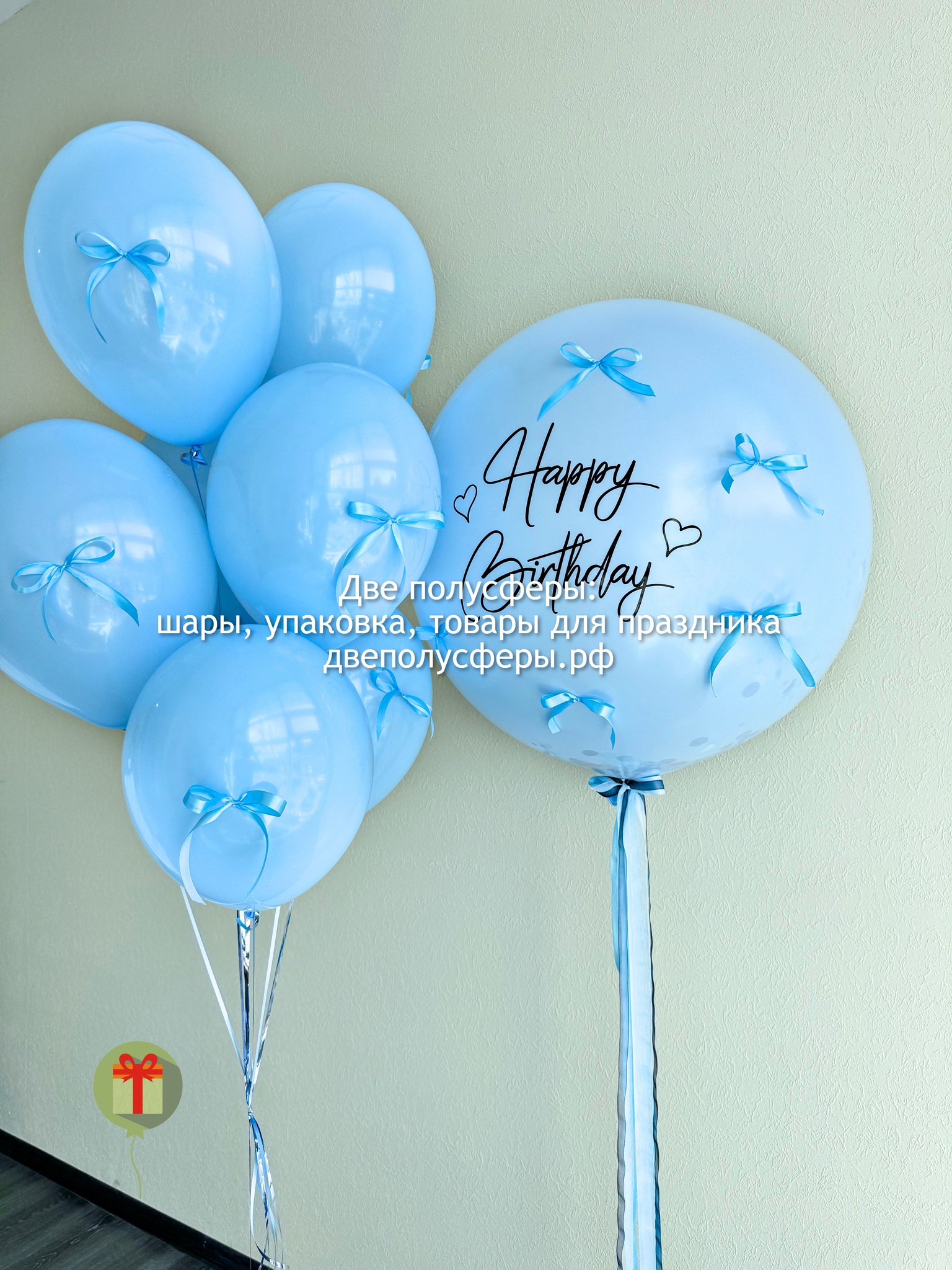 Нежный фонтан из 7 шаров пастель, декорированных бантиками и латексный шар 60 см с надписью, декорированный бантиками. Грузики и пакеты включены в стоимость.