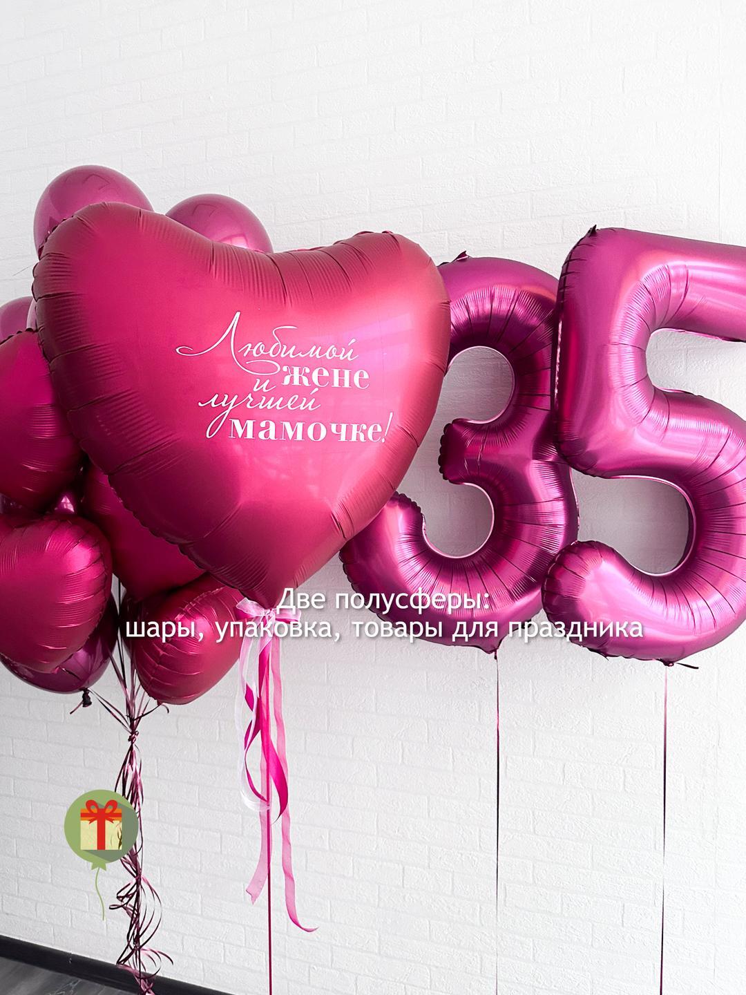 Фонтан из 15 фольгированных шаров 45 см, 2 цифры 102 см и фольгированное сердце 80 см с надписью. Грузики и пакеты включены в стоимость.