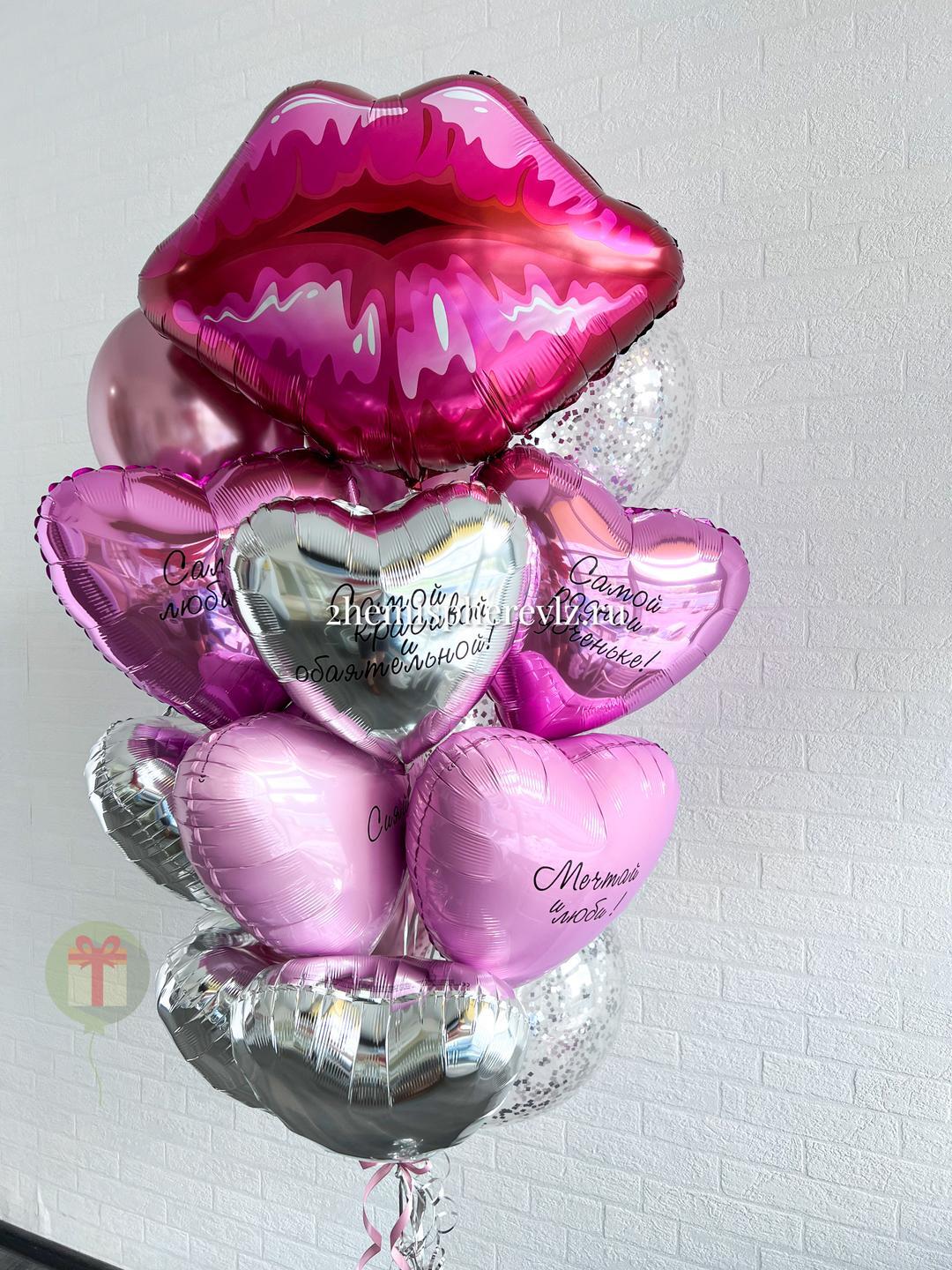Шикарный набор из 15 шаров. В составе: фольгированная фигура губы, 8 фольгированных сердец 45 см+ надписи, 3 шара хром и 3 шара с конфетти. Грузики и пакеты включены в стоимость.