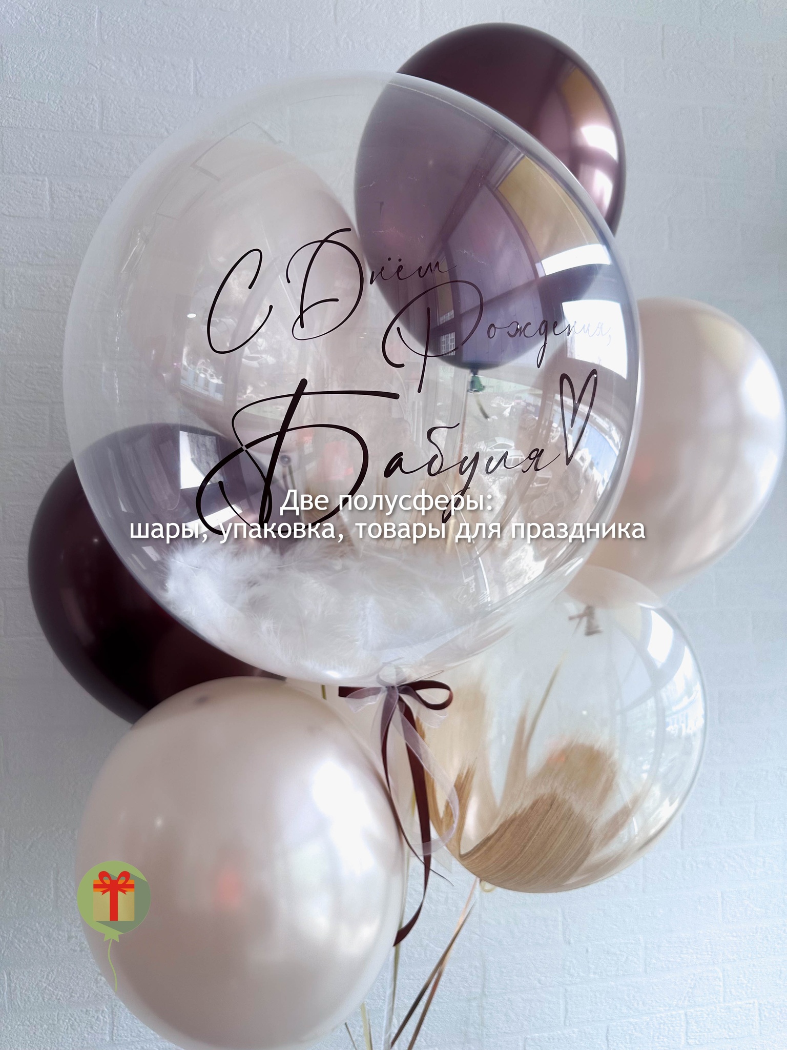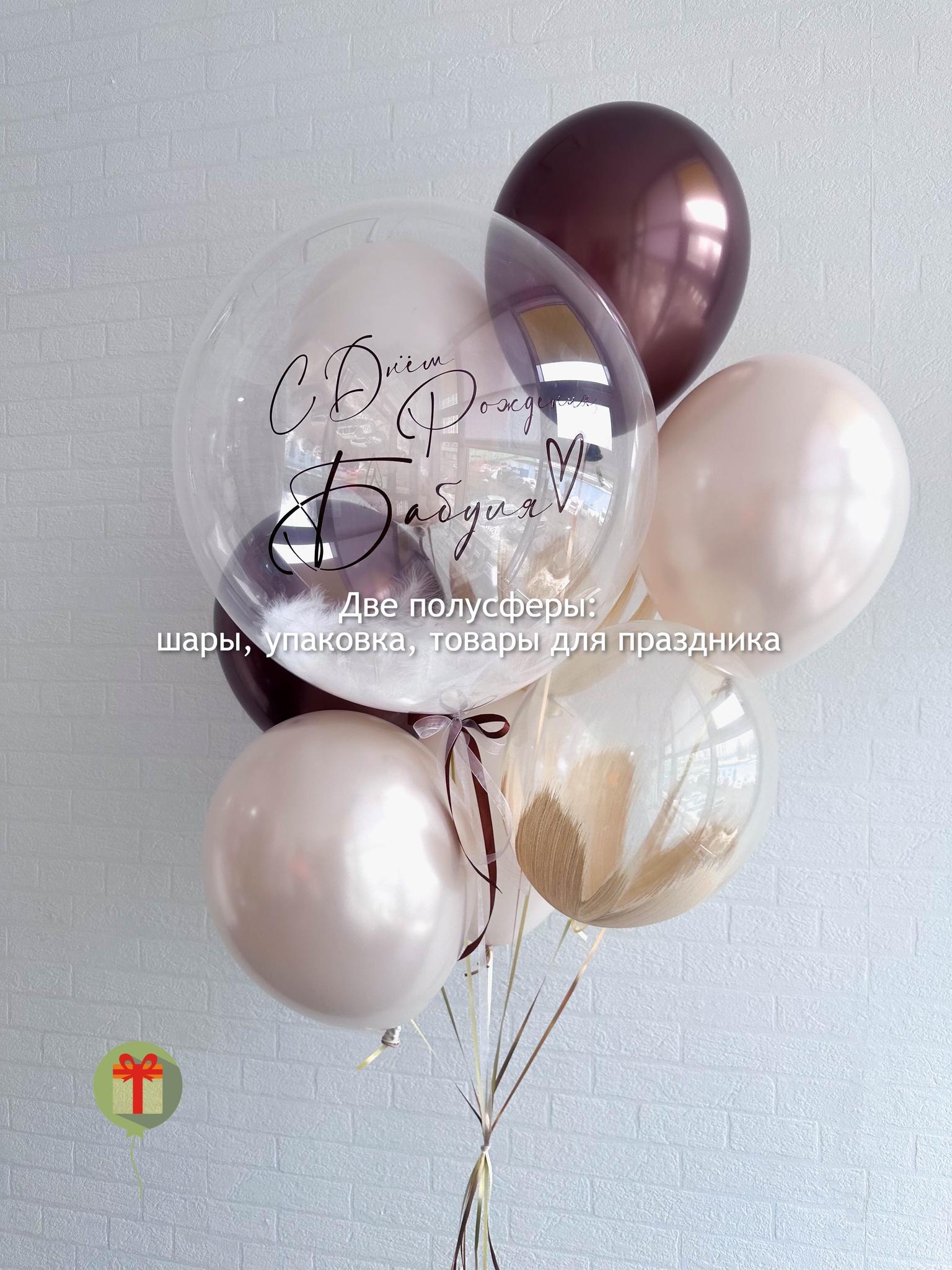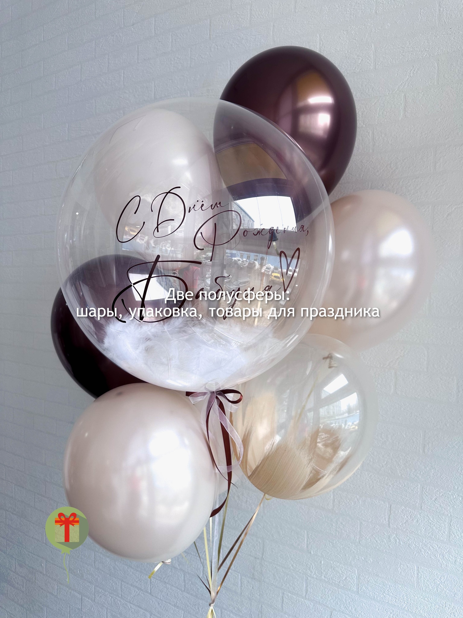 Фонтан из 9 штук: сфера 50 см с перьями+ надпись, 2 шара хром, 2 шара браш и 4 жемчужных шара. Грузики и пакеты включены в стоимость.