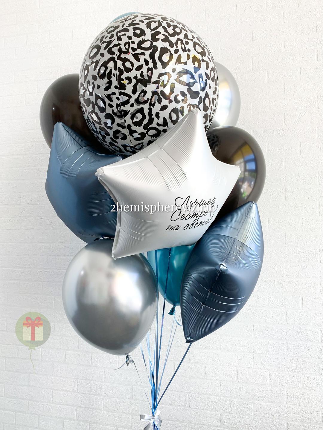 Стильный фонтан из 10 штук в сине-черных оттенках. В составе: сфера фольгированная леопард 55 см, 3 фольгированные звезды +надпись , 3 шара хром и 3 шара пастель. Грузики и пакеты включены в стоимость.