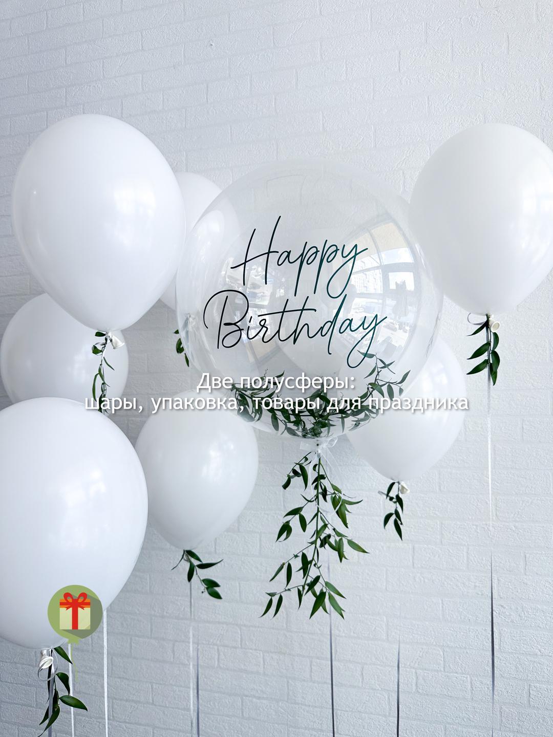 Шикарный набор шаров в белых оттенках, декорированный живыми ветками. В составе: сфера 60 см с живой зеленью+ надпись и 8 шаров пастель, декорированные живой зеленью и каждый на отдельном грузе. Грузики и пакеты включены в стоимость.