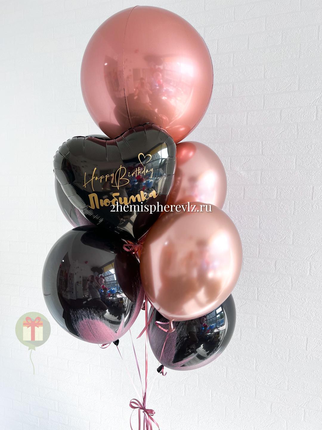 Фонтан из 8 штук в оттенках черного и розового золота, в составе: сфера фольгированная 55 см, сердце фольга 45см +надпись, 3 шара хром и 3 двойных шара браш. Грузики и пакеты включены в стоимость.