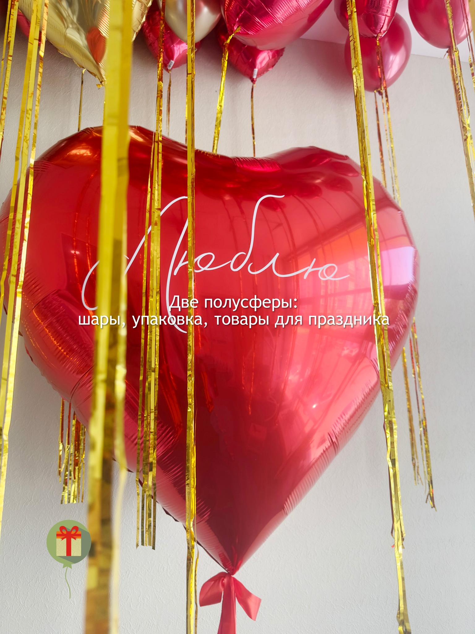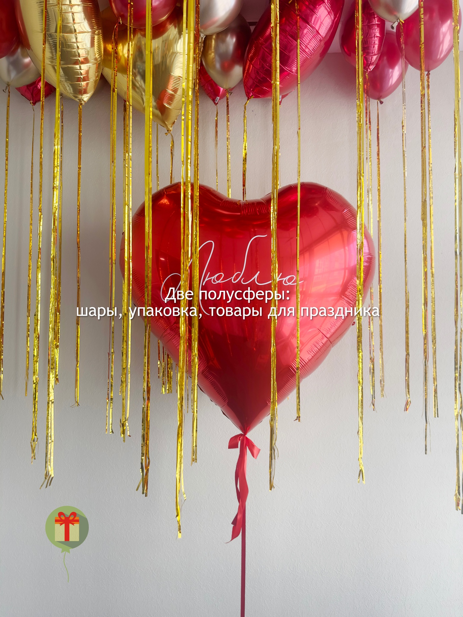 30 шаров под потолок: 3 фольгированных сердца 60 см, 15 сердец 45 см и 12 шаров хром; а так же фольгированное сердце 80  см+ надпись. Грузики и пакеты включены в стоимость.