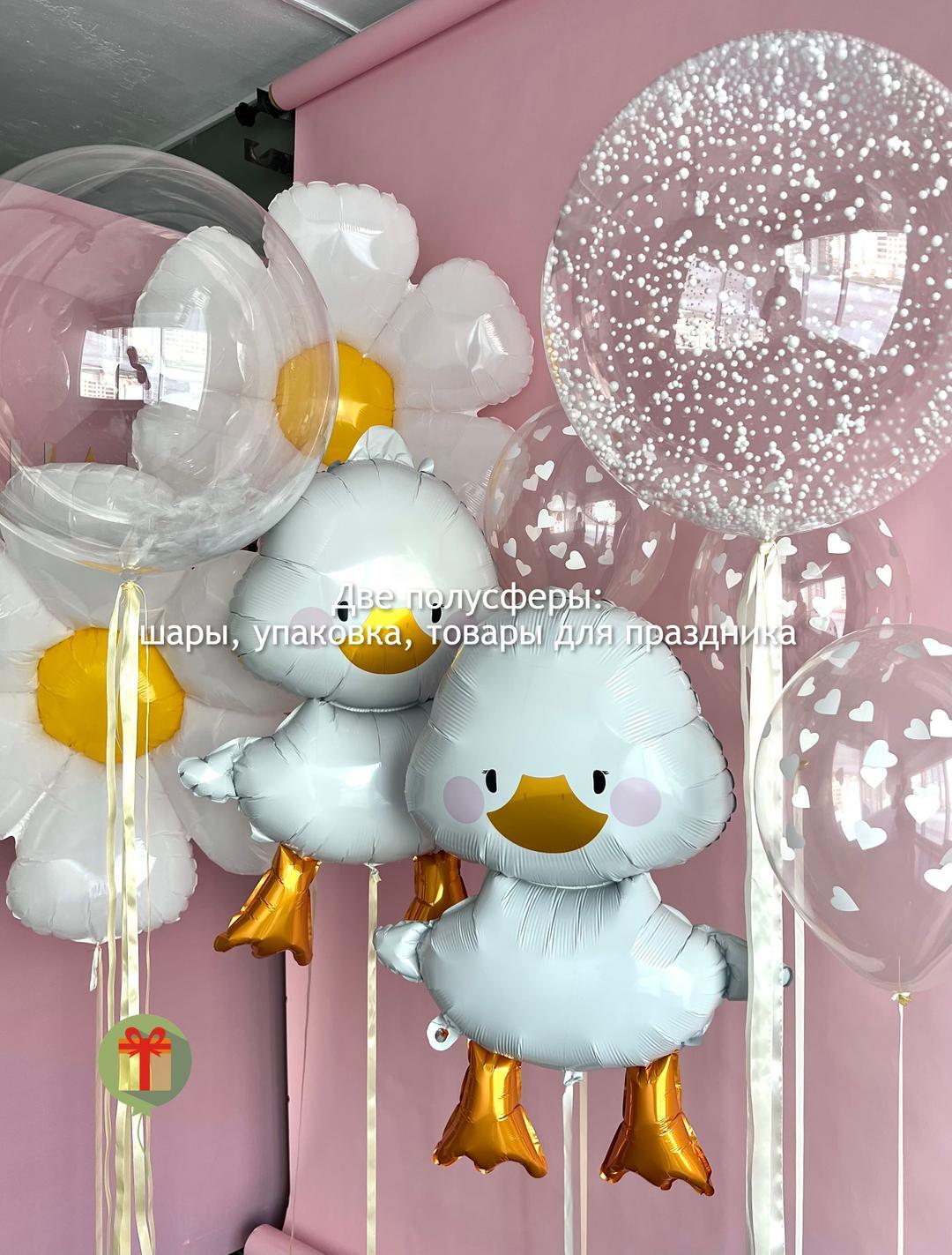Сфера 60 см с перьями, сфера 60 см с пенопластом, 2 ромашки, 2 уточки и 3 шара с рисунком 35 см. Грузики и пакеты включены в стоимость.
