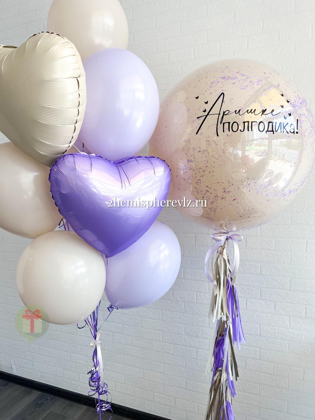Сфера дабл бабл 60 см с конфетти+ надпись, декорированная пышным хвостом и фонтан из 10 штук: 2 фольгированных шара 45 см и 8 шаров пастель. Грузики и пакеты включены в стоимость.