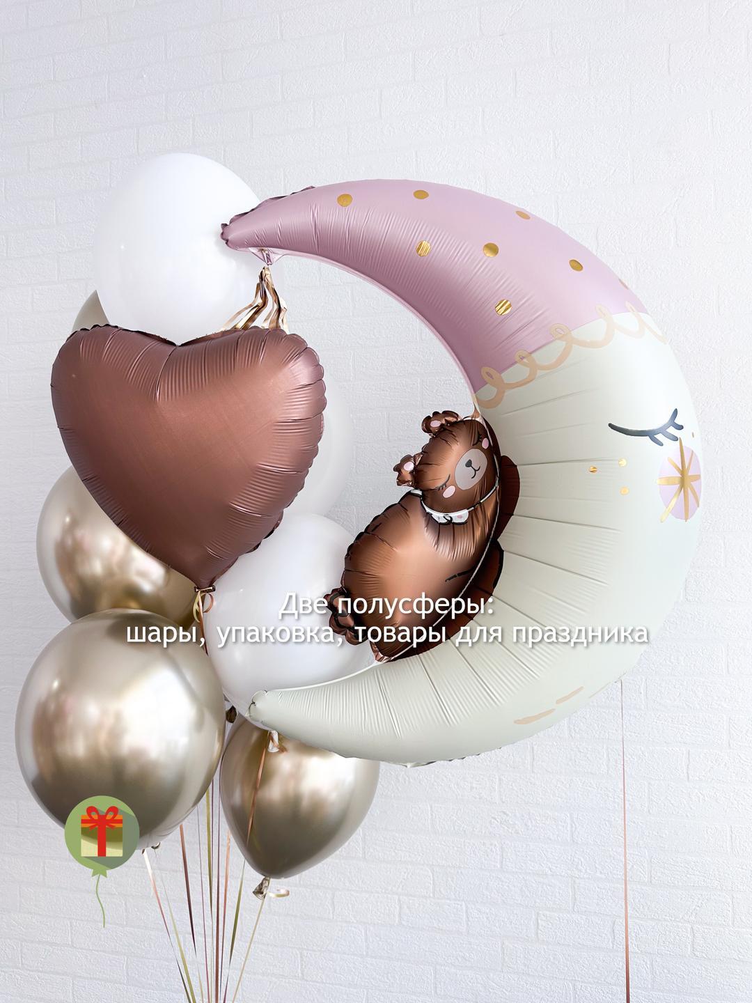 Фольгированная фигурка мишка на луне и фонтан из 10 шаров: фольгированное сердце 45 см, 4 шара хром и 5 шаров пастель. Грузики и пакеты включены в стоимость.