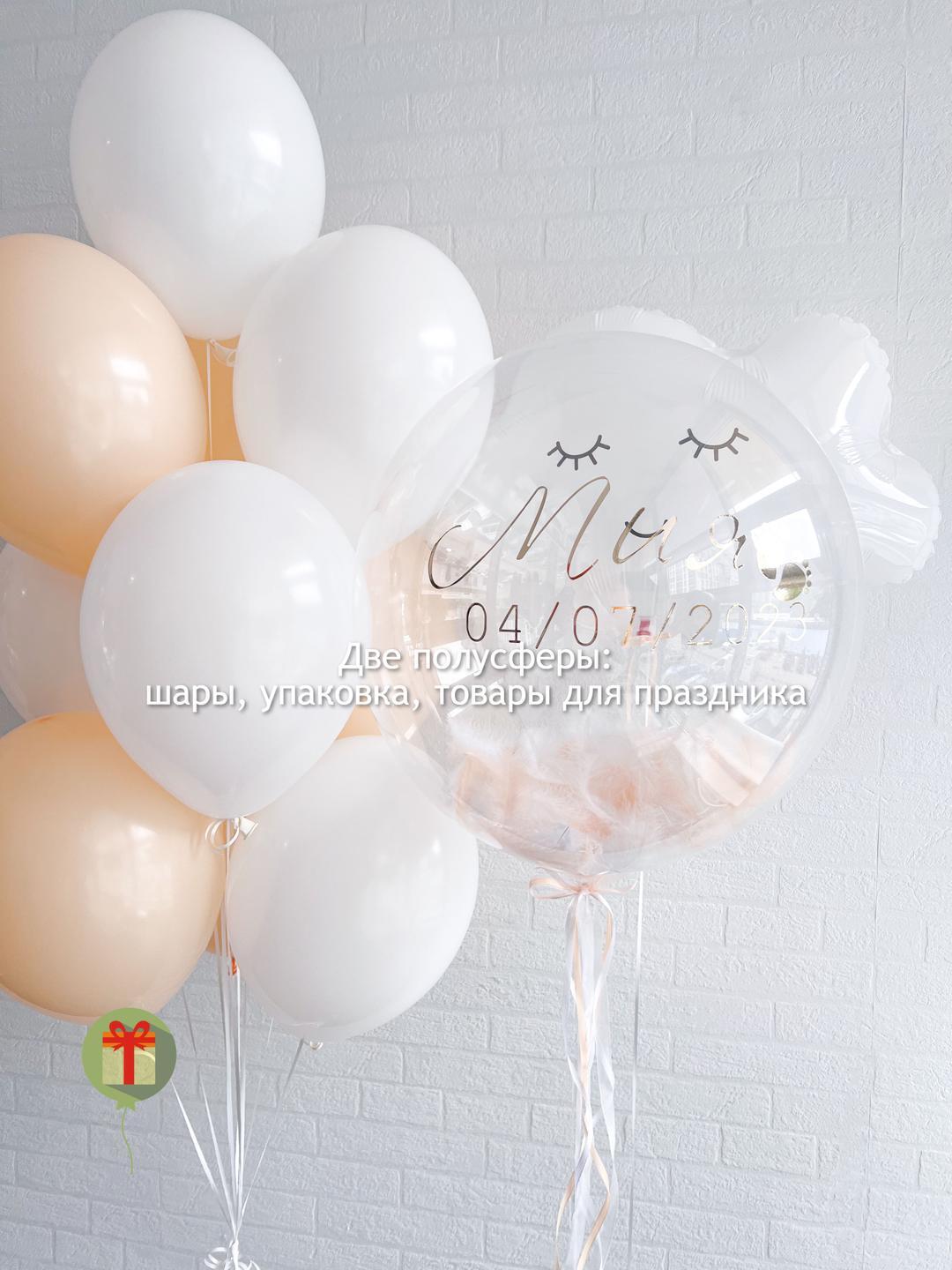 Нежный набор в персиково-белых оттенках. В составе: фонтан из 10 шаров пастель, фигура облачка и сфера 60 см с перьями и индивидуальной надписью. Грузики и пакеты включены в стоимость.