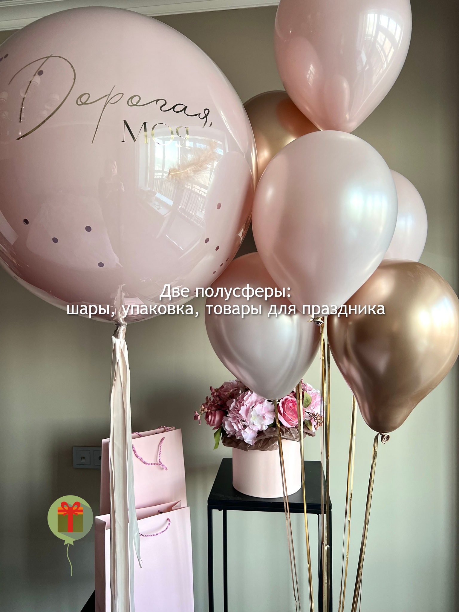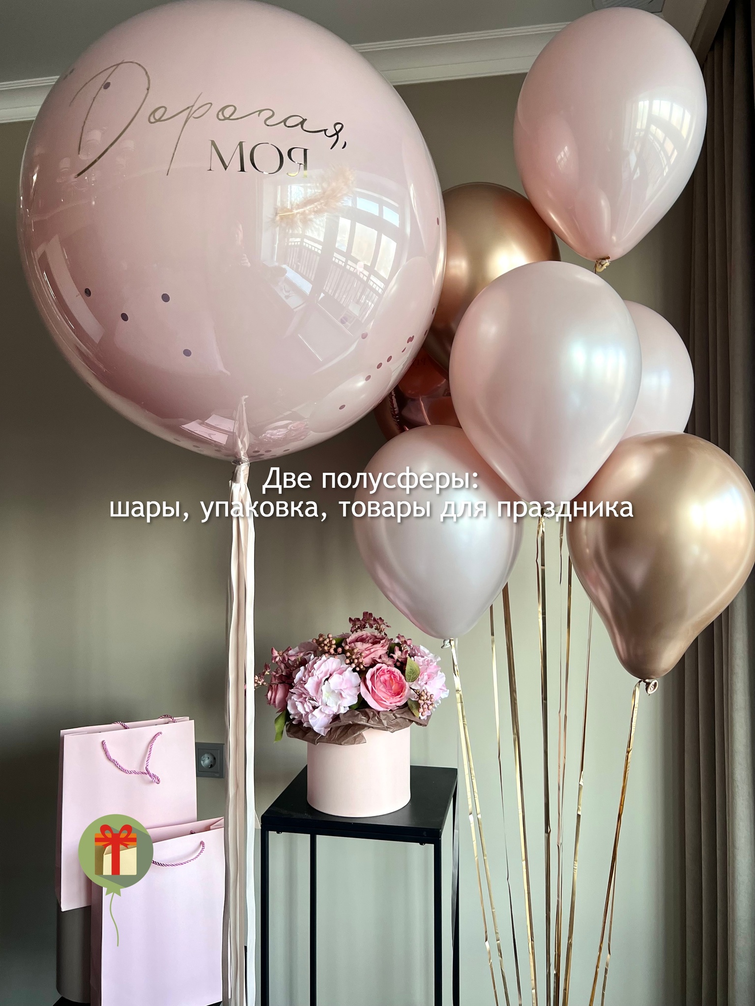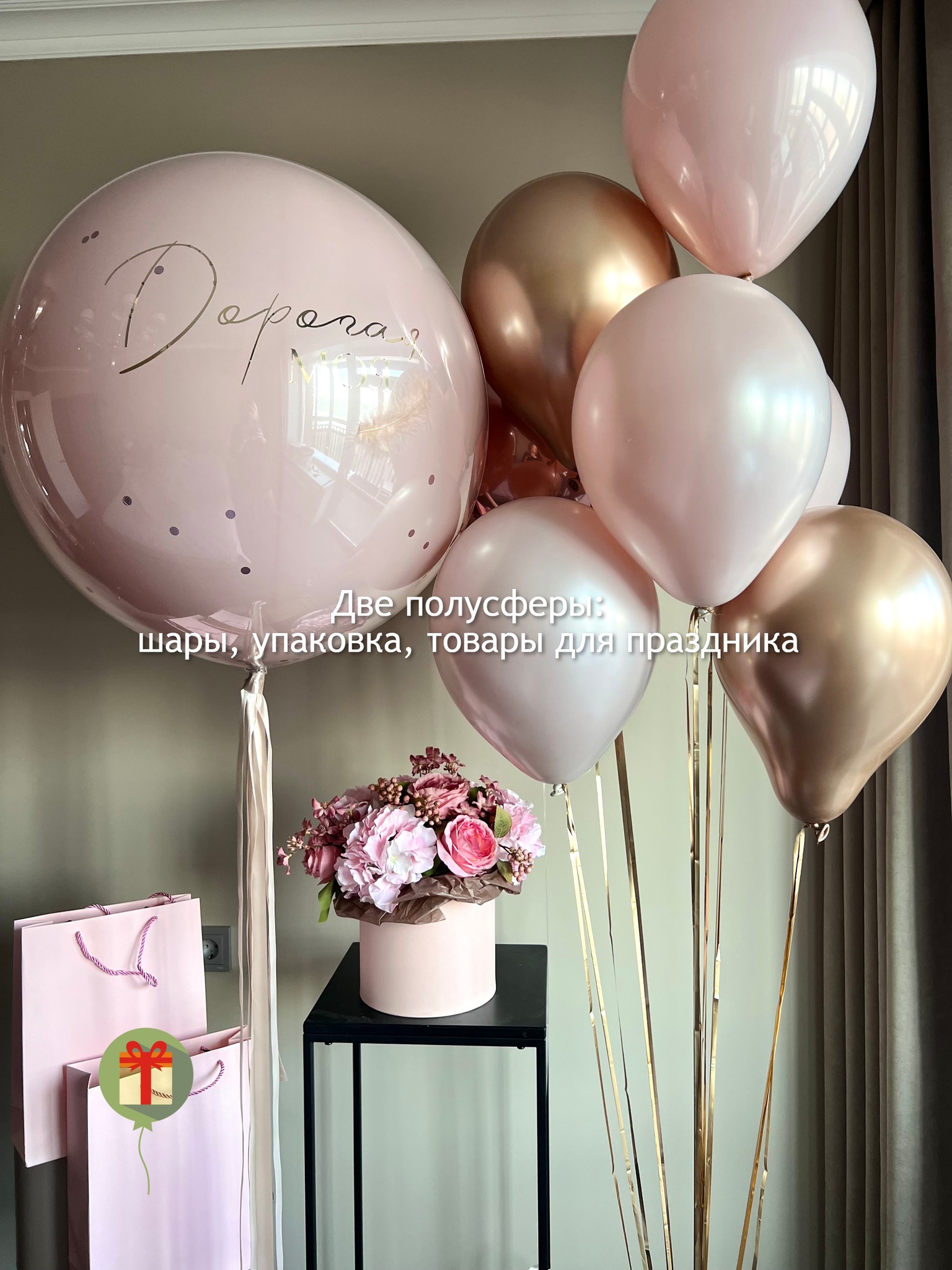 Фонтан из 7 штук: сфера фольгированная 50 см, 2 шара хром и 4 шара пастель; сфера дабл бабл 60 см с конфетти+ наклейка. Грузики и пакеты включены в стоимость.