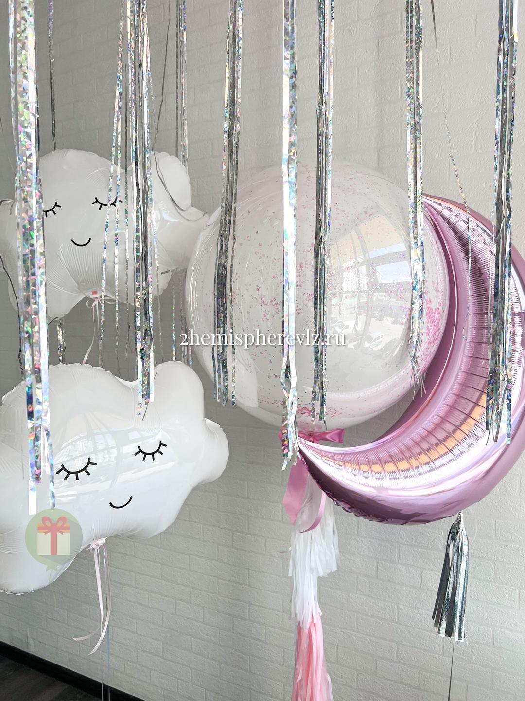 Нежные шары порадуют вас и ваших близких, большой шар дабл бабл 60 см с конфетти, декорированный пышным хвостом, нежный полумесяц и воздушные облачка не оставят равнодушными никого!!!! Грузики и пакеты включены в стоимость.