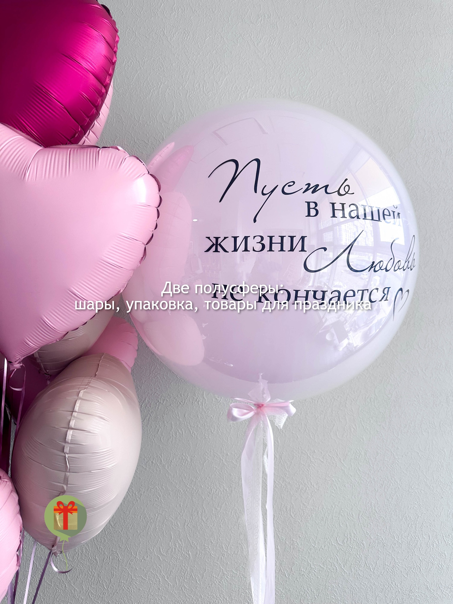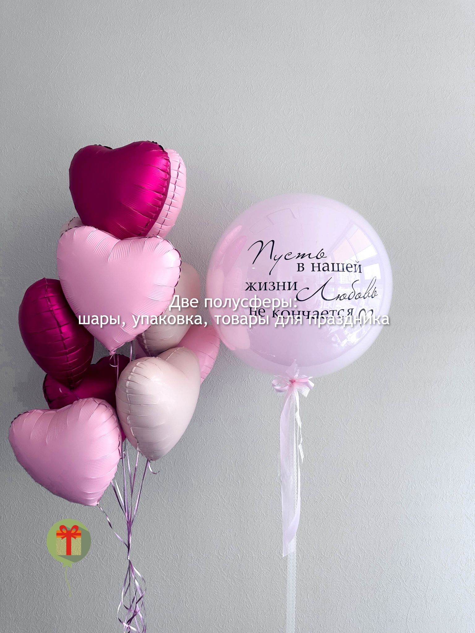 Фонтан из 10 фольгированных сердец и сфера дабл бабл 60 см+ надпись. Грузики и пакеты включены в стоимость.