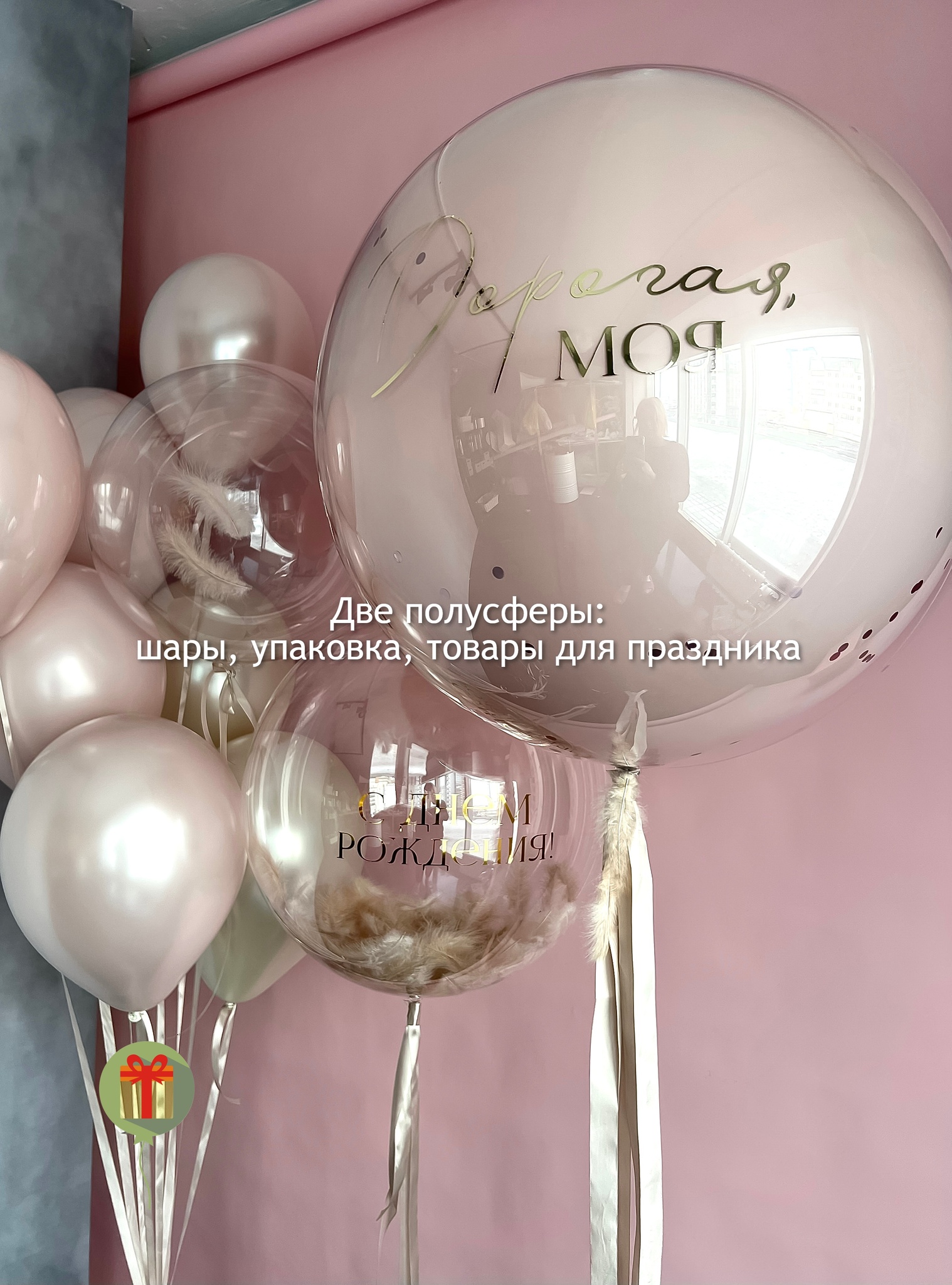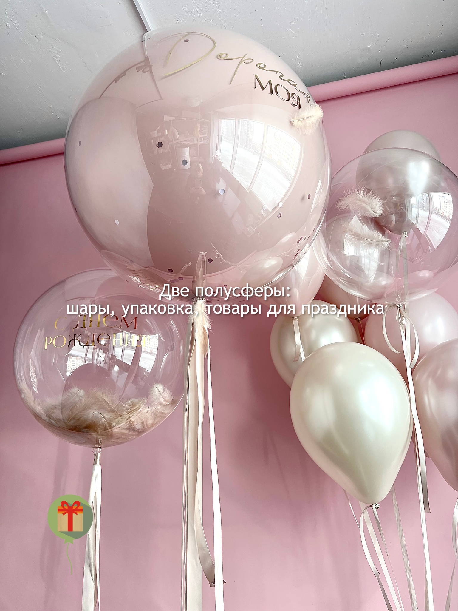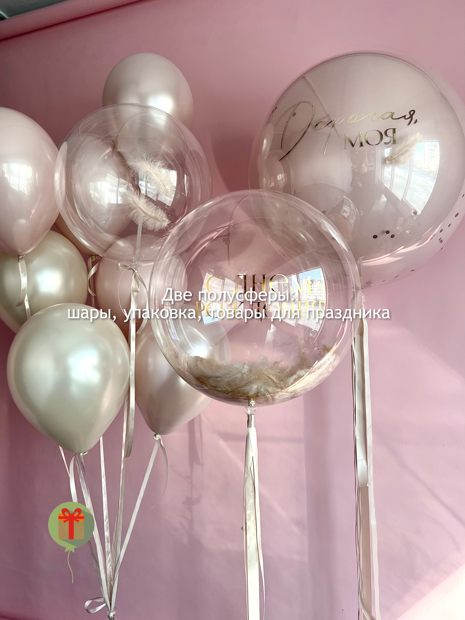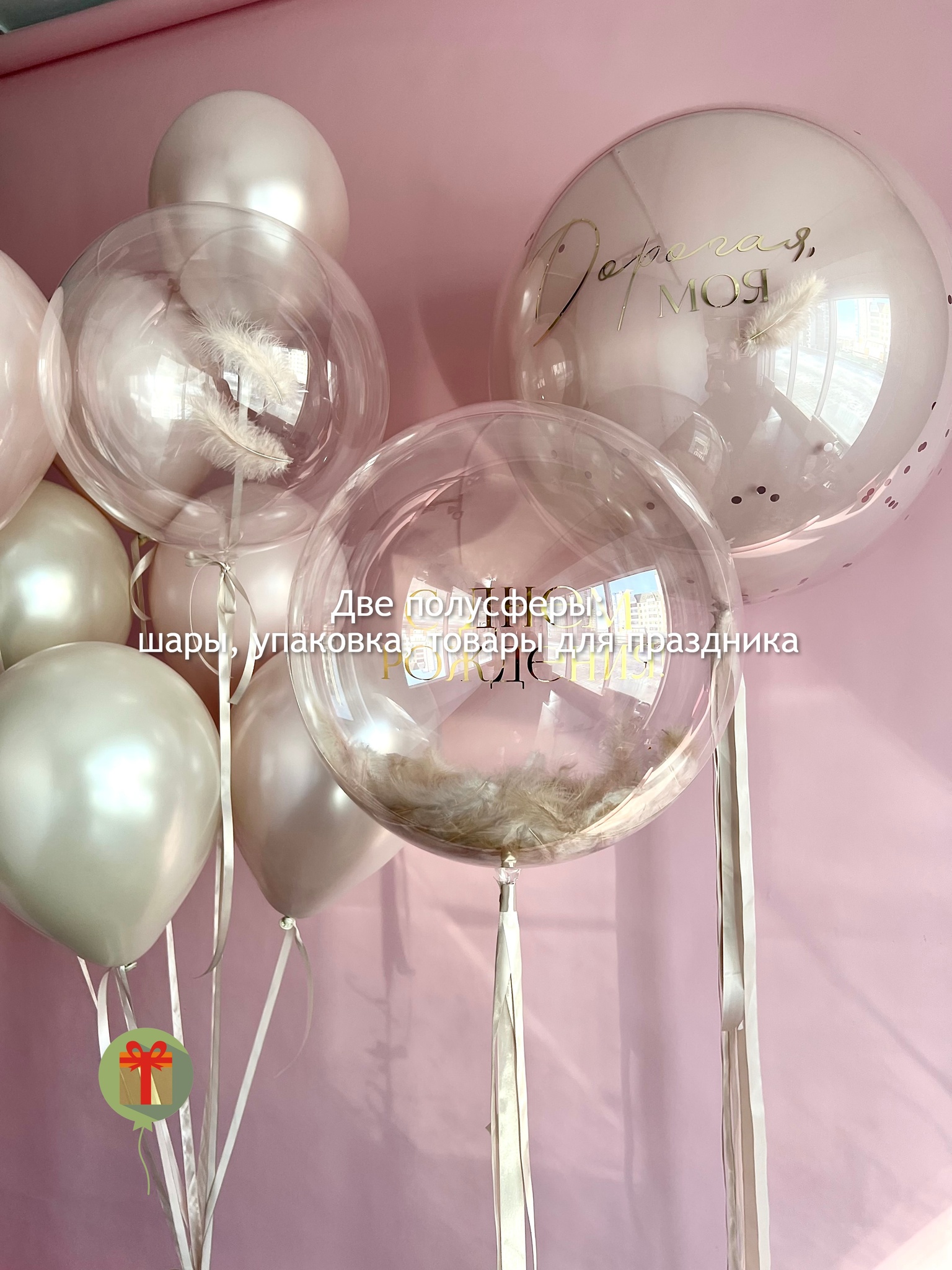 Сфера дабл бабл 60 см с конфетти+ надпись, сфера с перьями 45 см+ надпись и фонтан из 8 штук: сфера с перьями 45 см, 7 жемчужных шаров. Грузики и пакеты включены в стоимость.