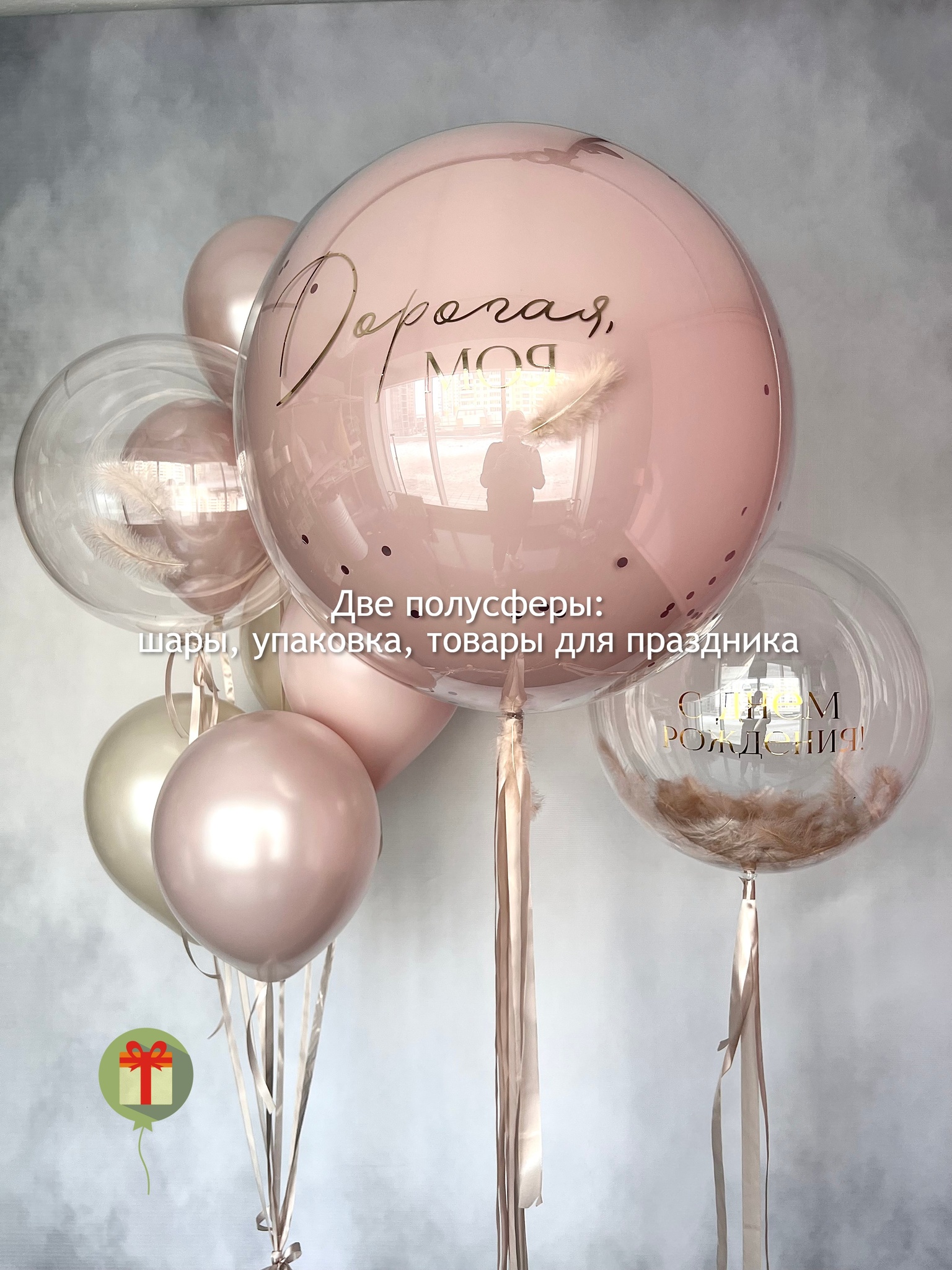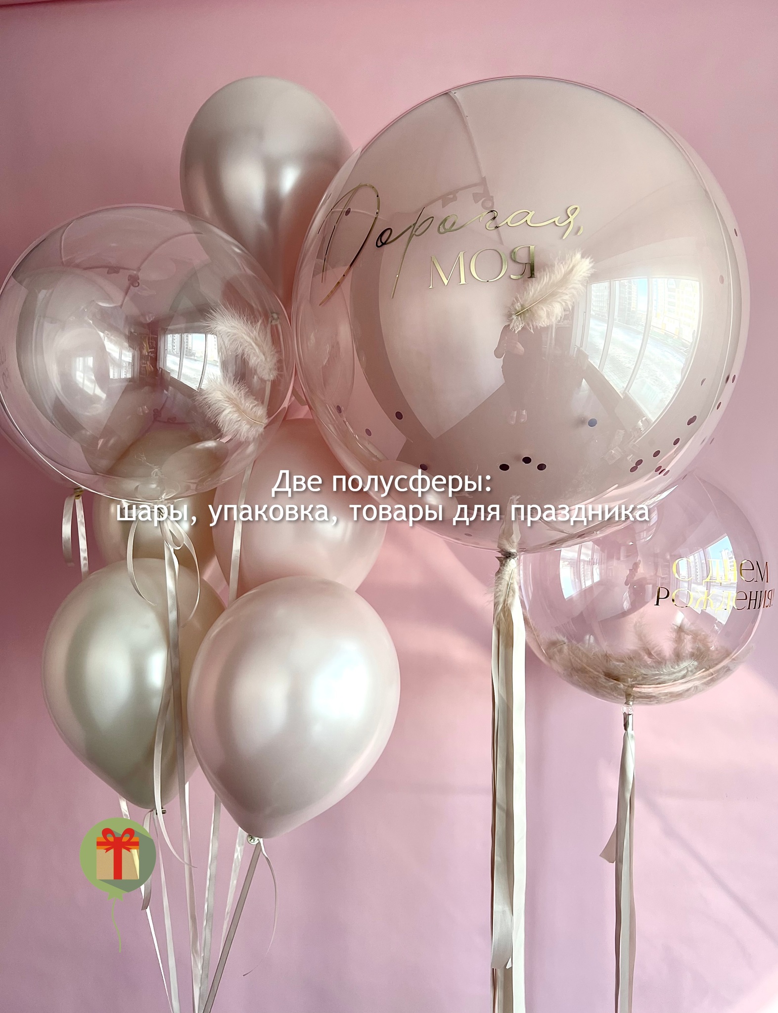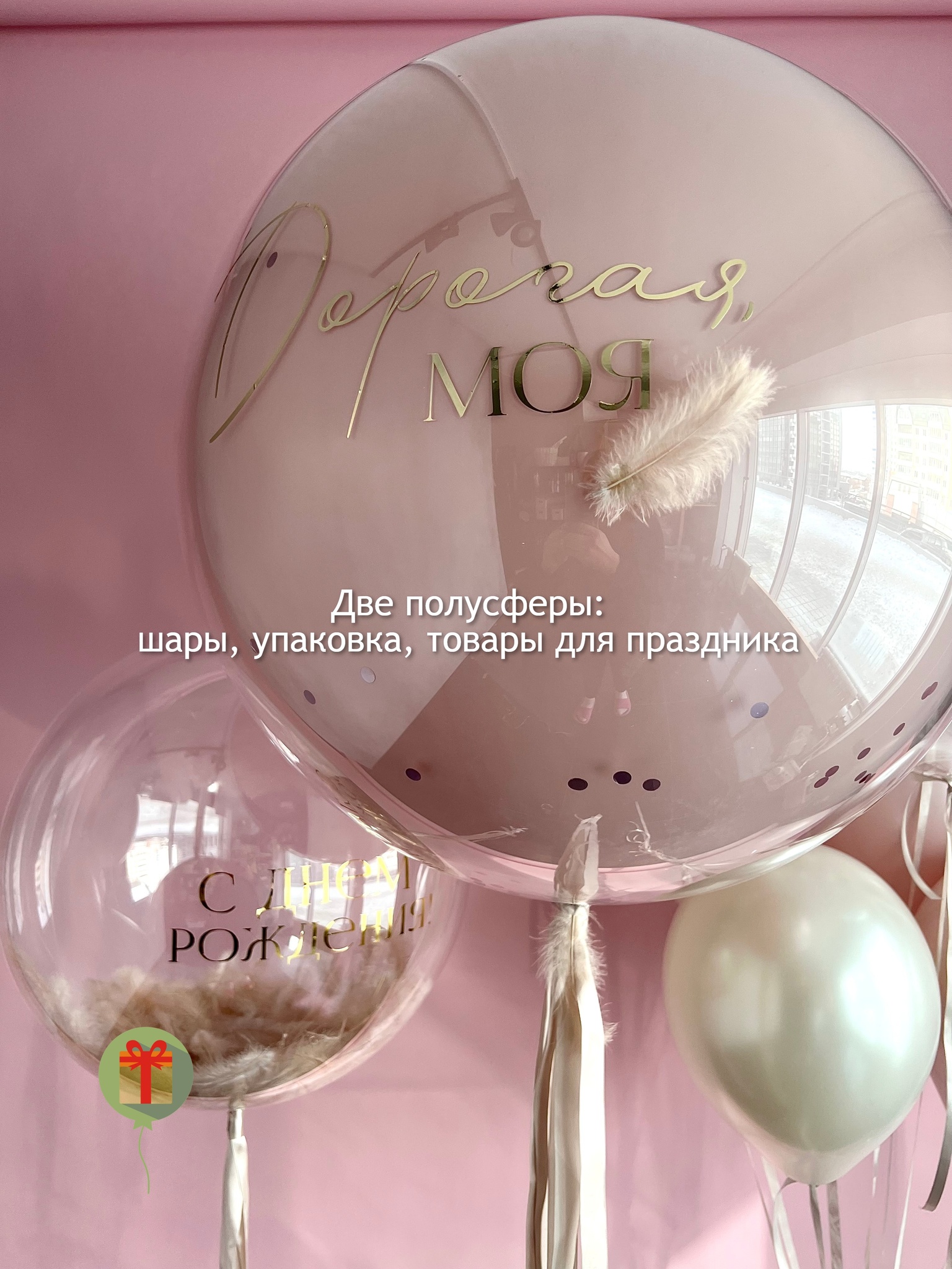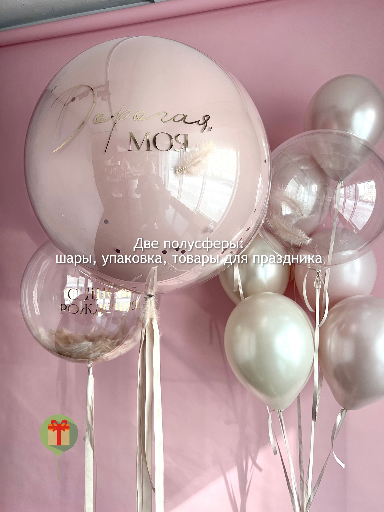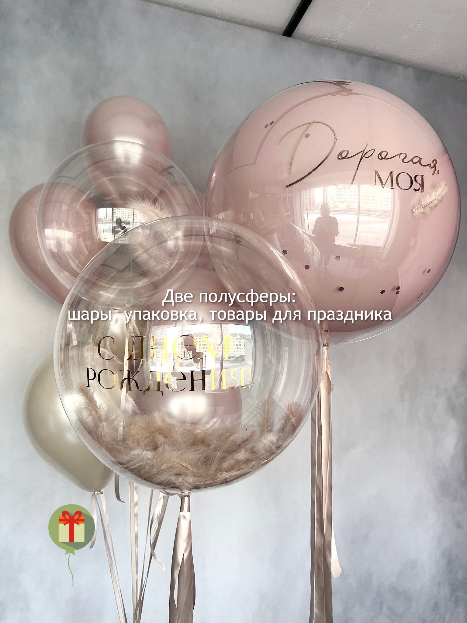 Сфера дабл бабл 60 см с конфетти+ надпись, сфера с перьями 45 см+ надпись и фонтан из 8 штук: сфера с перьями 45 см, 7 жемчужных шаров. Грузики и пакеты включены в стоимость.