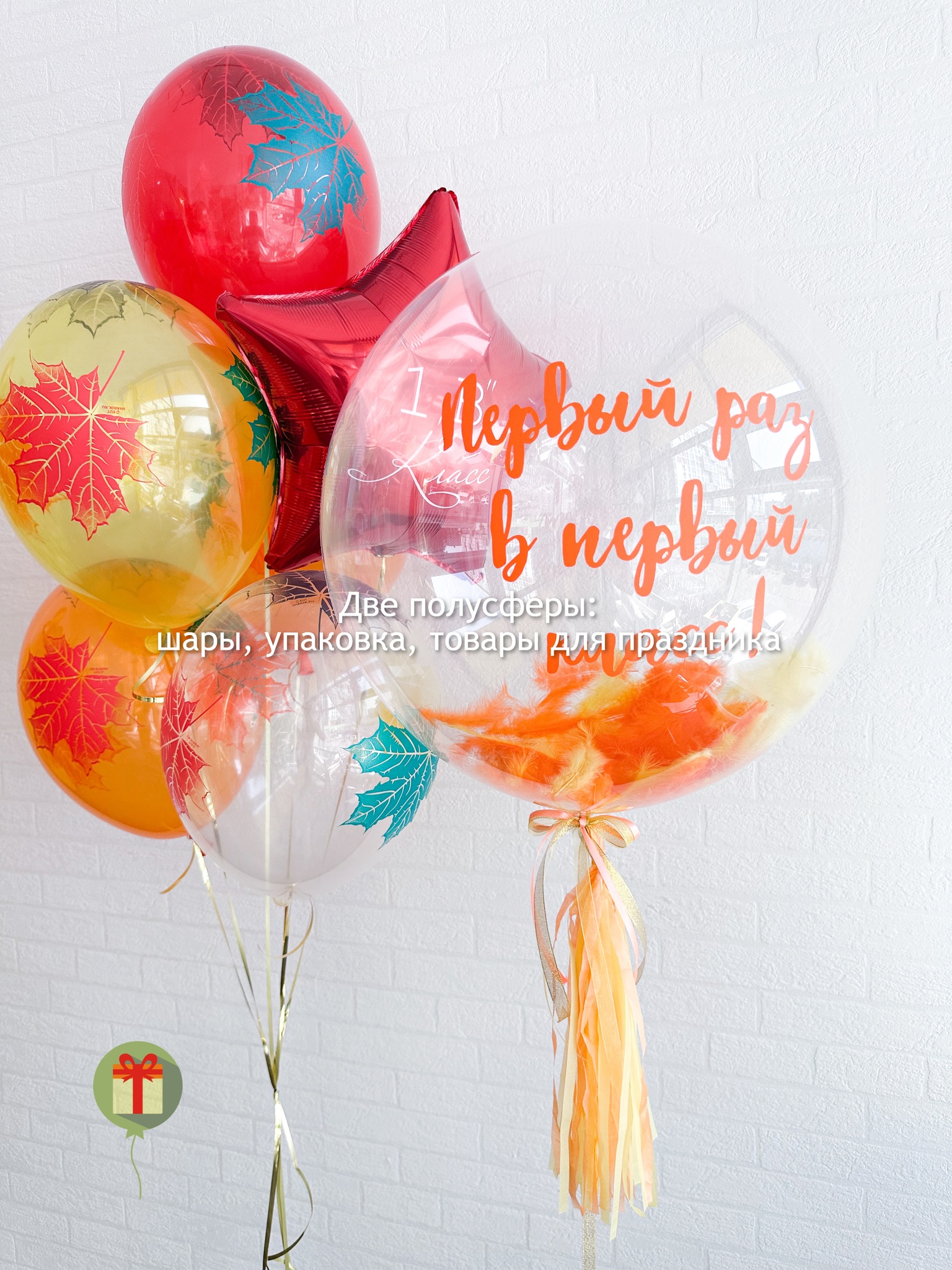 Фонтан из 7 штук: звезда 45 см и 6 шаров с рисунком; а так же сфера с перьями 60 см+ надпись. Грузики и пакеты включены в стоимость.