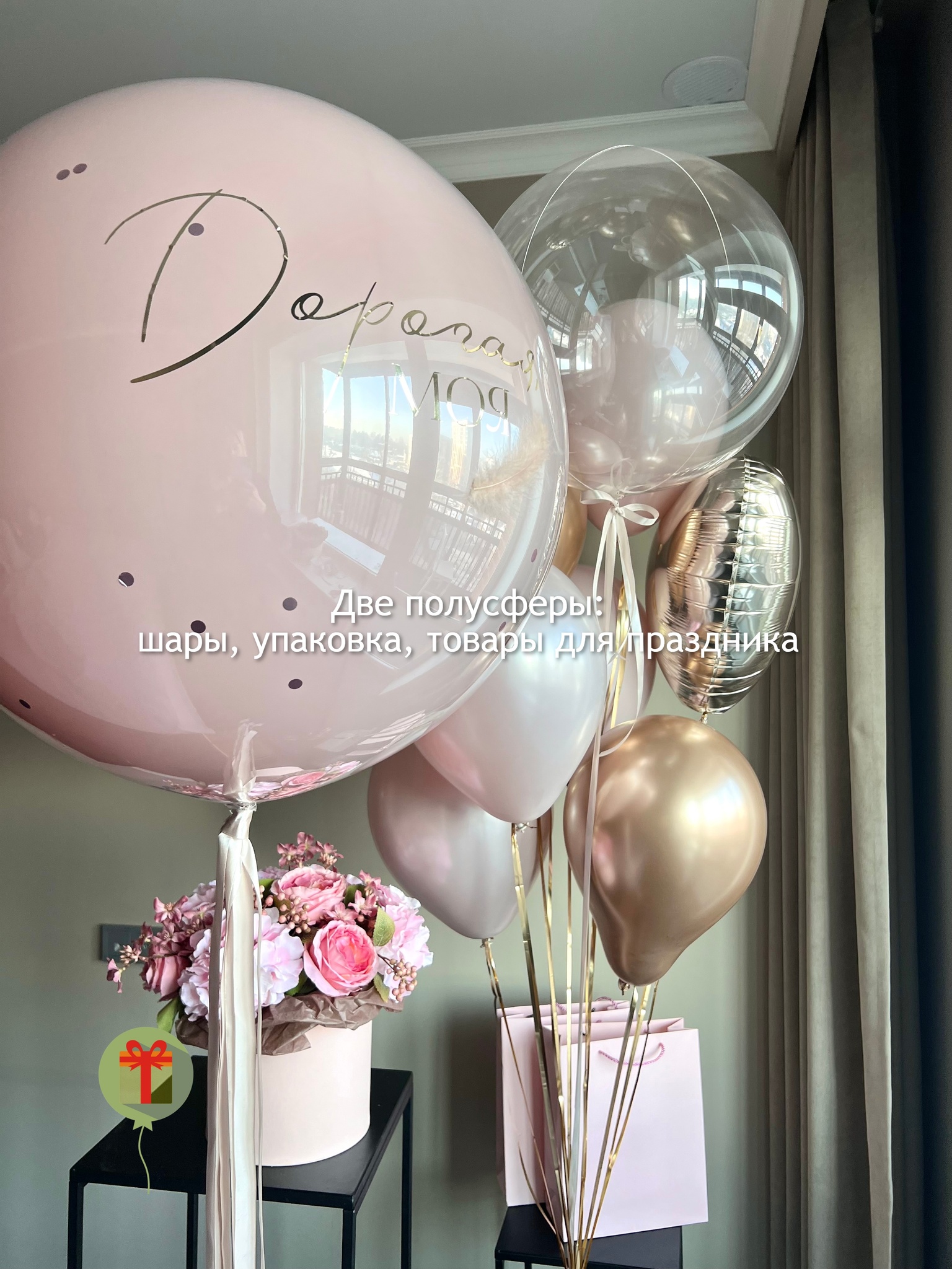 Фонтан из 8 штук: сфера 45 см, сердце 45 см, 2 шара хром и 4 шара пастель; а так же сфера дабл бабл 60 см с конфетти+ надпись. Грузики и пакеты включены в стоимость.