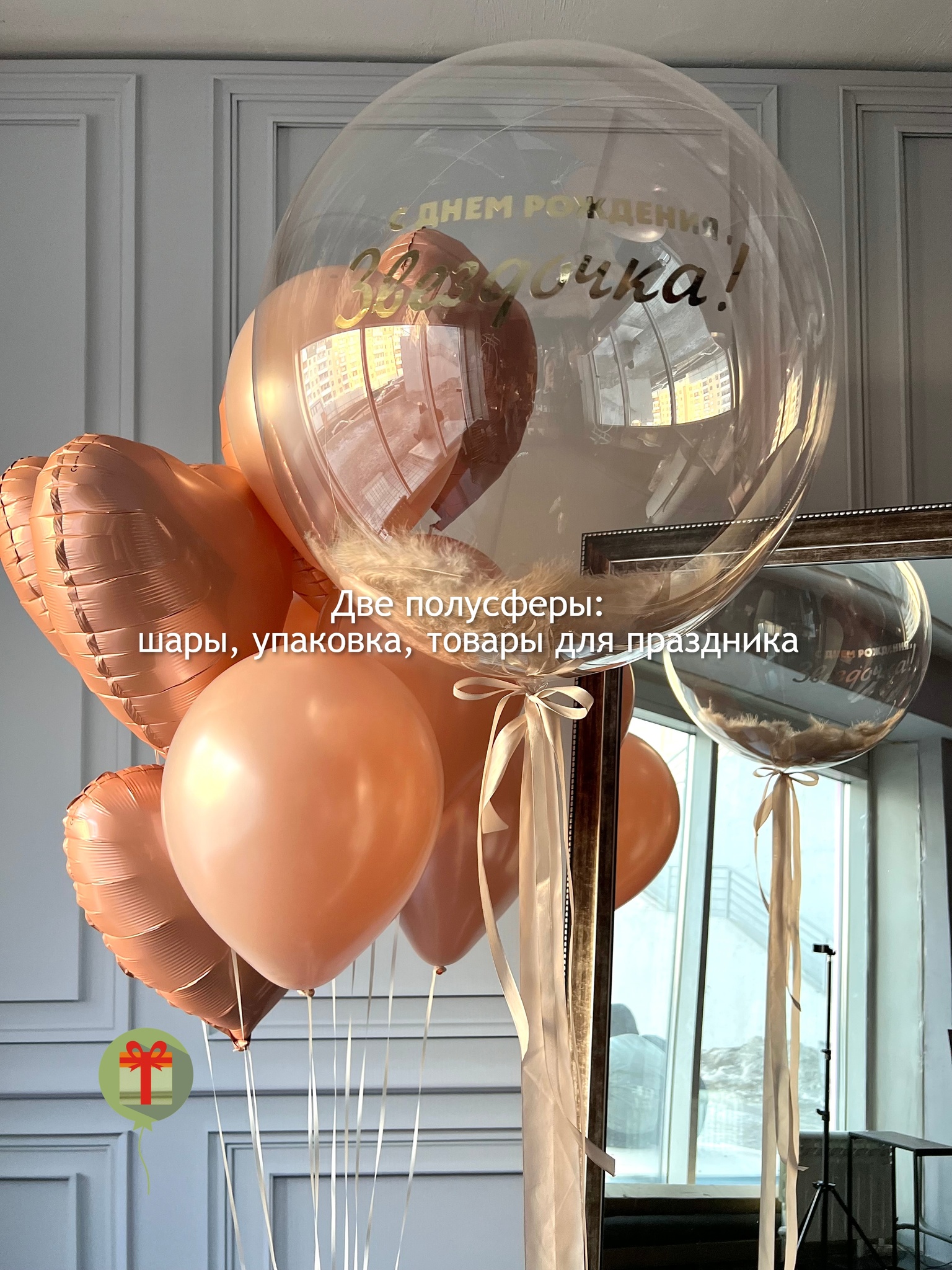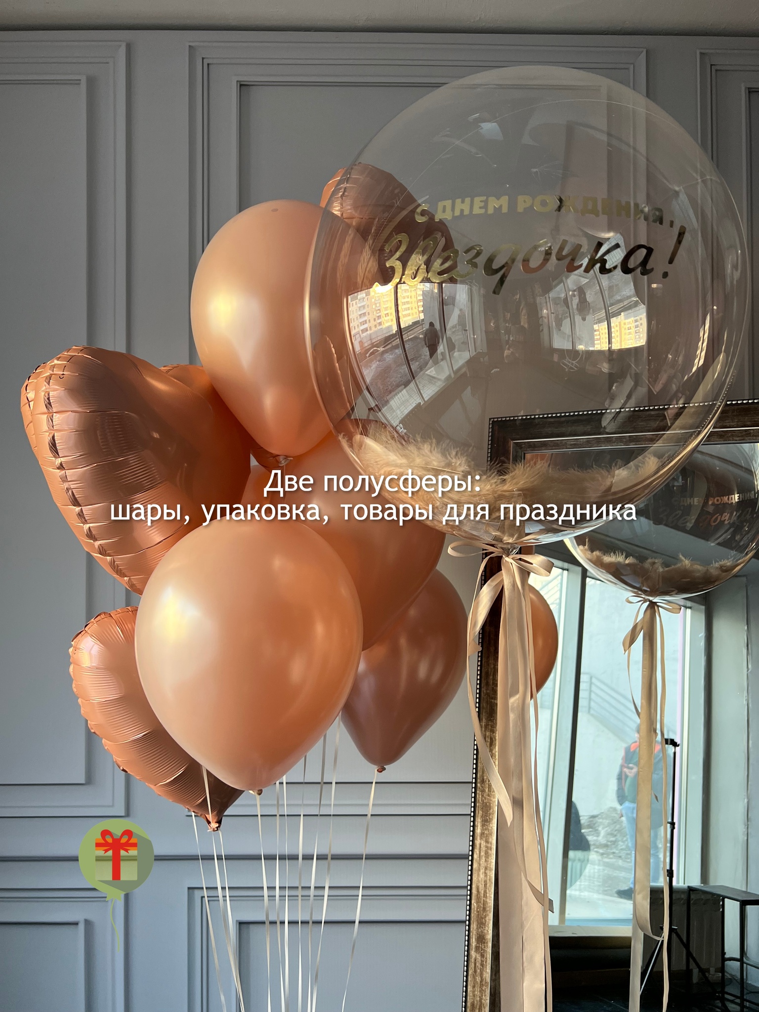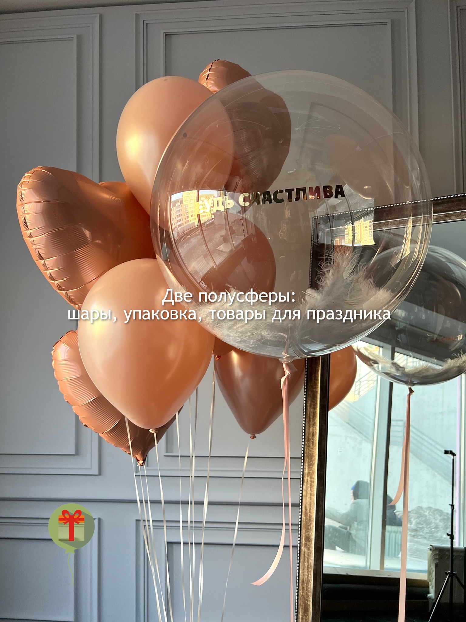 Нежный фонтан из 10 штук: 5 фольгированных сердец 45 см и 5 жемчужных шаров; а так же сфера 60 см с перьями+ надпись. Грузики и пакеты включены в стоимость.