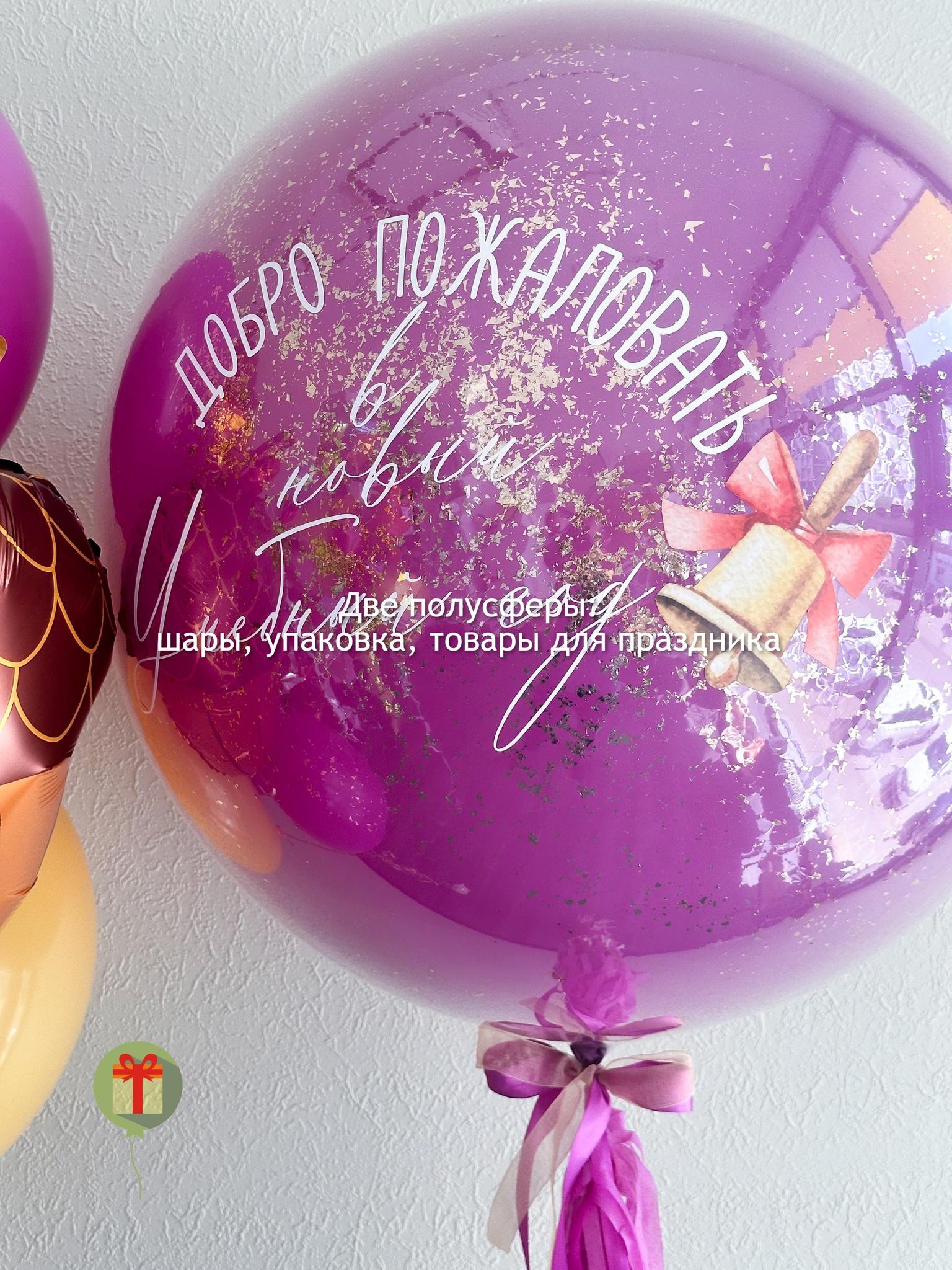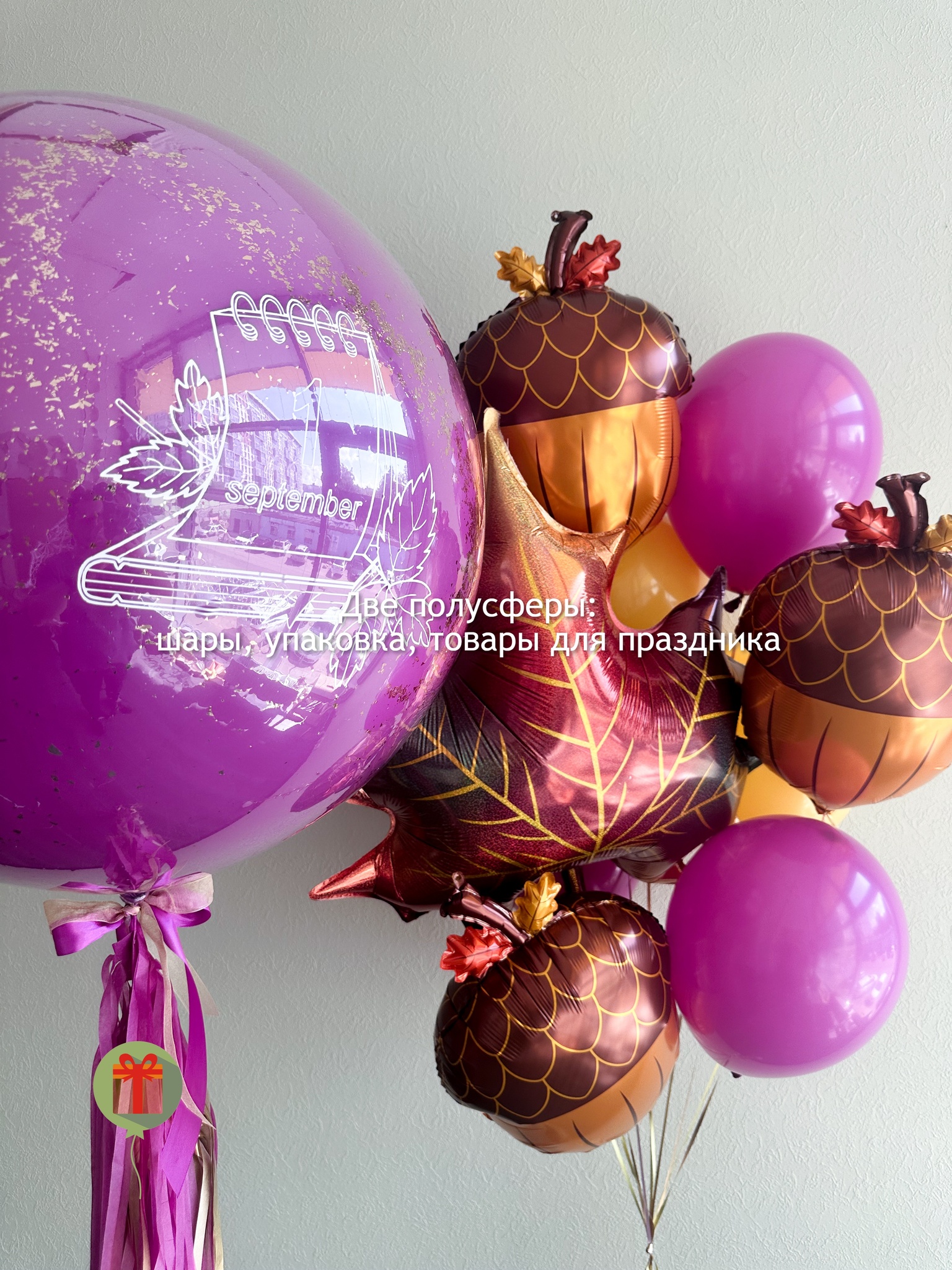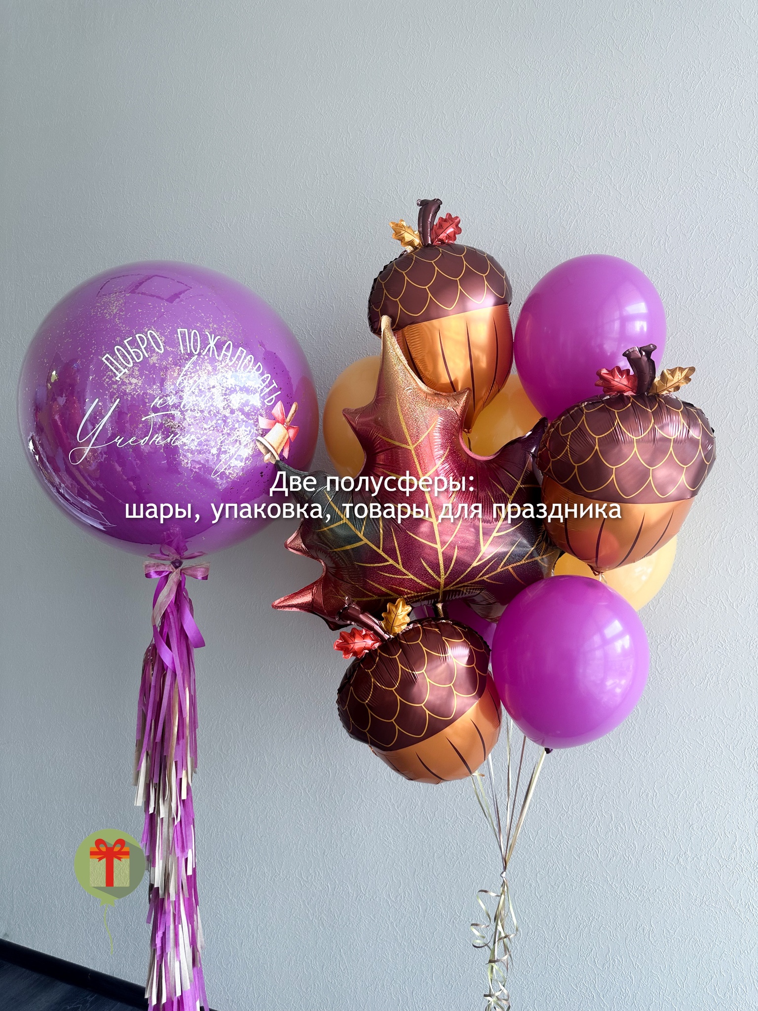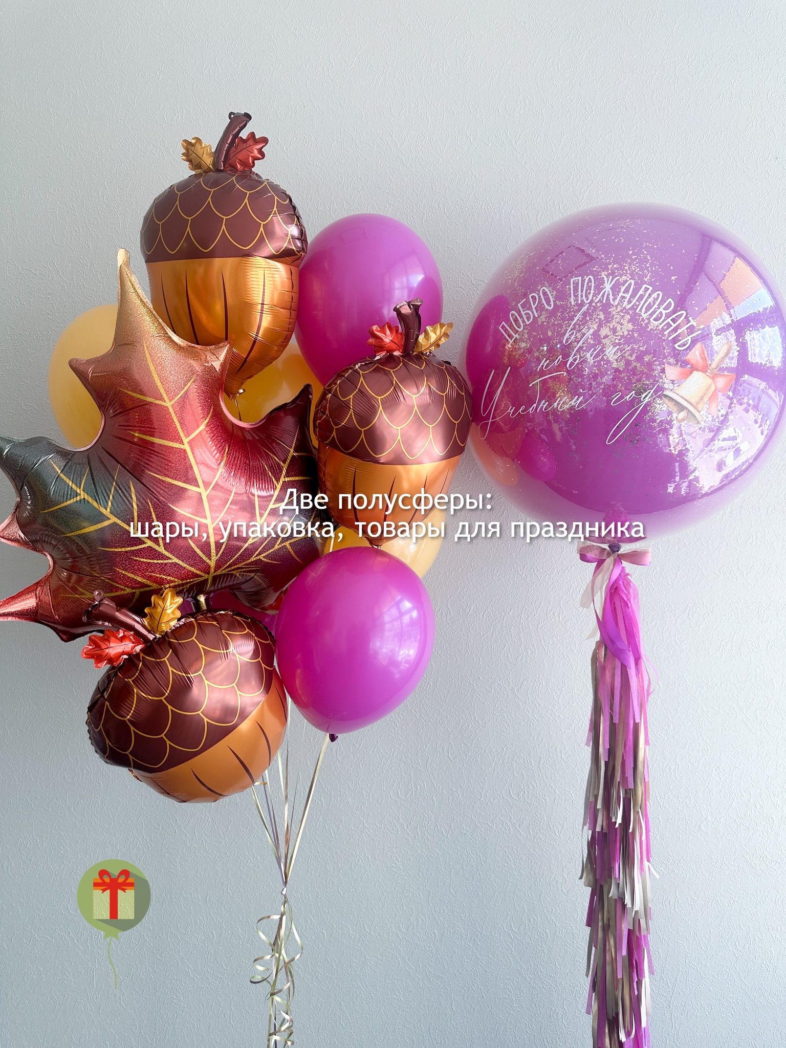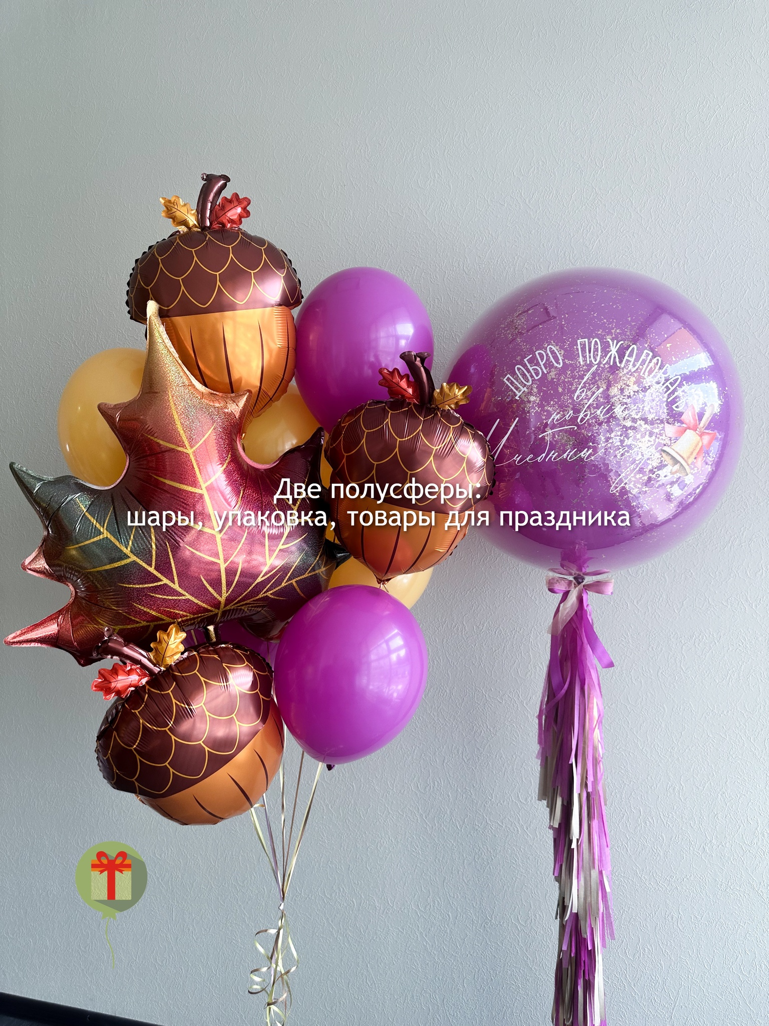 Фонтан из 10 штук: фольгированная фигура Кленовый лист, 3 фигуры желудей и 6 шаров пастель; а так же сфера дабл бабл 60 см с конфетти+ надпись, декорированная пышным хвостом. Грузики и пакеты включены в стоимость.