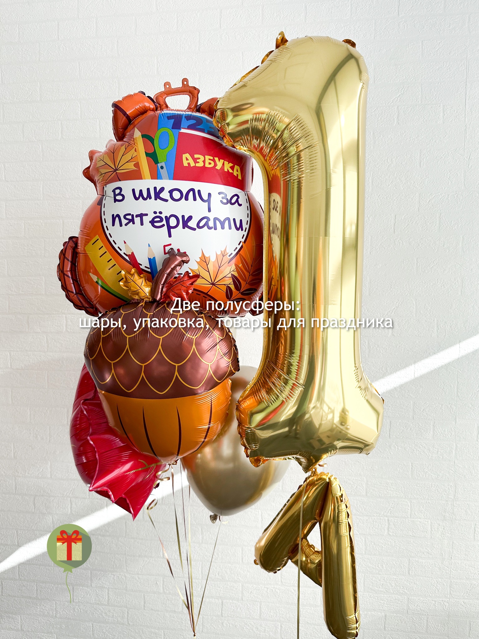 Фольгированная цифра 102 см+ буква 40 см и фонтан из 5 штук: фигура рюкзак, фигура желудь, звезда 45 см и 2 шара хром. Грузики и пакеты включены в стоимость.