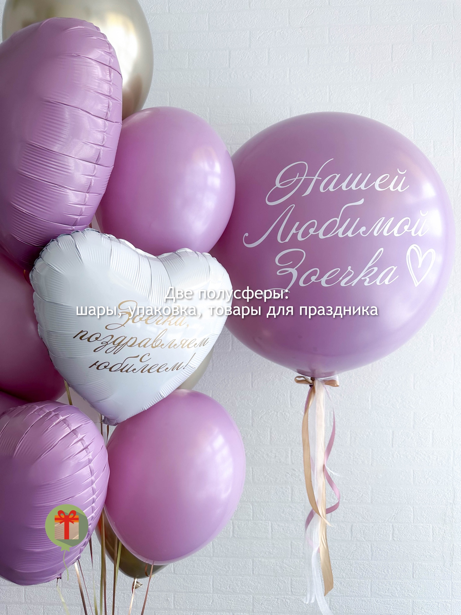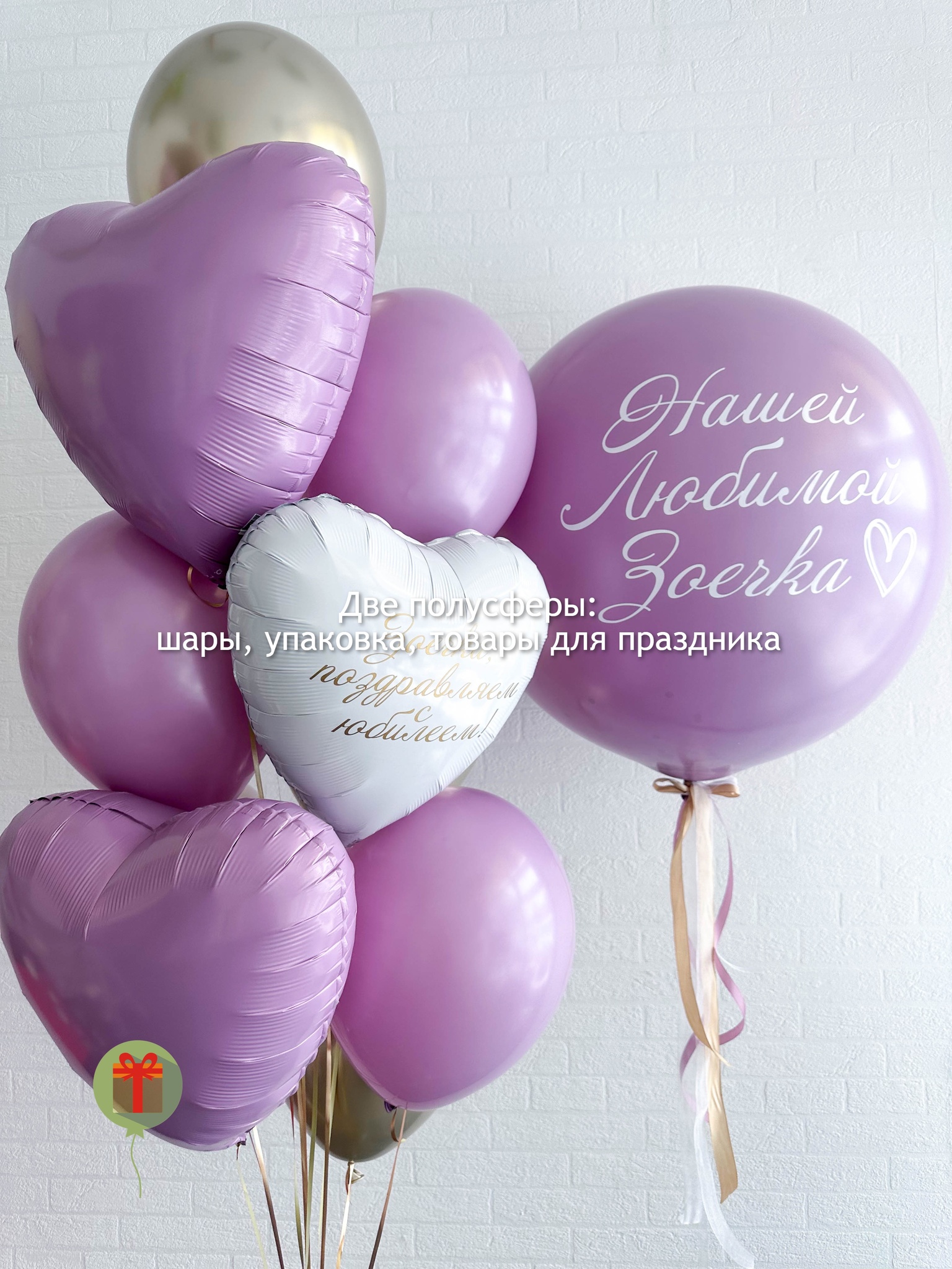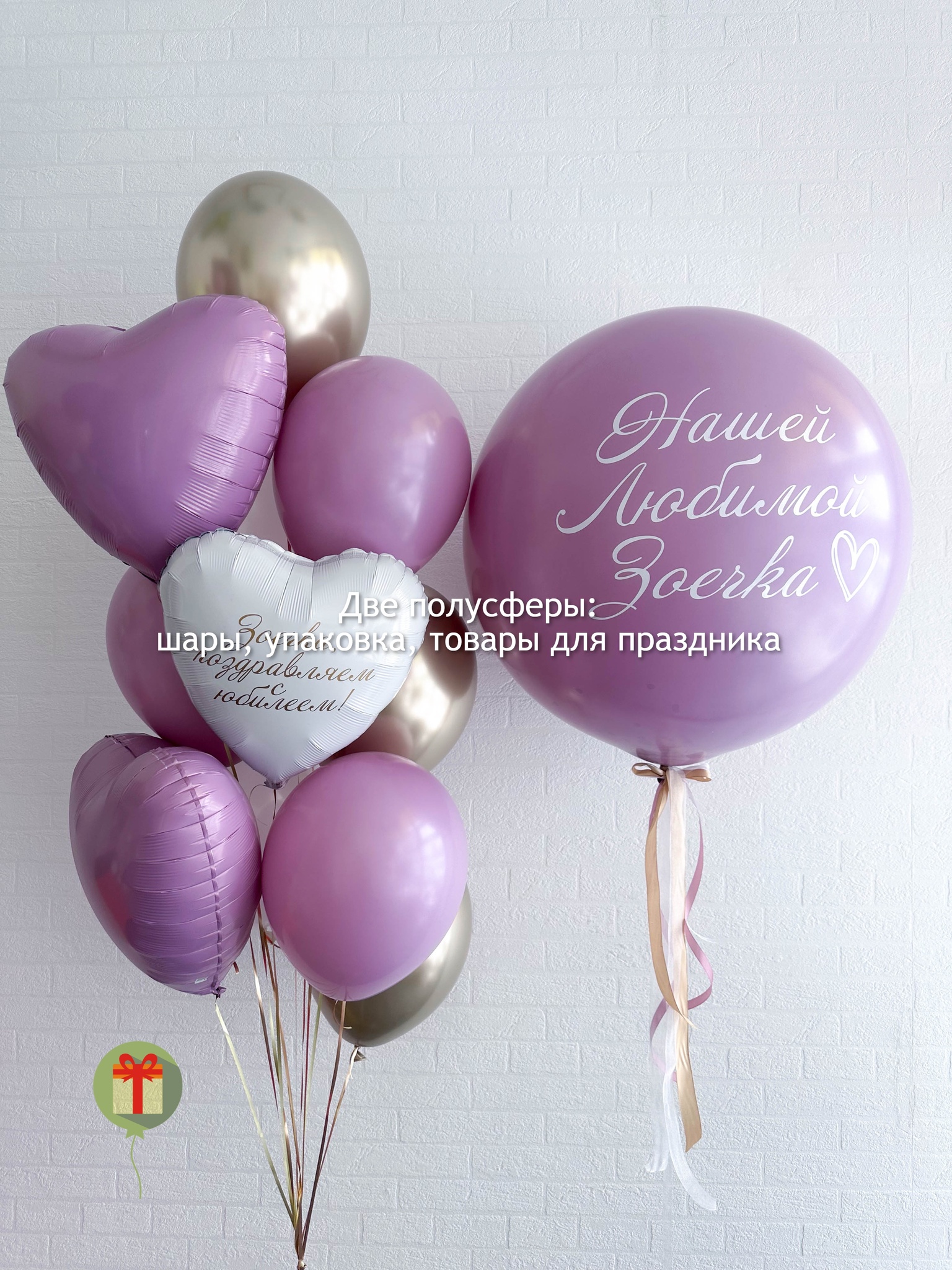 Большой латексный шар 60 см+ надпись и фонтан из 10 штук: 3 сердца 45см, 3 шара хром и 4 шара пастель. Грузики и пакеты включены в стоимость.