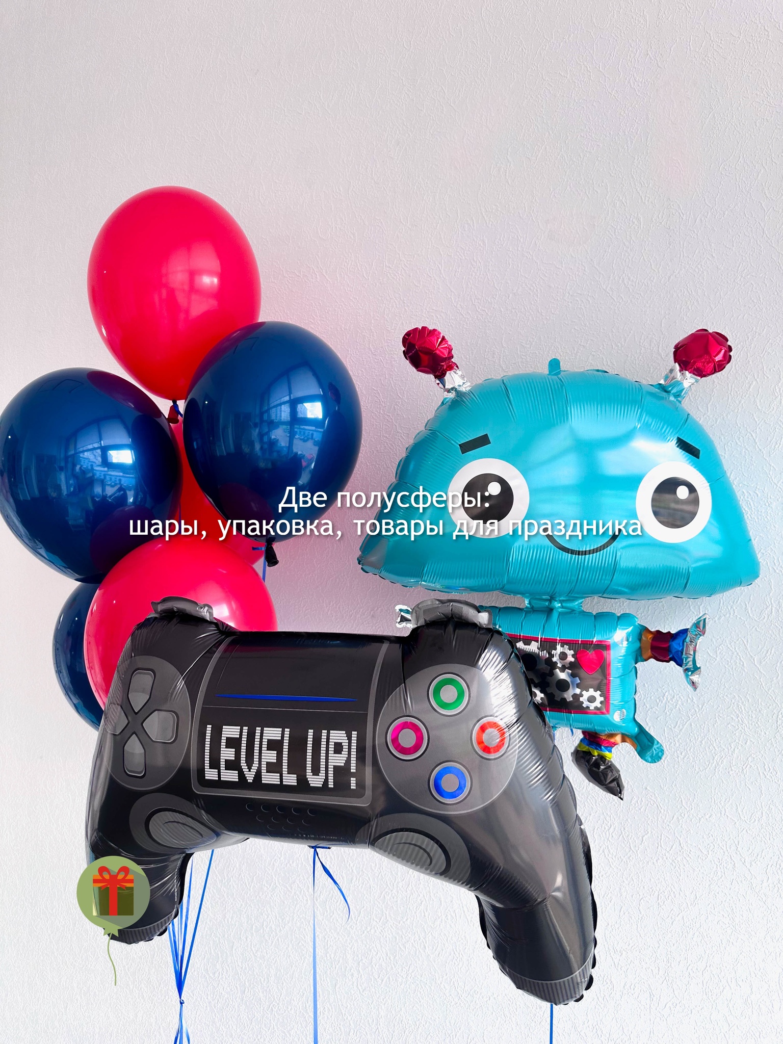 Фонтан из 7 штук: 3 двойных шара и 4 шара пастель; а так же 2 фольгированные фигуры. Грузики и пакеты включены в стоимость.