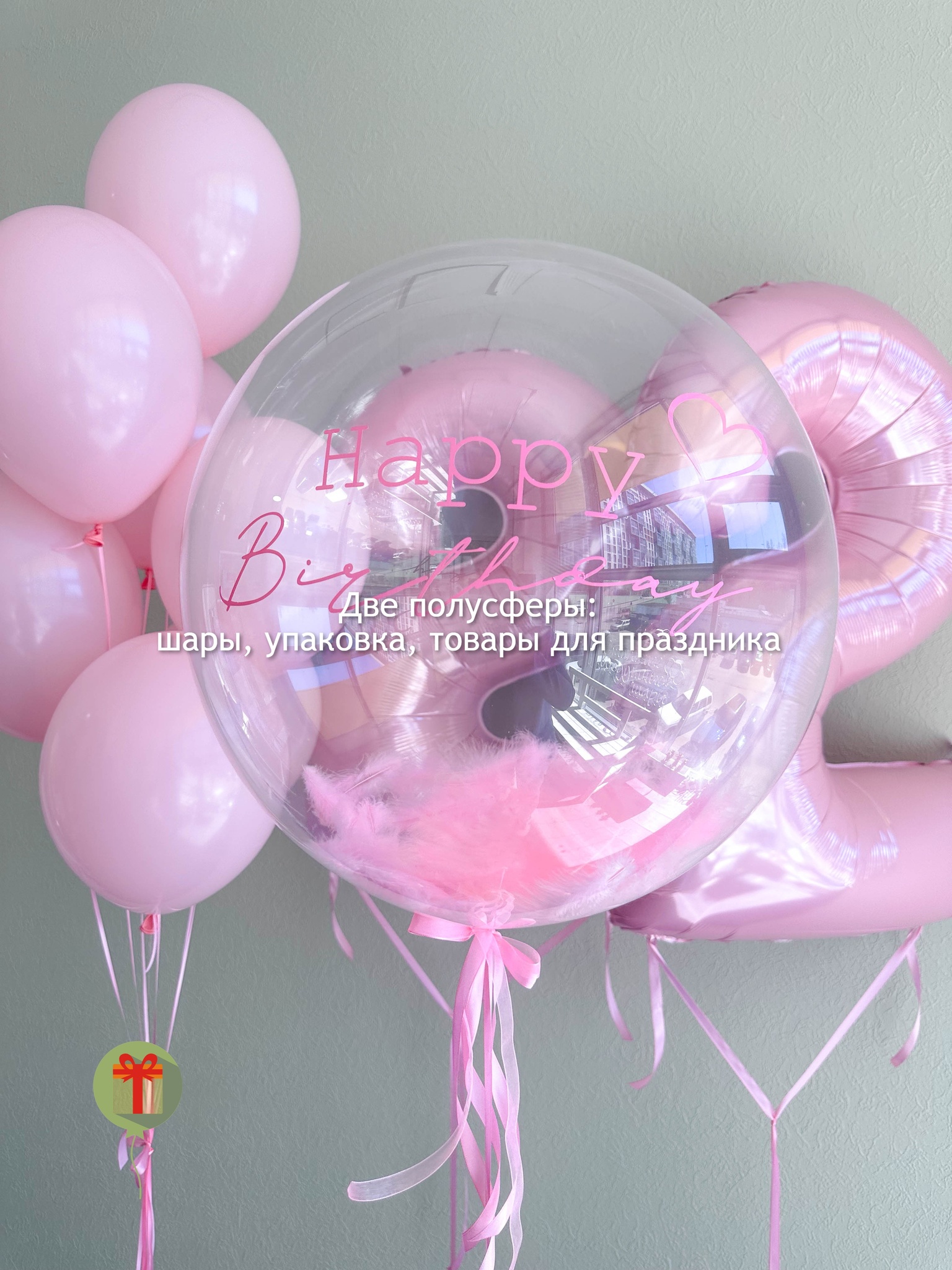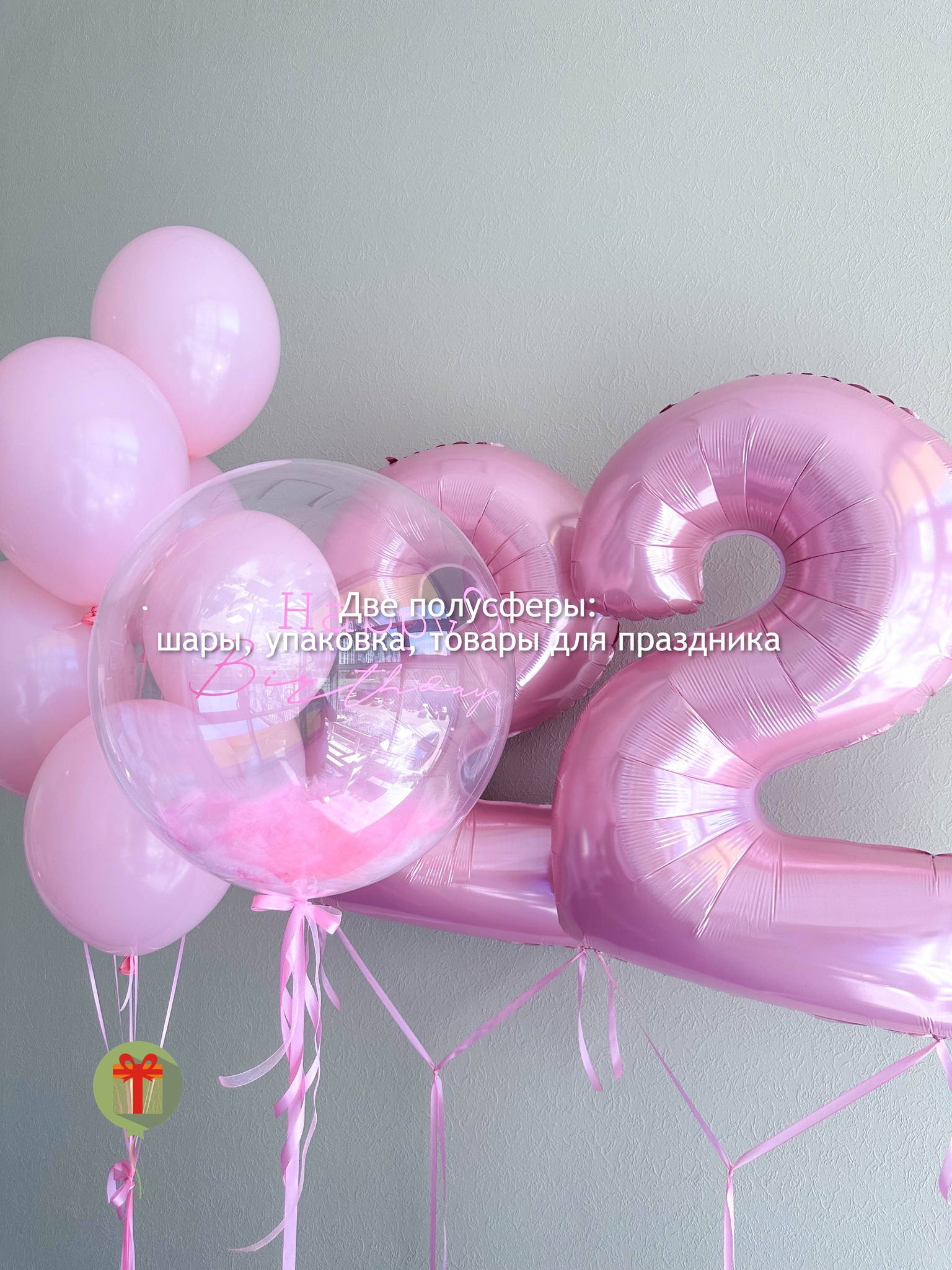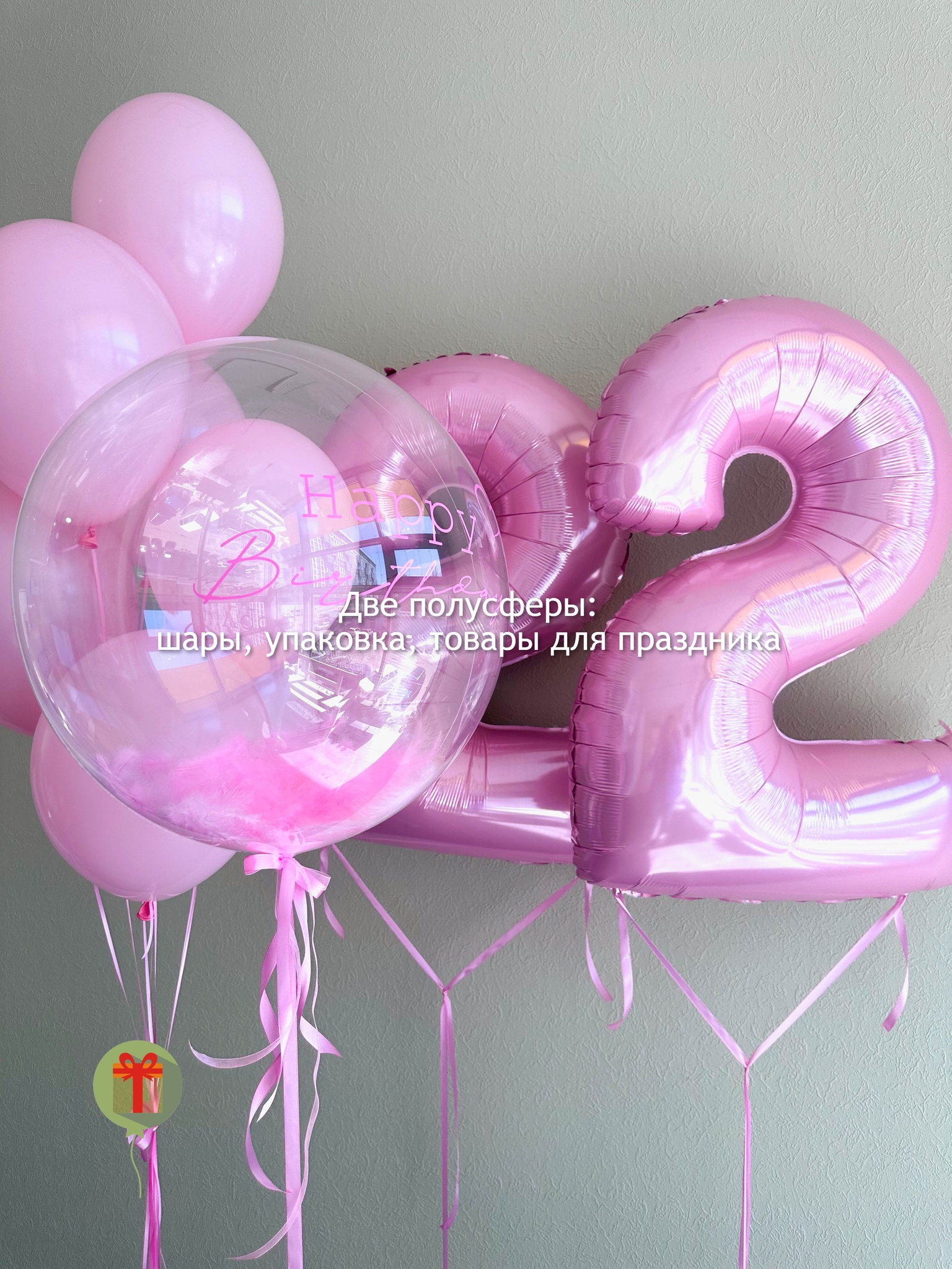 Фонтан из 7 шаров пастель и 2 фольгированные цифры 102 см, а так же сфера 60 см с перьями+ надпись. Грузики и пакеты включены в стоимость.