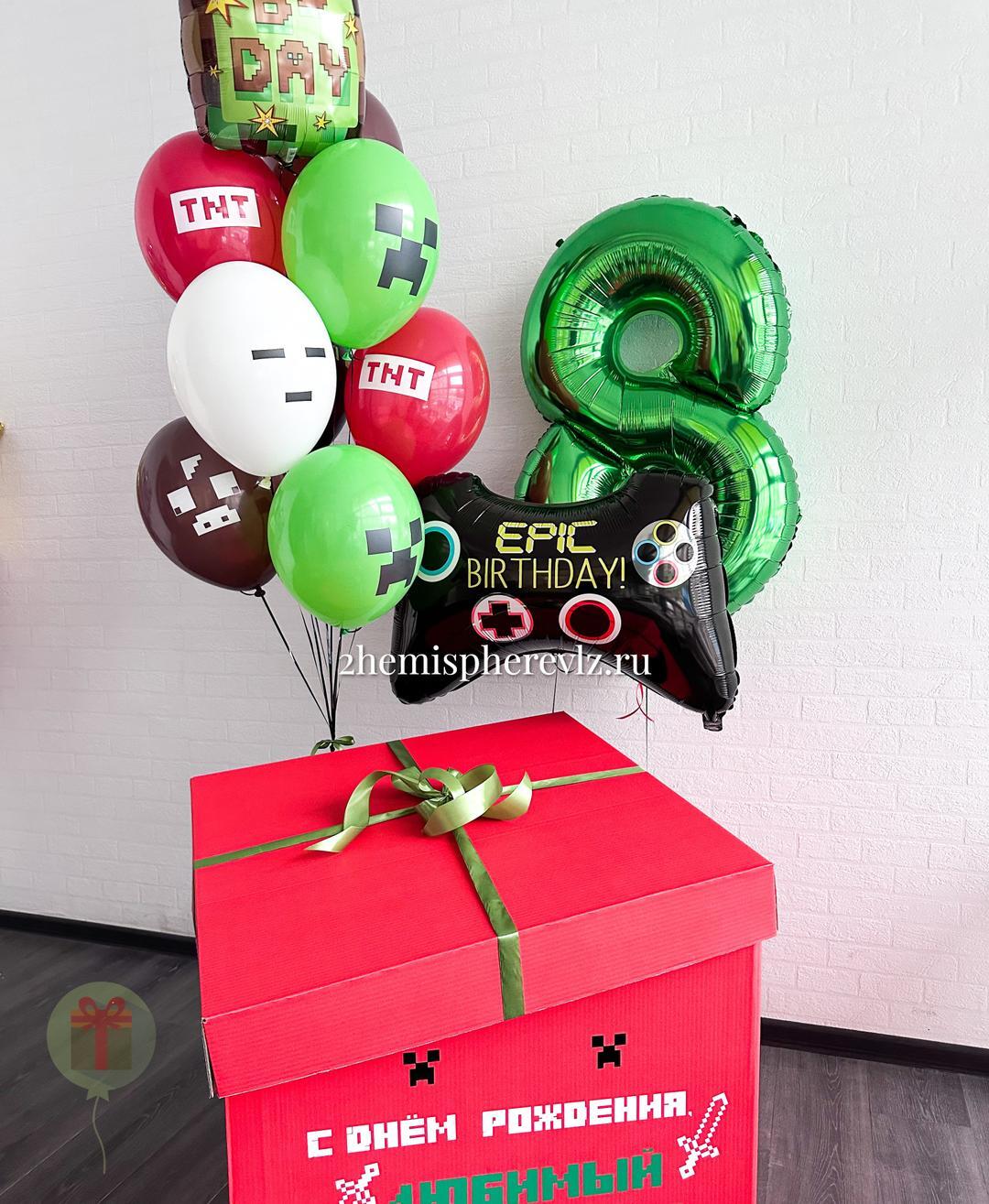 В составе набора коробка 70*70*70 см с надписью с фонтаном из 8 латексных шаров в стиле майнкрафт и 1 шара из фольги 45 см на грузике. Джойстик фольгированный на грузике. Цифра 8 фольгированная 102 см на грузике. Грузики и пакеты входят в стоимость