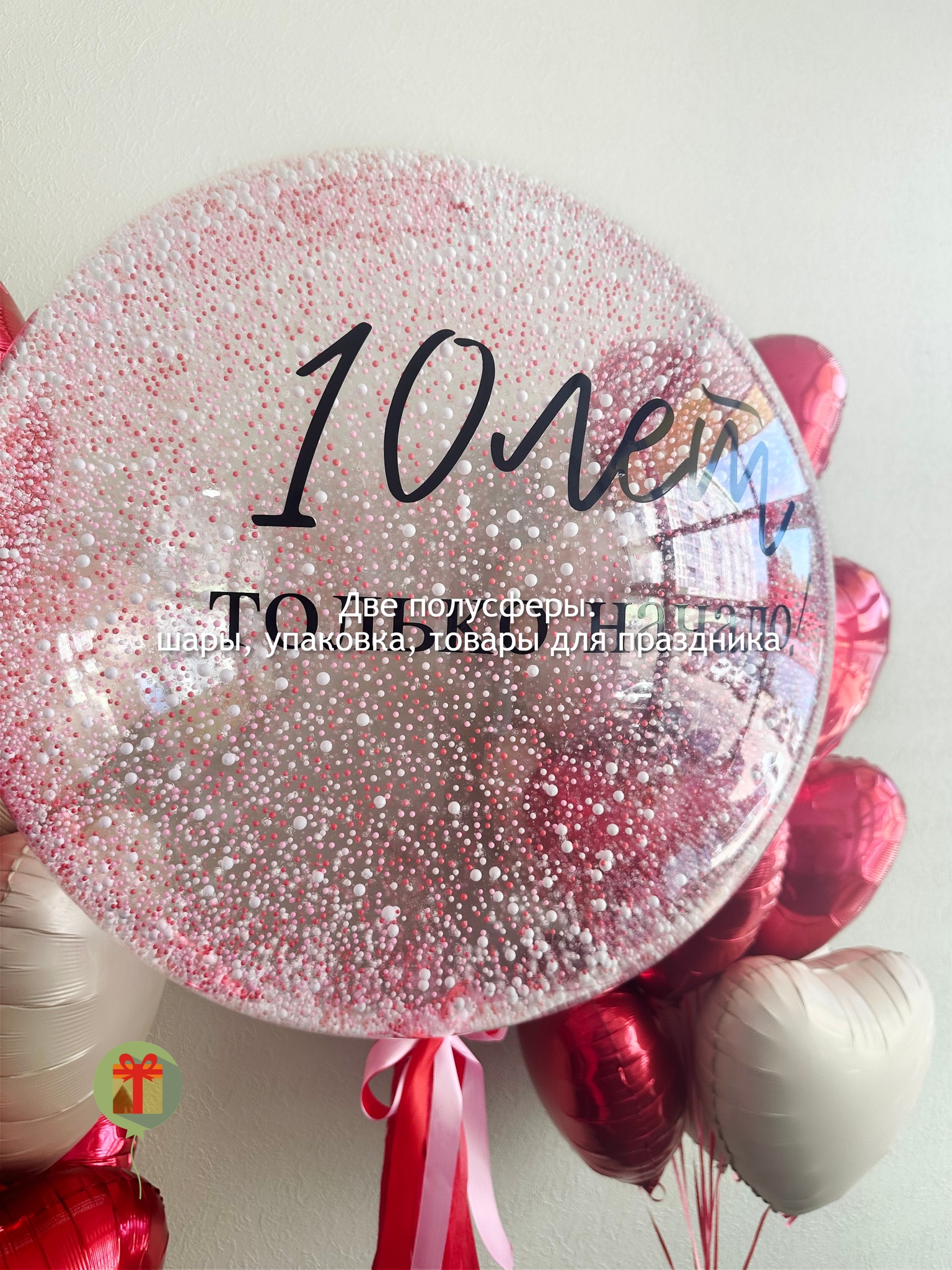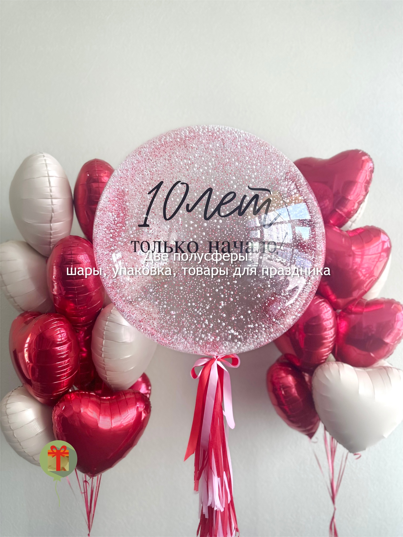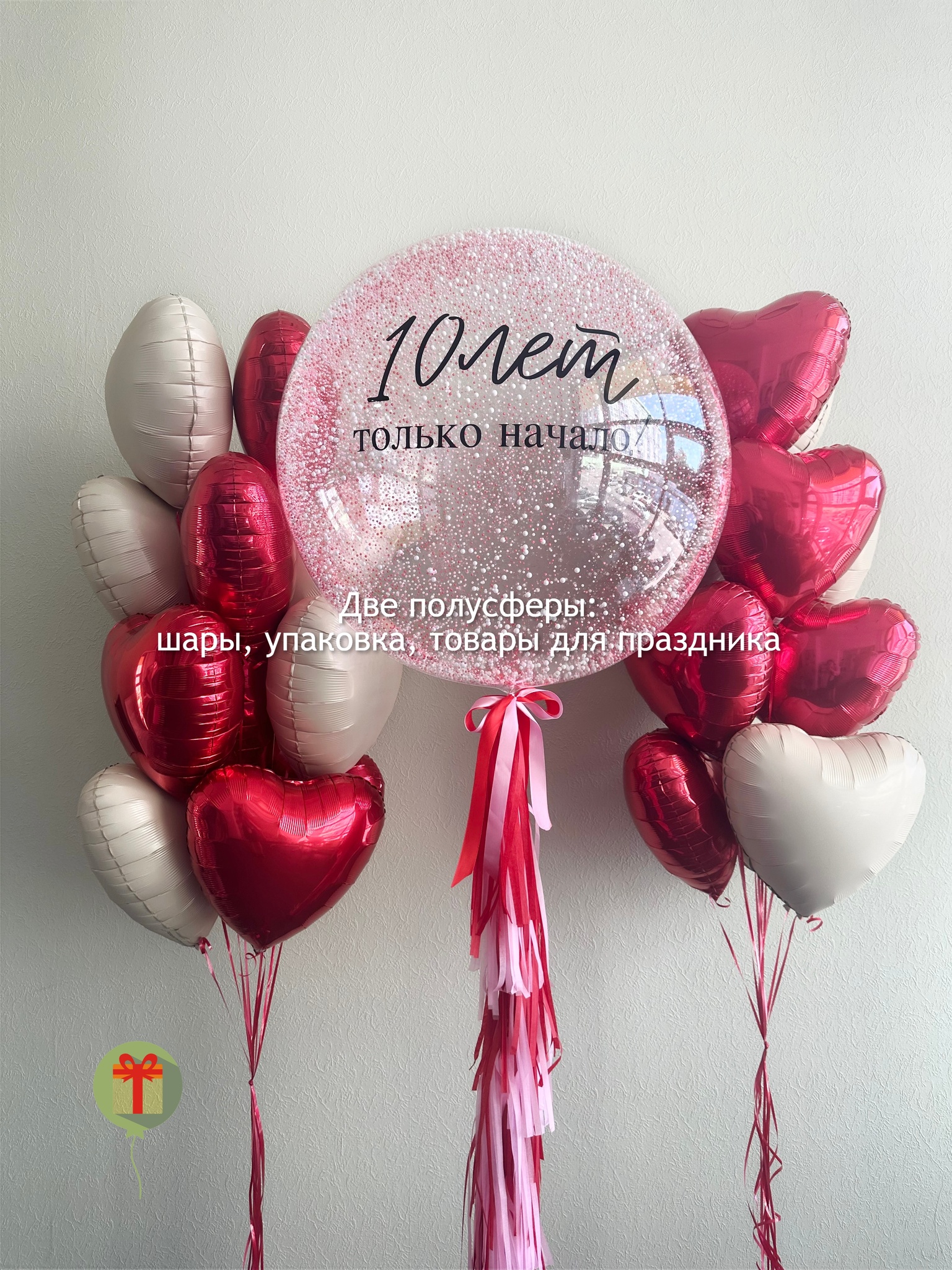 Сфера 60 см с пенопластом + надпись и 2 фонтана по 11 фольгированных сердец 45 см. Грузики и пакеты включены в стоимость.