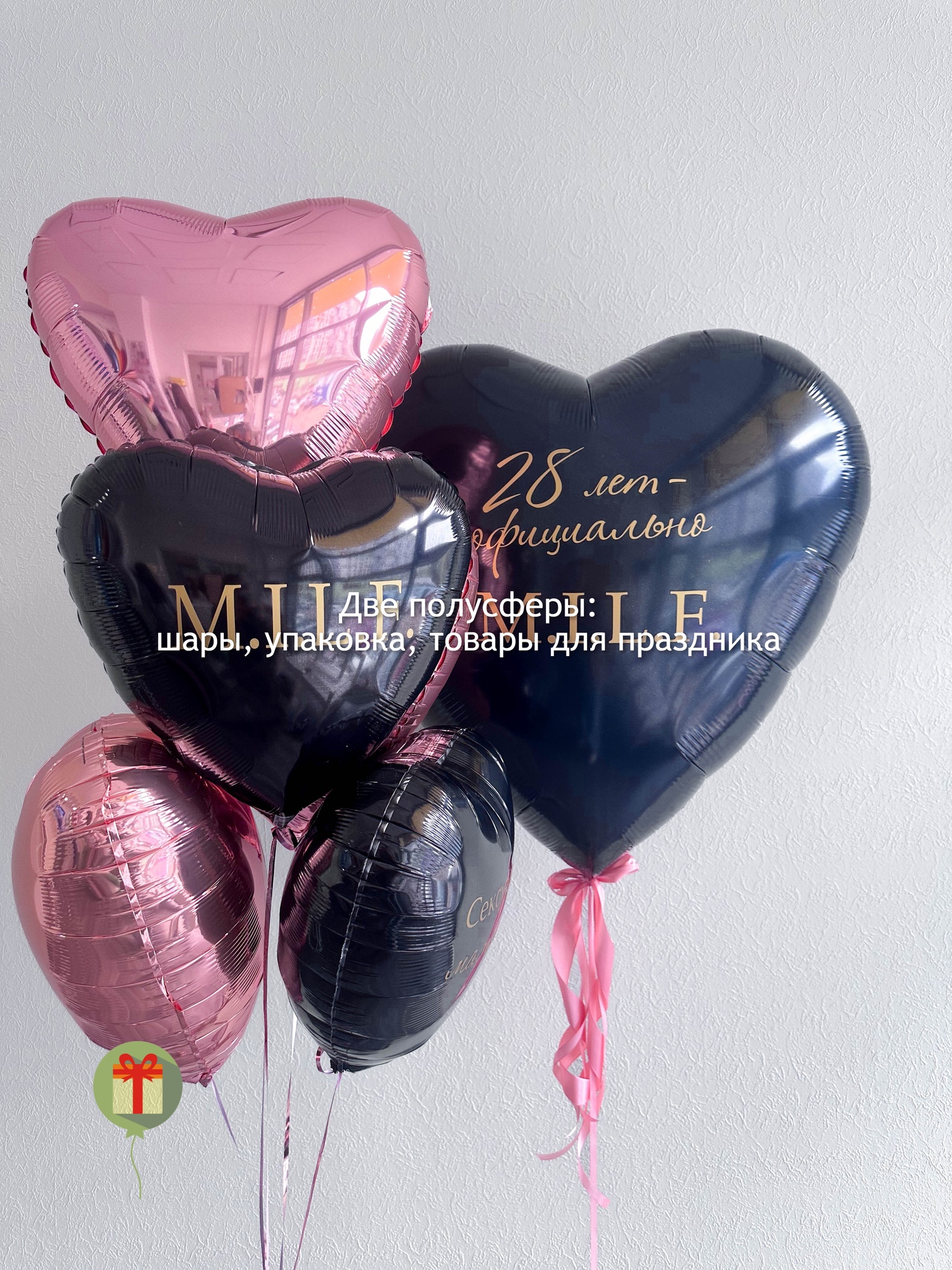 Фонтан из 5 фольгированных сердец с надписями; а так же фольгированное сердце 60 см с надписью. Грузики и пакеты включены в стоимость.