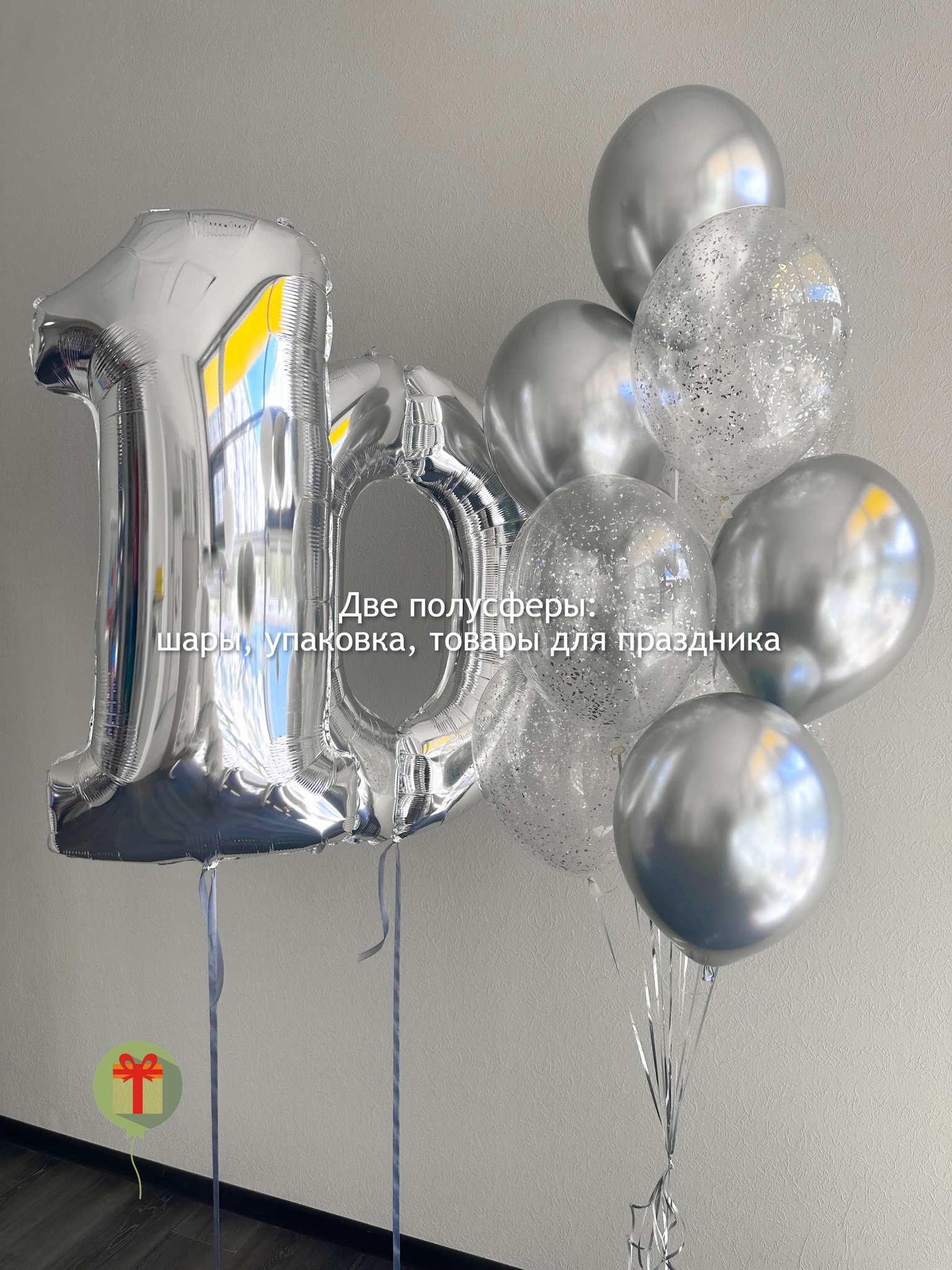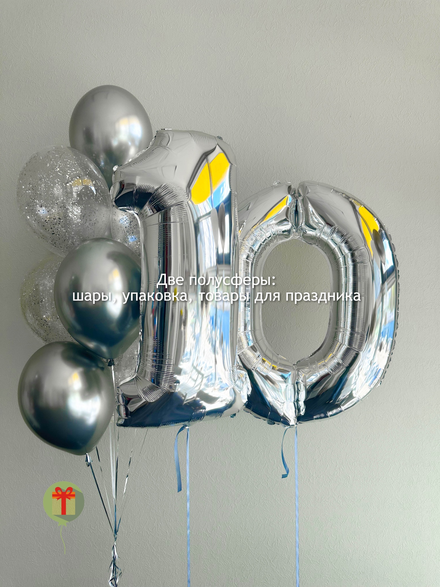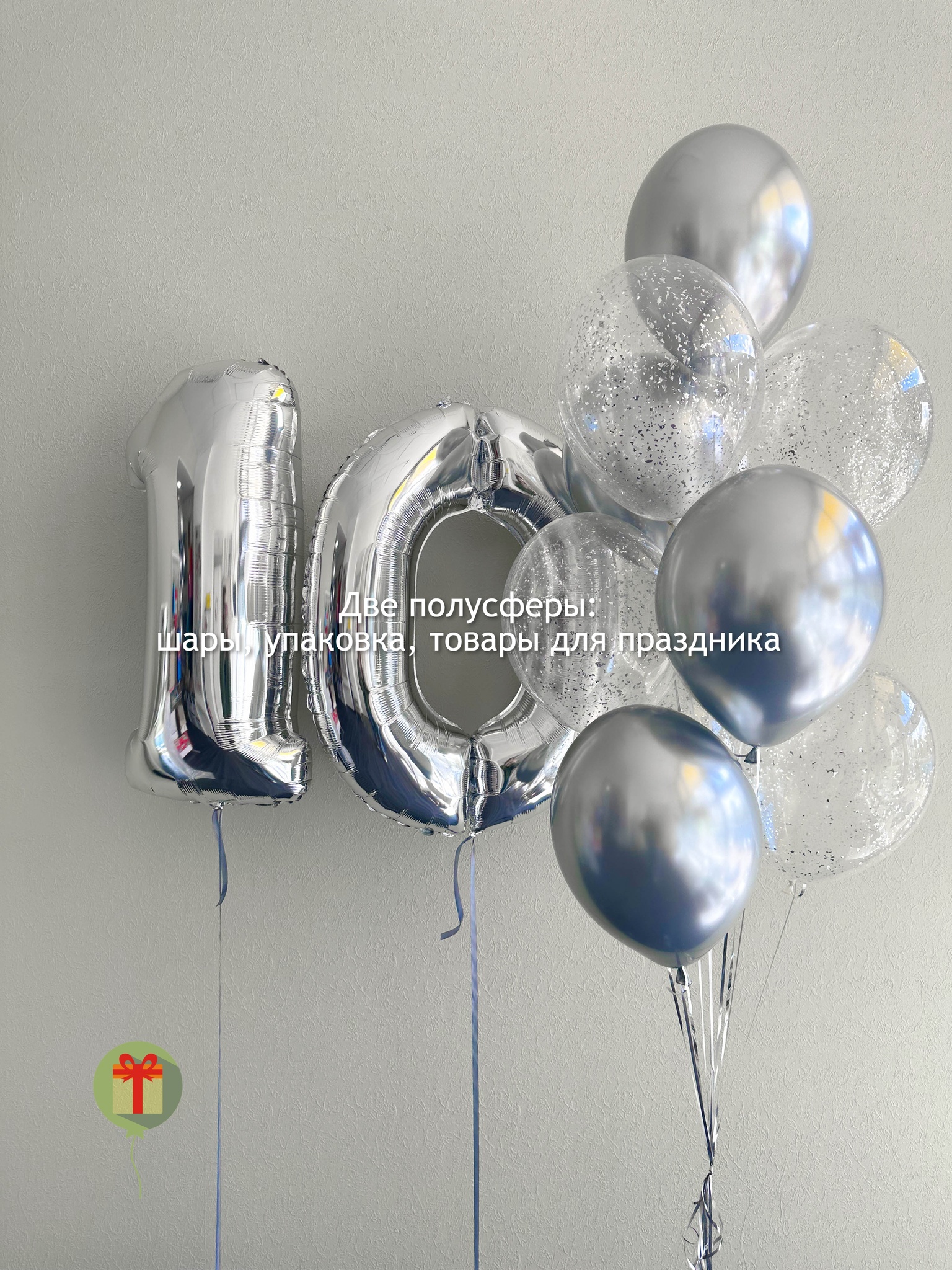 Фонтан из 10 штук: 5 шаров хром и 5 шаров с конфетти; 2 цифры 102 см. Грузики и пакеты включены в стоимость.