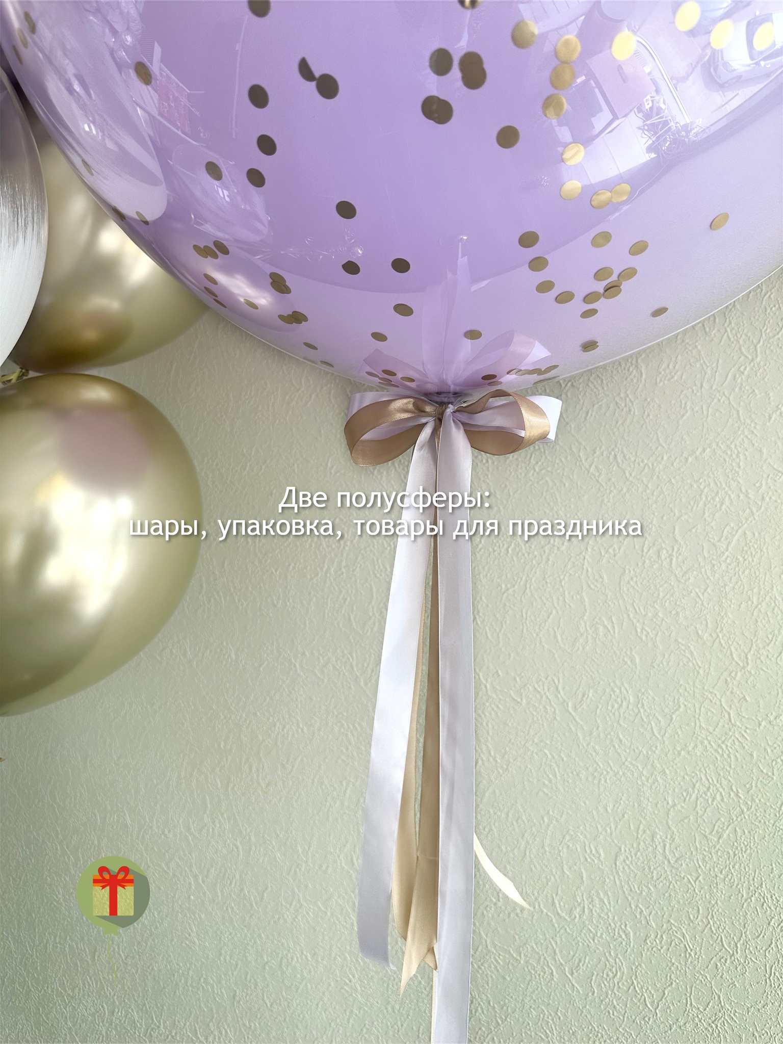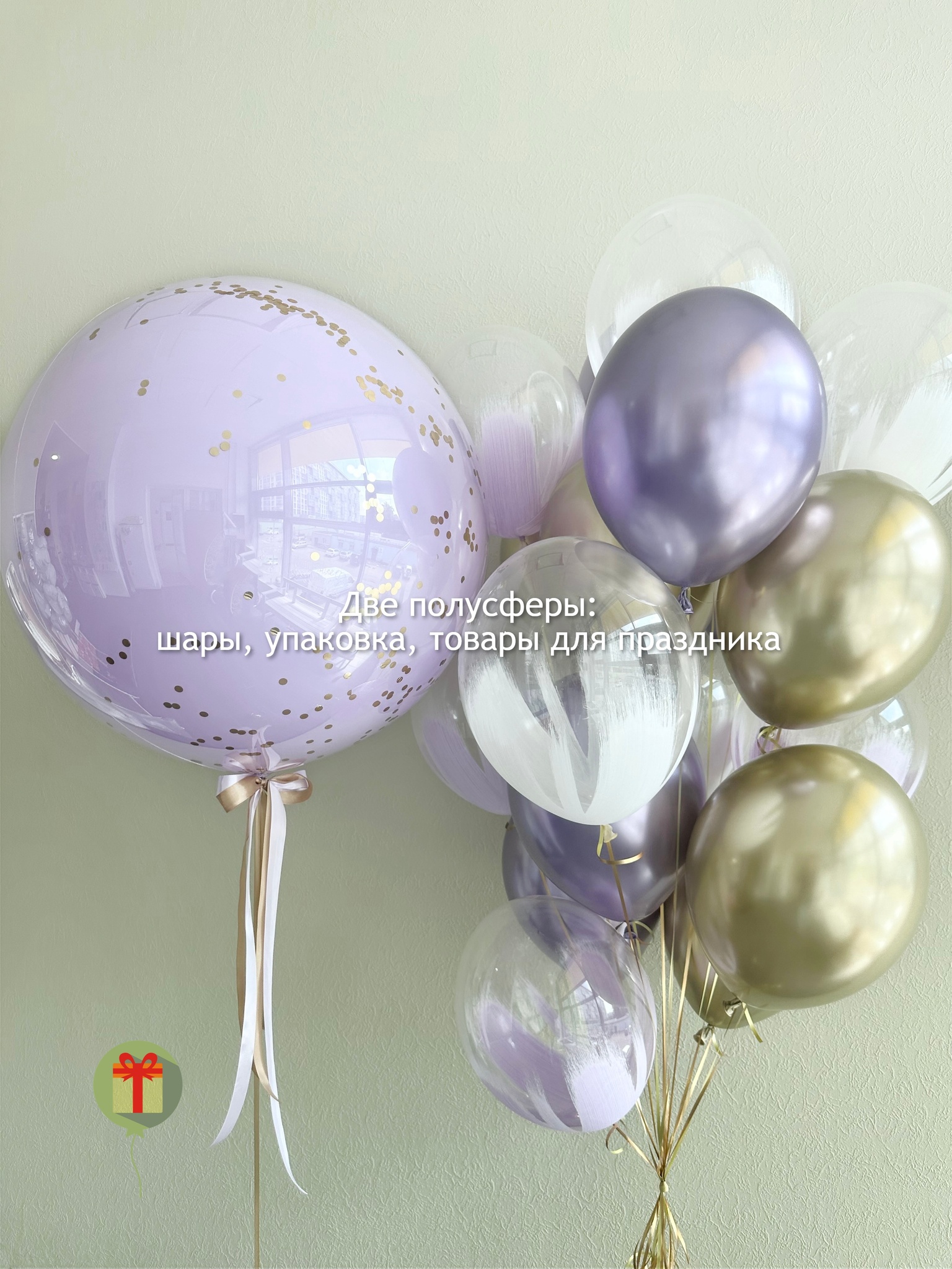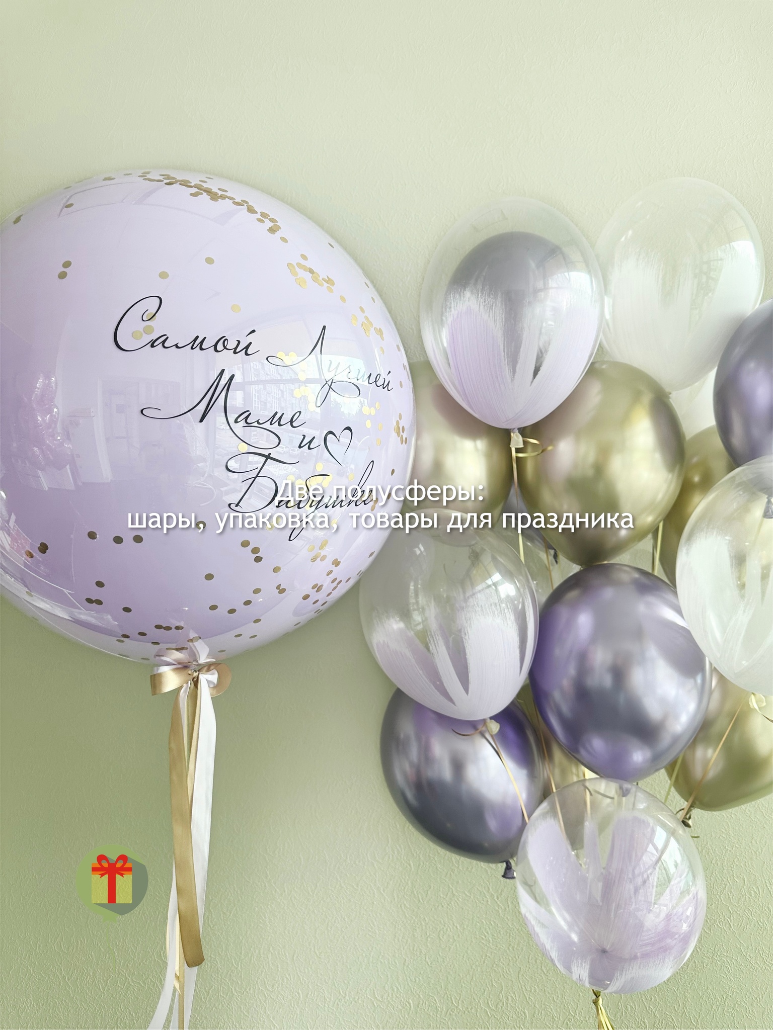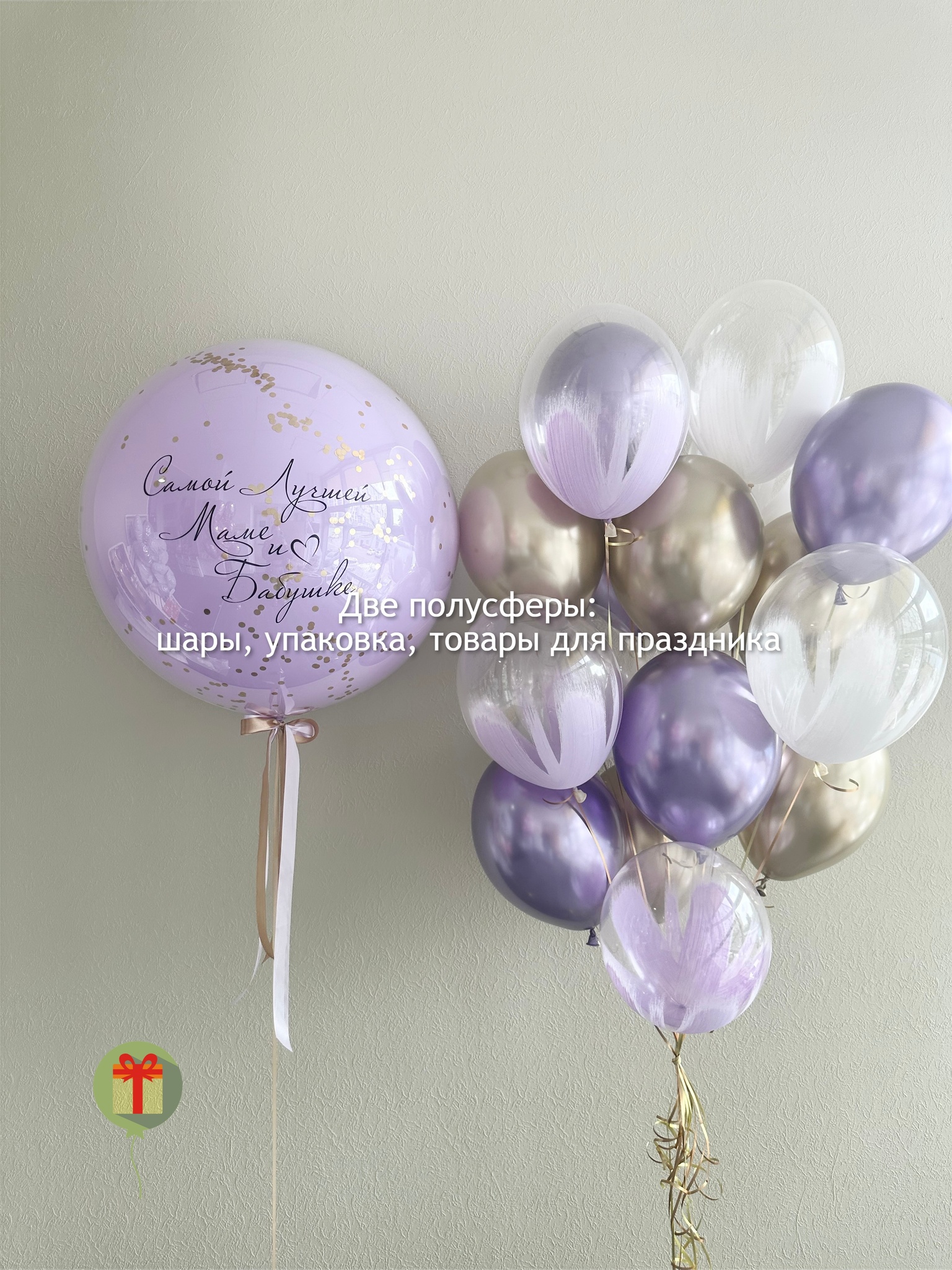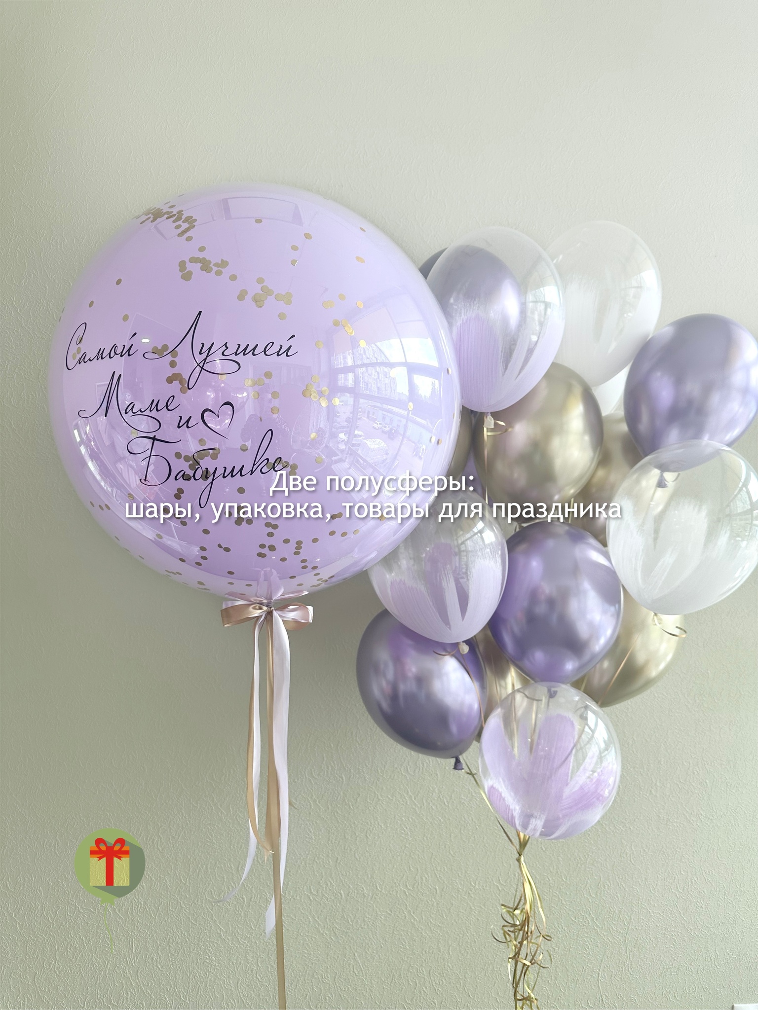 Фонтан из 15 штук: 6 шаров браш и 7 шаров хром; а так же сфера дабл бабл 60 см+ надпись. Грузики и пакеты включены в стоимость.