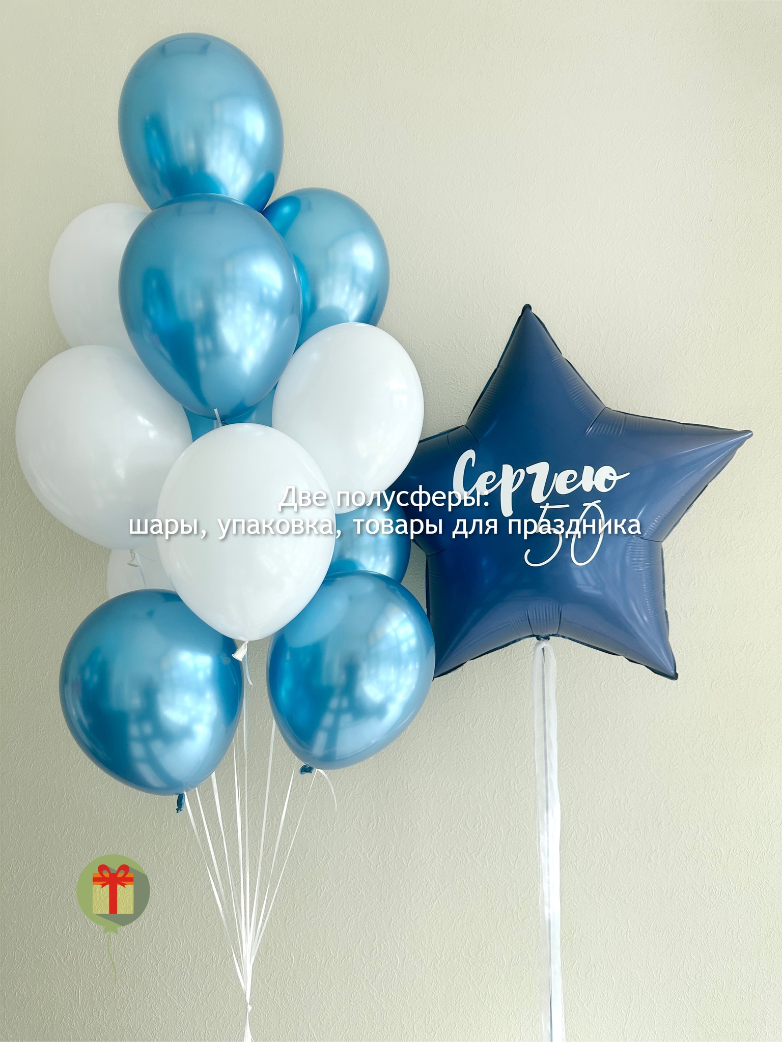 На ос с большой звездой 60 см+ надпись, фонтан из 13 шаров, 6 шаров хром и 7 шаров пастель, грузик и пакет входят в стоимость.