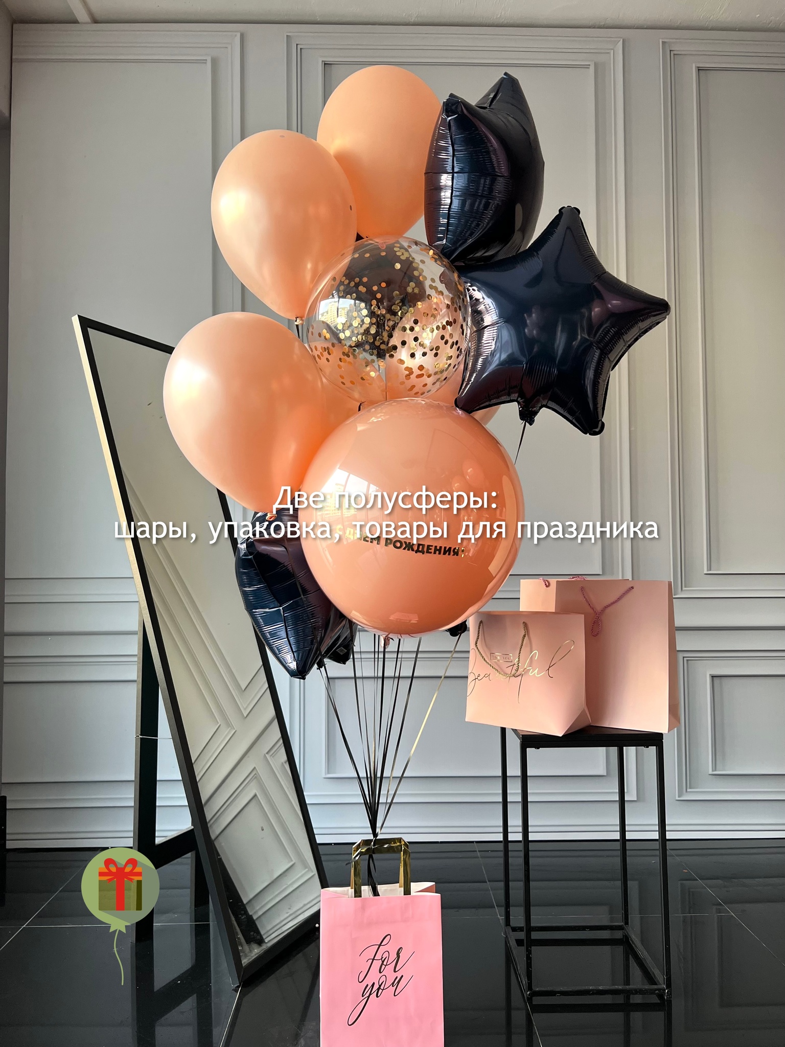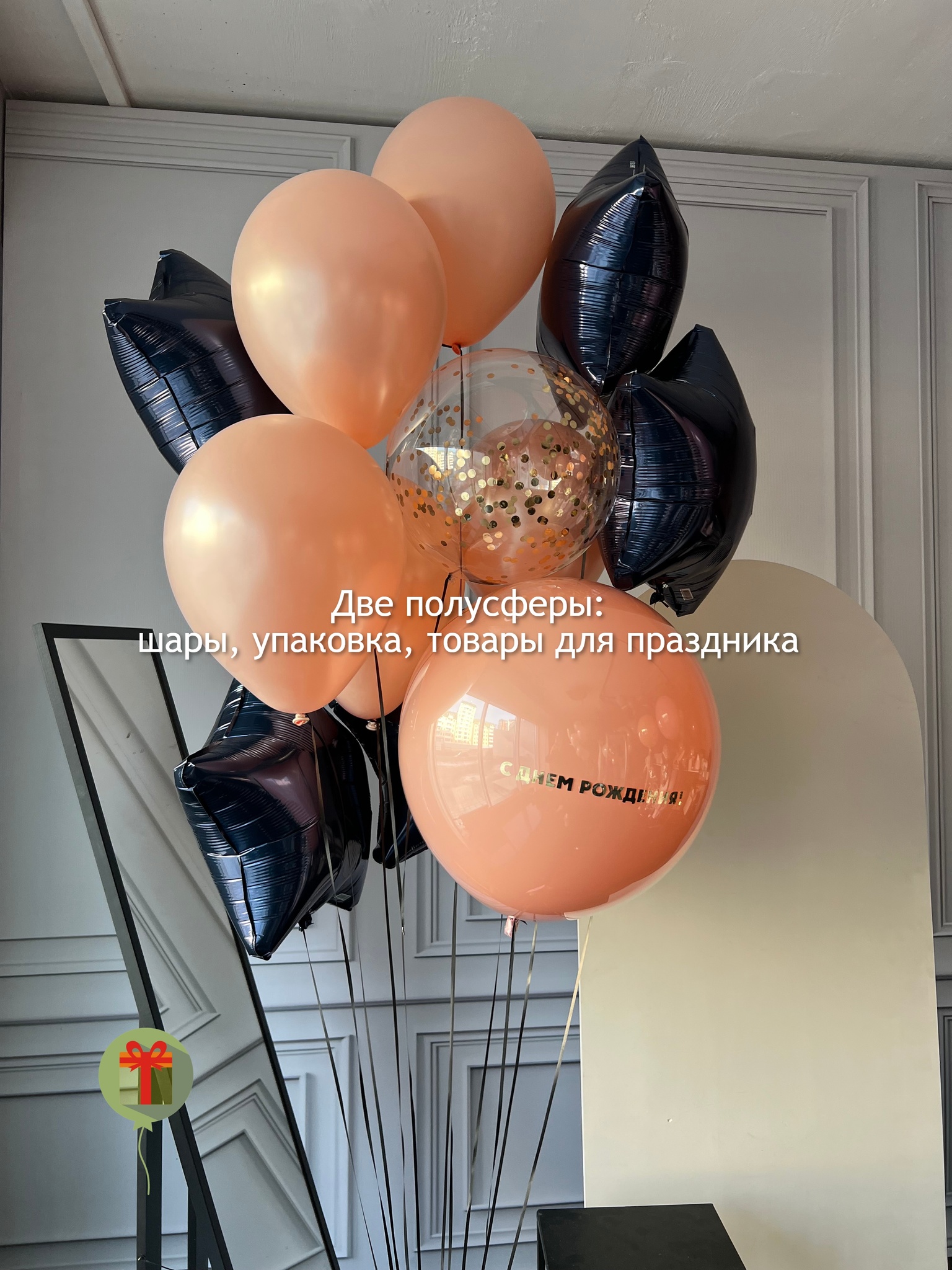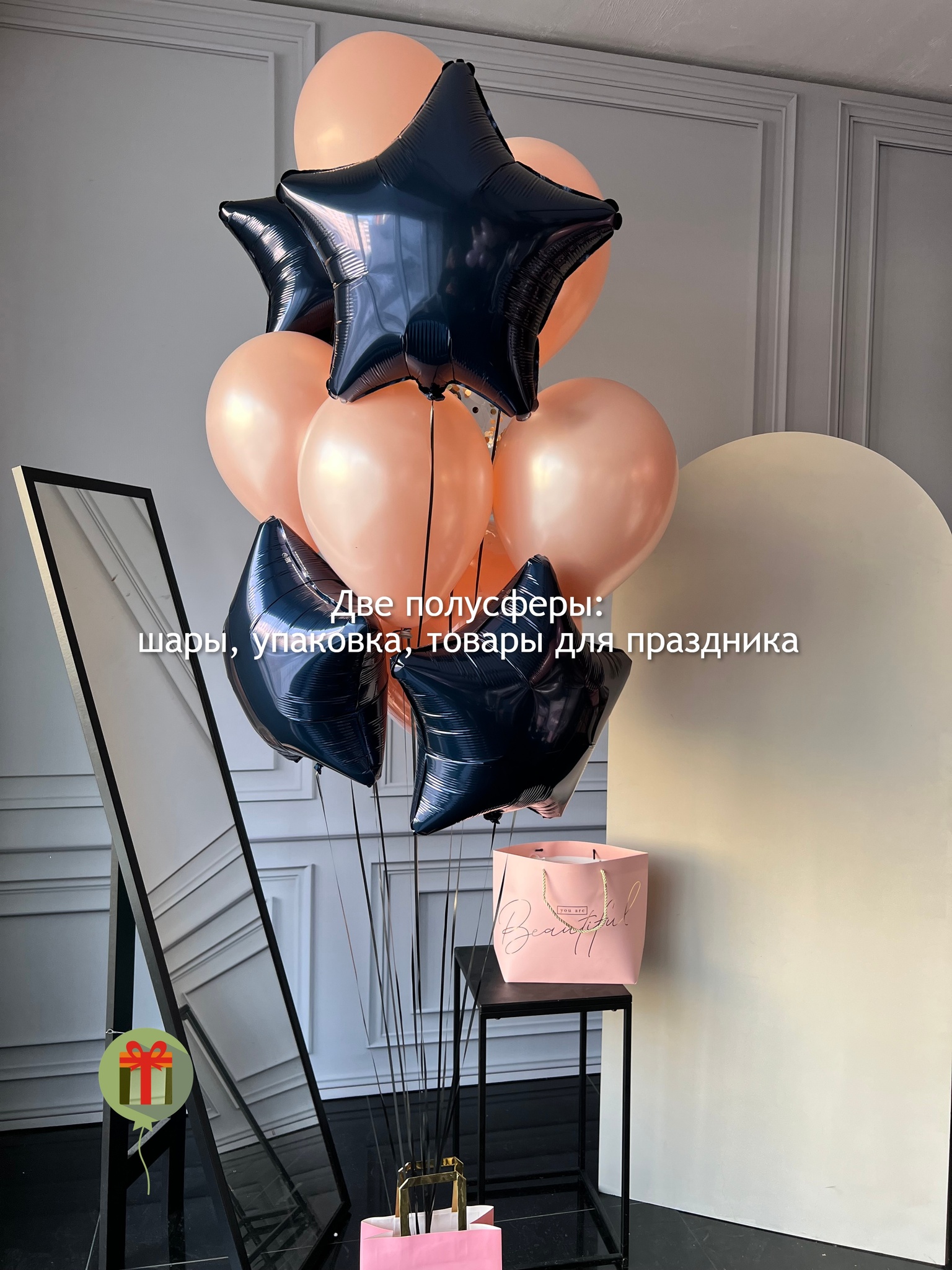 Фонтан из 13 штук: сфера дабл бабл 45 см+ надпись, сфера 45 см с конфетти, 5 звезд 45 см и 6 жемчужных шаров. Грузики и пакеты включены в стоимость.