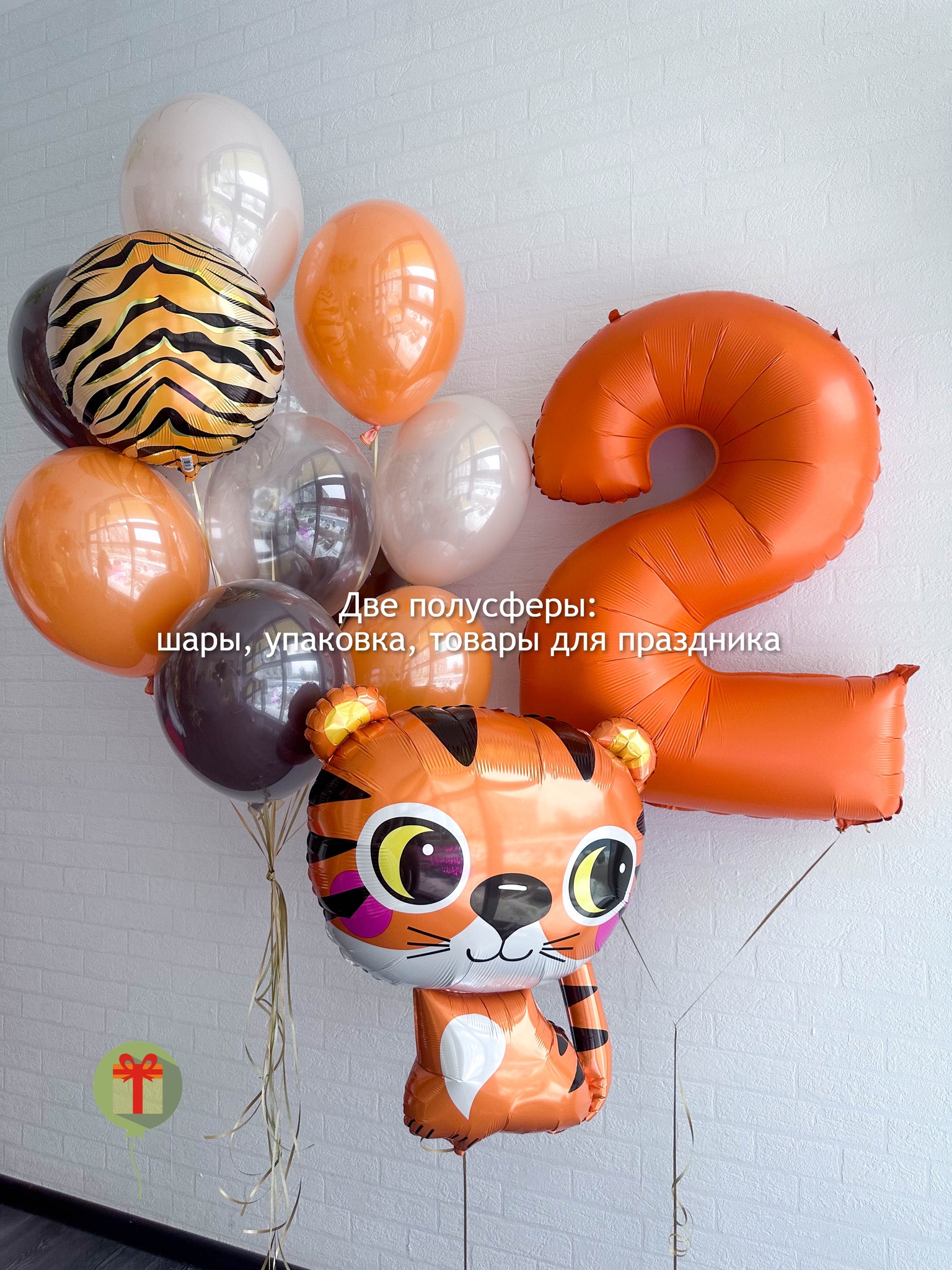 Фольгированная фигура тигренка, цифра 102 см и 2 фонтана по 10 штук: 1 шар 45 см, 6 двойных шаров пастель и 3 шара кристалл. Грузики и пакеты включены в стоимость.