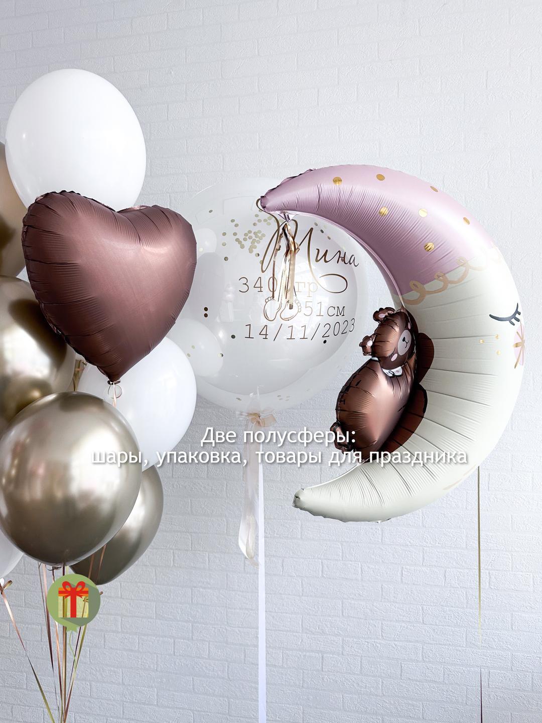 Сфера дабл бабл 60 см с индивидуальной надписью и фонтан из 10 шаров: 1 фольгированное сердце 45 см, 4 шара хром и 5 шаров пастель, а так же фольгированная фигура. Грузики и пакеты включены в стоимость.