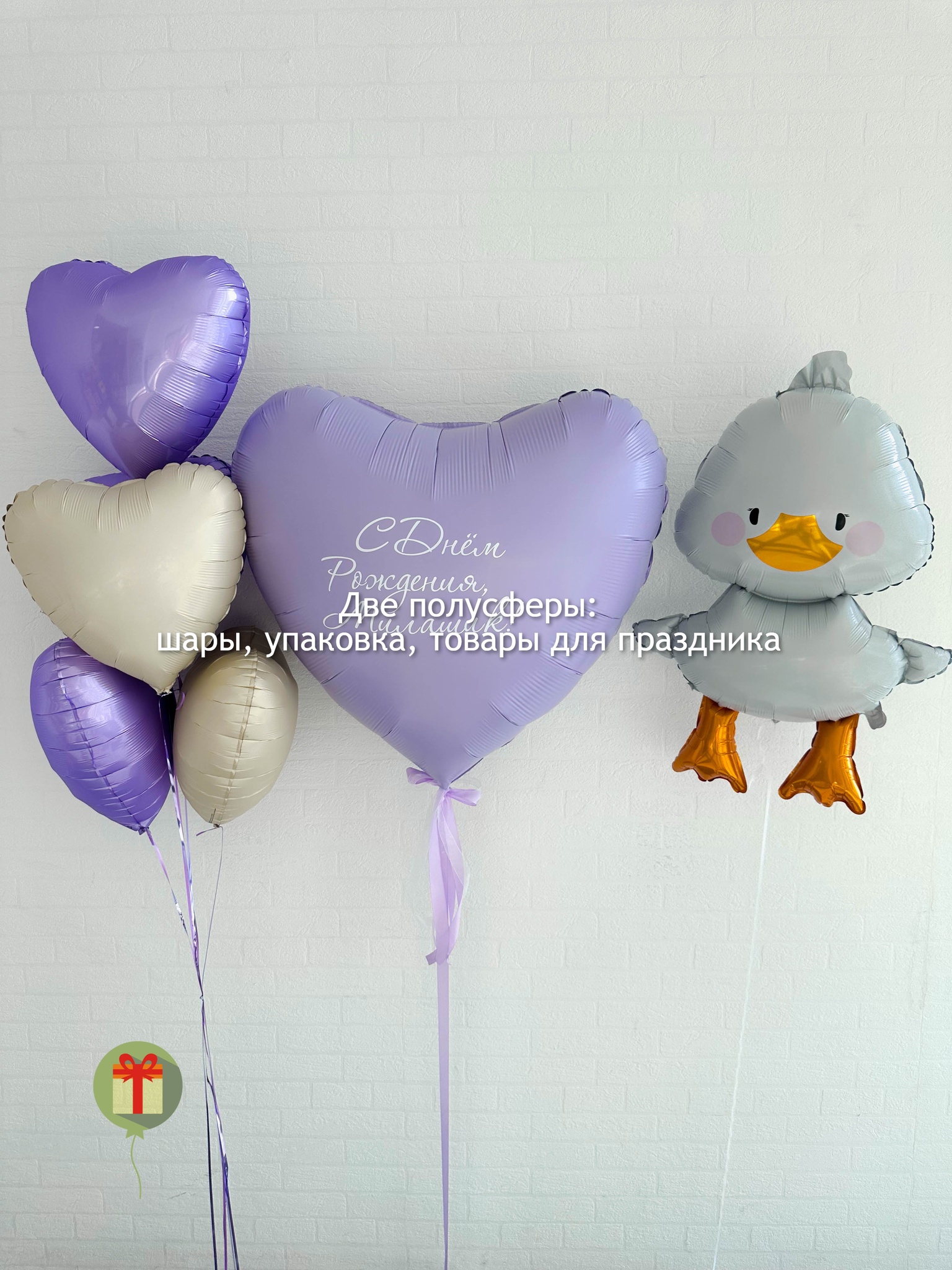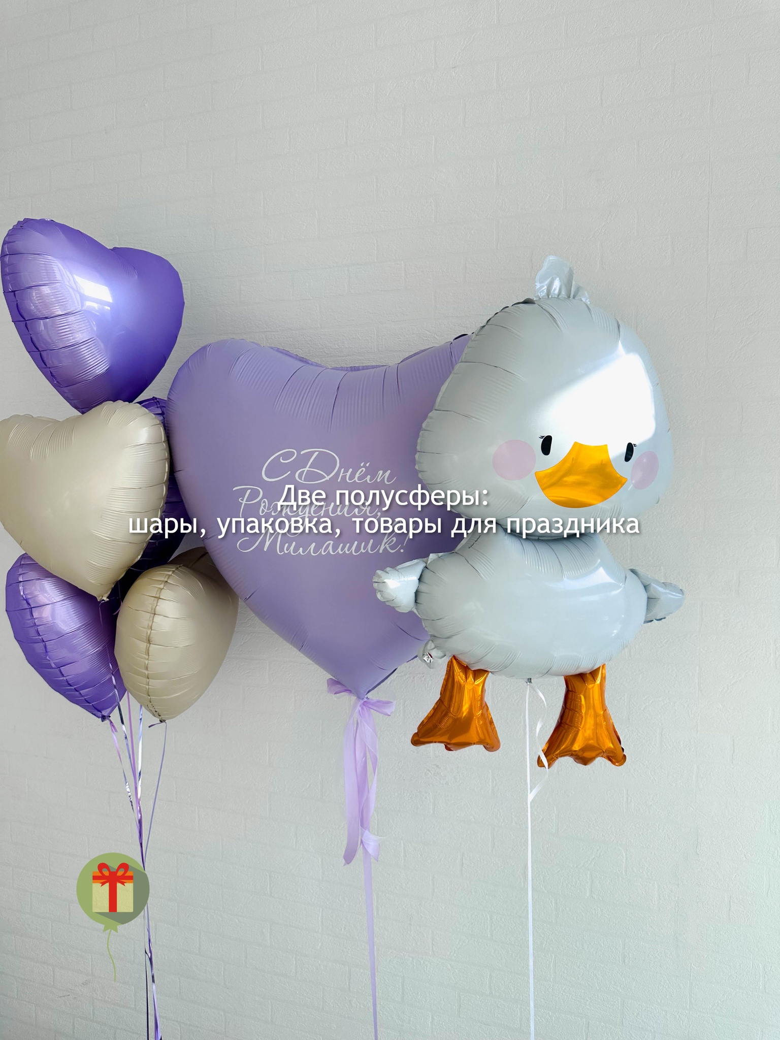 Большое фольгированное сердце 80 см+ надпись, фонтан из 5 сердец 45 см и фигурка уточки. Грузики и пакеты включены в стоимость.