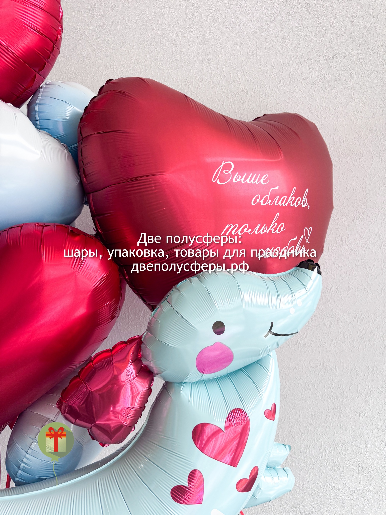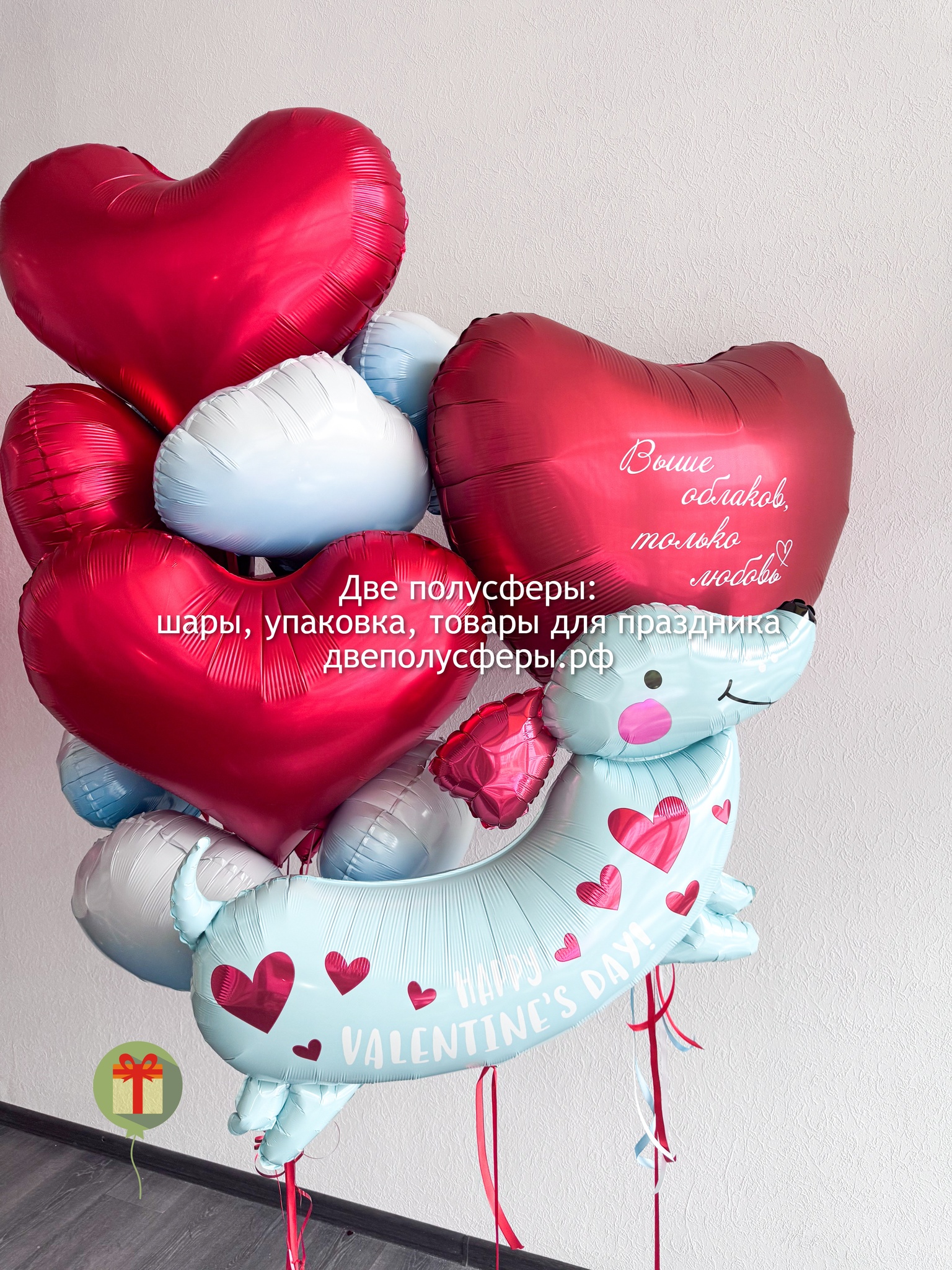 Большое фольгированное сердце 60 см с надписью, фольгированная фигурка собачки и фонтан из 9 шаров,  фольгированных Облачков  45 см 6 шт и фольгированных сердец 55 см 3 шт, грузик и пакет входят в стоимость