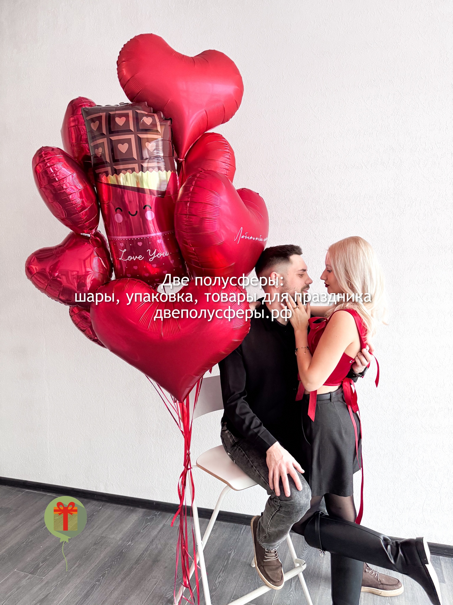 Набор из 10 шаров, в составе :  4 фольгированных сердца 55 см, фольгированная фигурка шоколада и 5ифольгированных сердец 45 см. Грузик и пакет входят в стоимость.