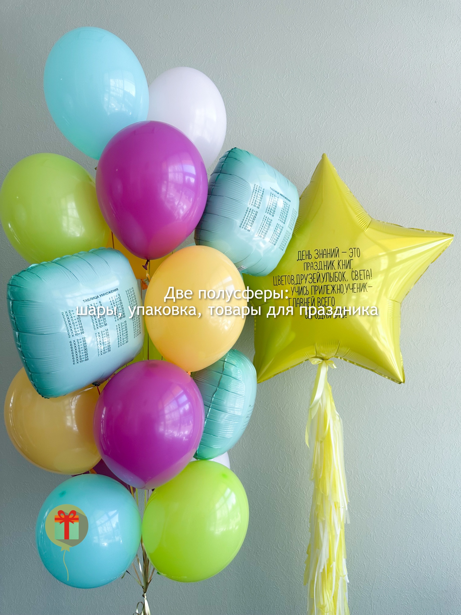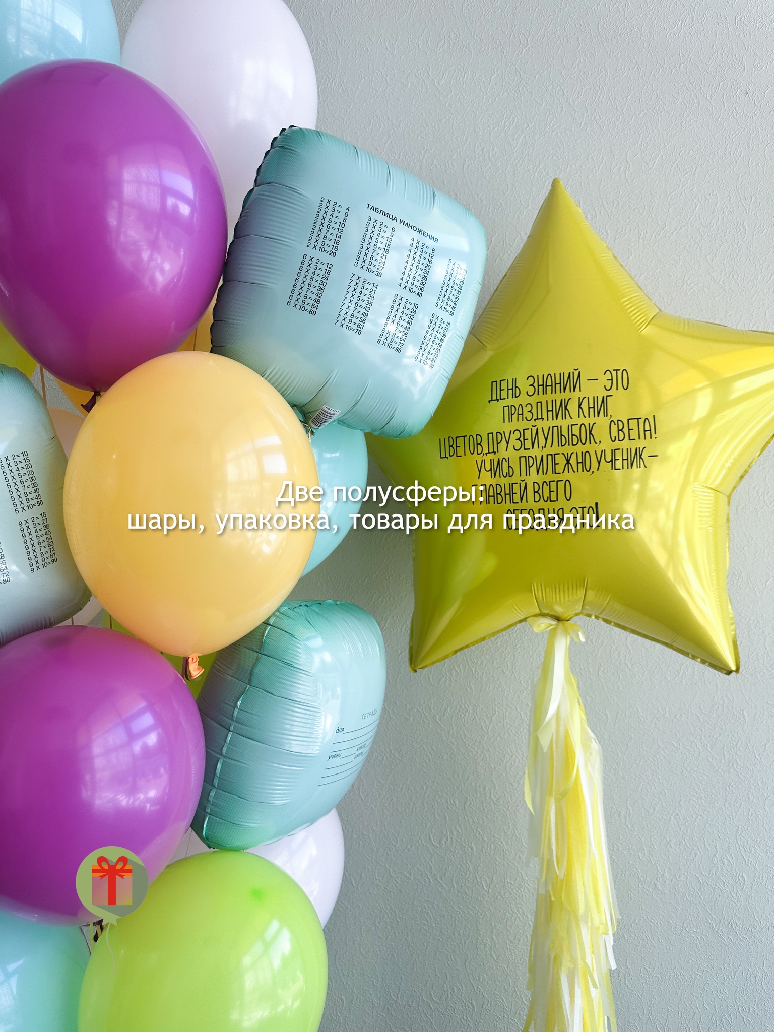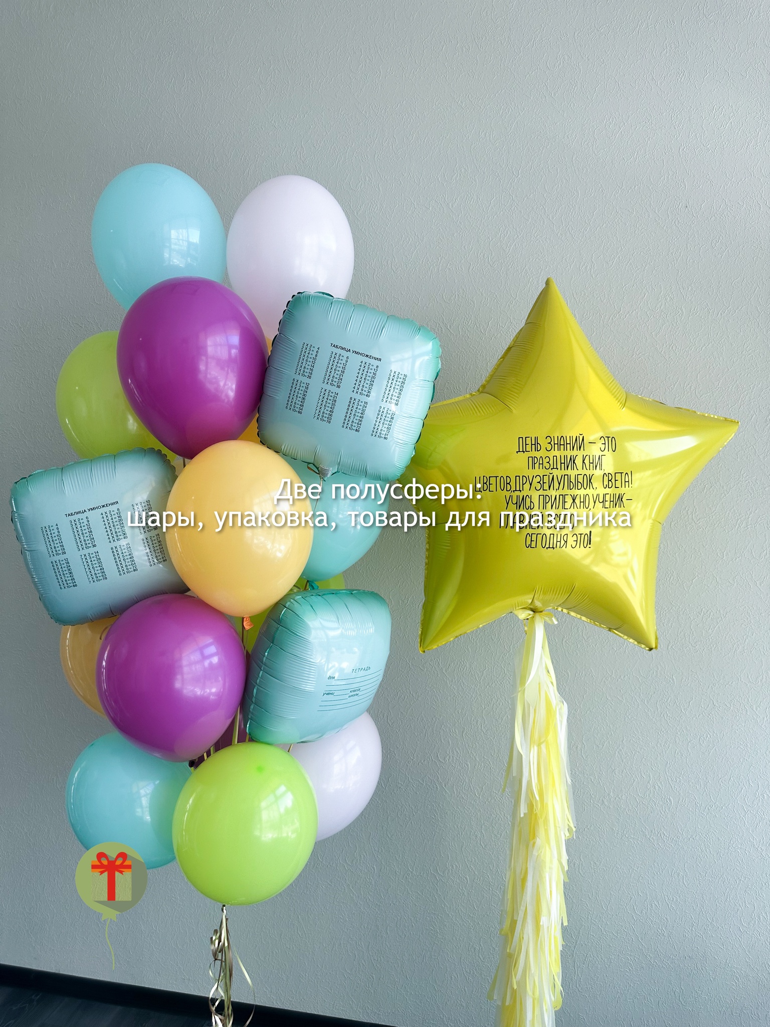 Фольгированная звезда 60 см+ надпись, декорированная пышным хвостом и фонтан из 16 штук: 3 фольгированных шара с рисунком 45 см и 13 шаров пастель. Грузики и пакеты включены в стоимость.