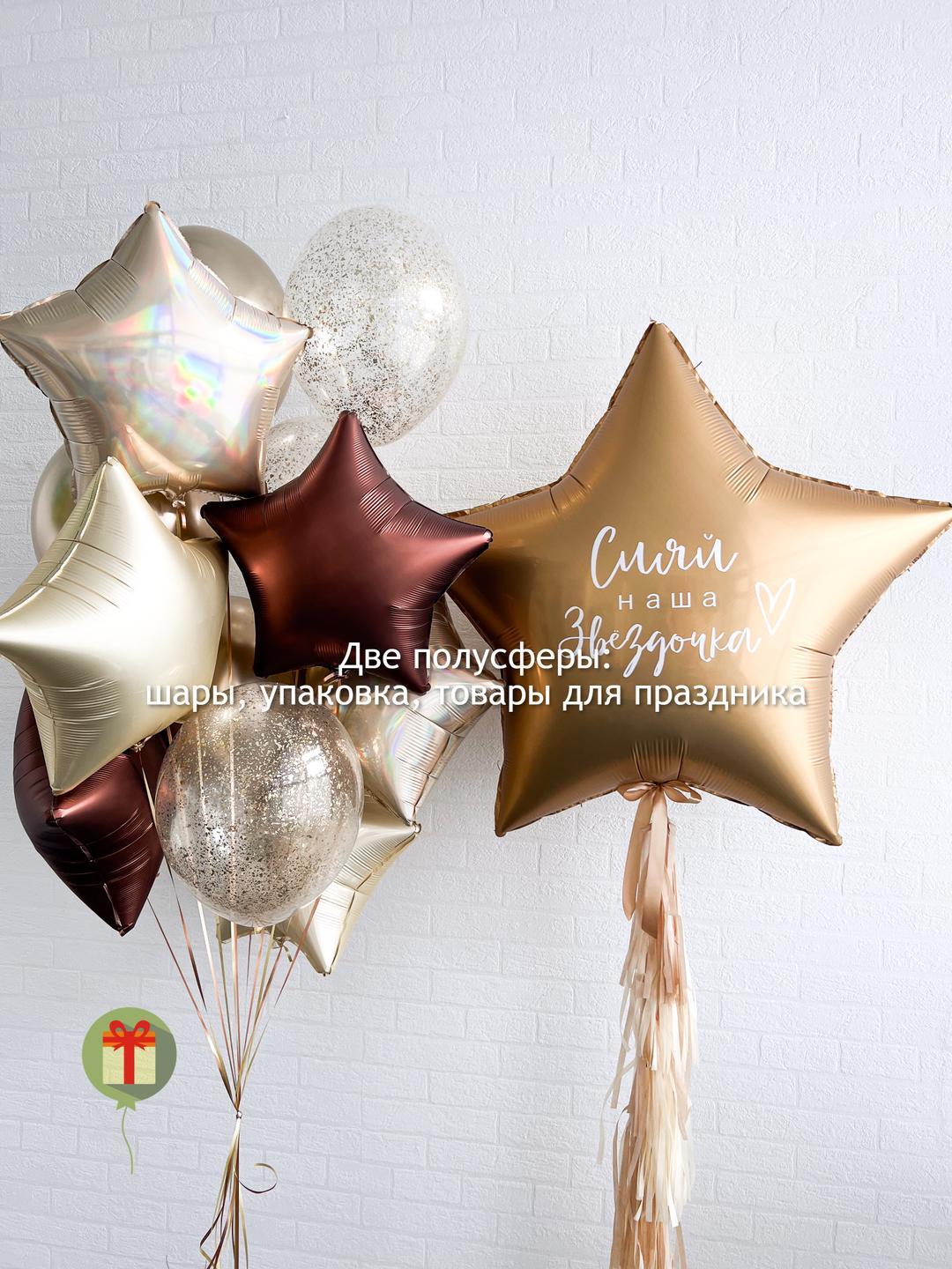 Фонтан из 12 шаров: 6 звезд 45 см, 3 шара хром, 3 шара с конфетти, большая звезда 60 см с пушистым хвостом и надписью, грузики, пакеты