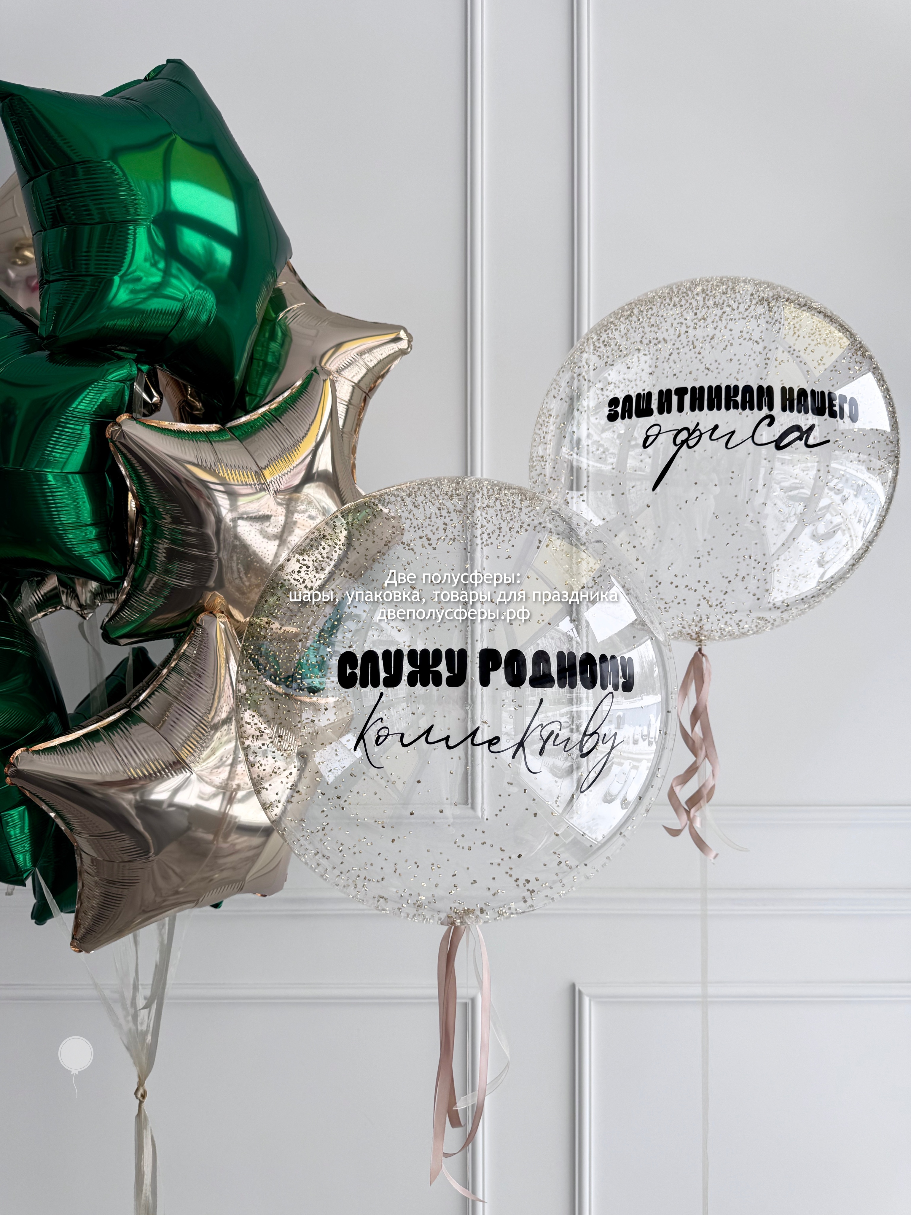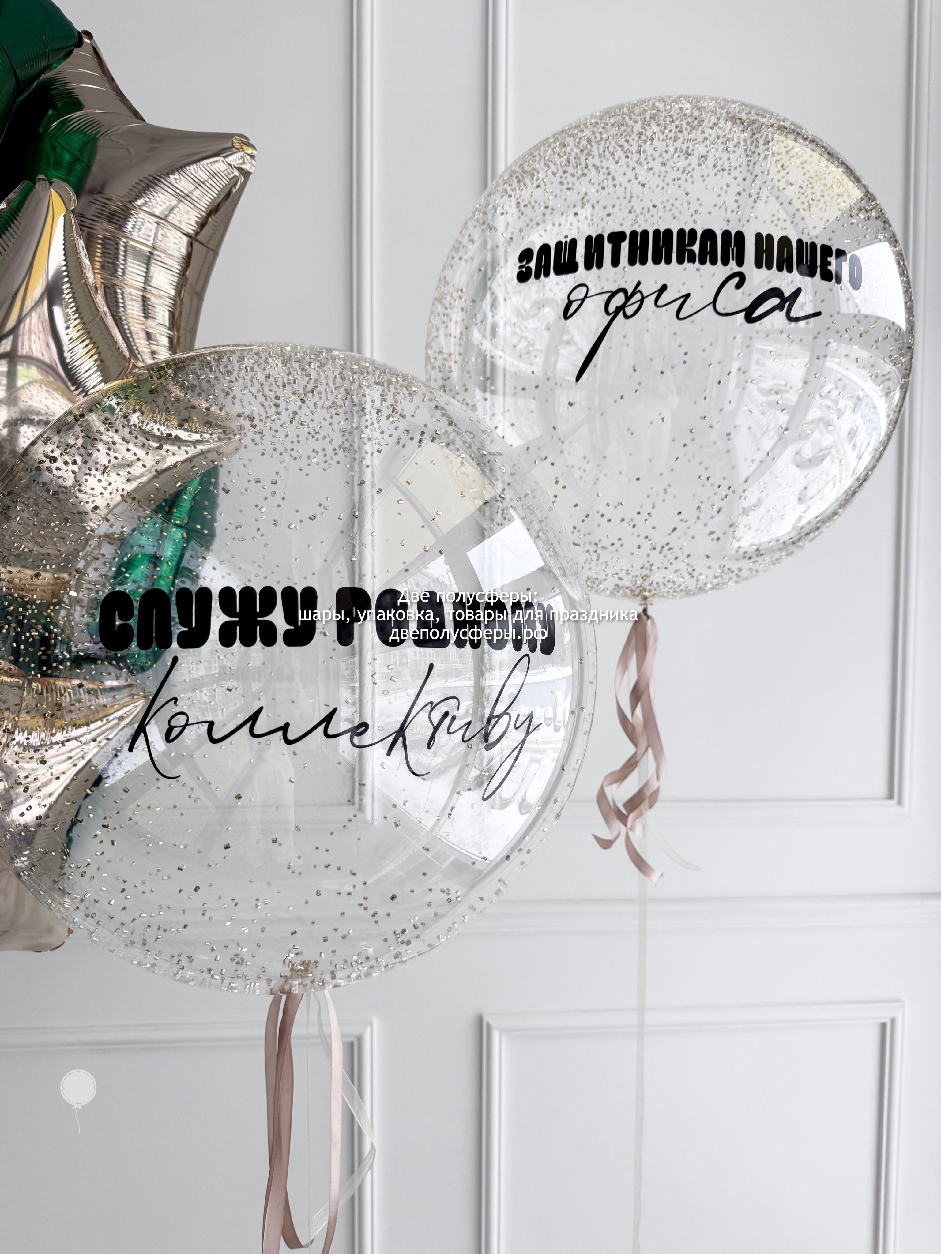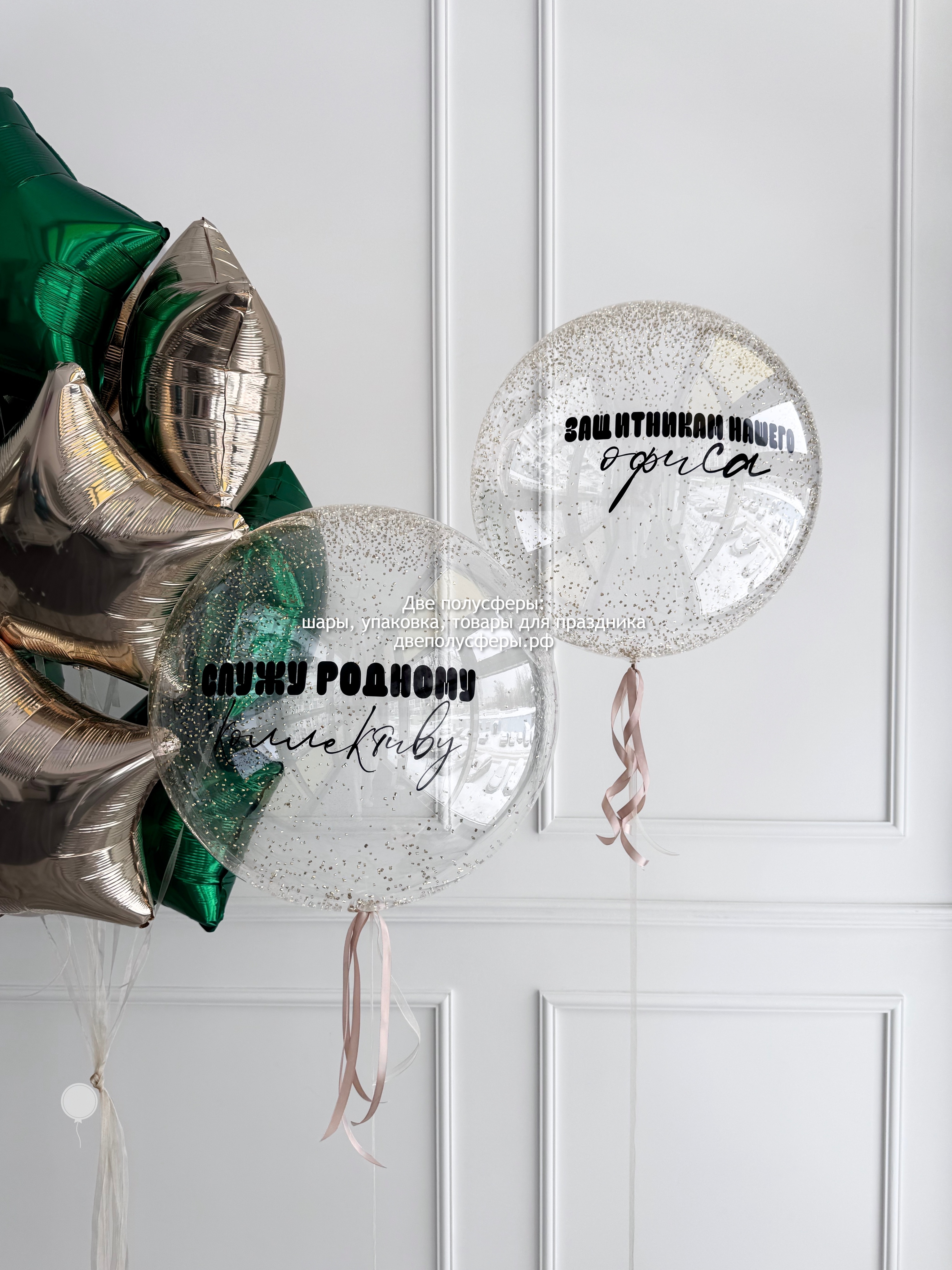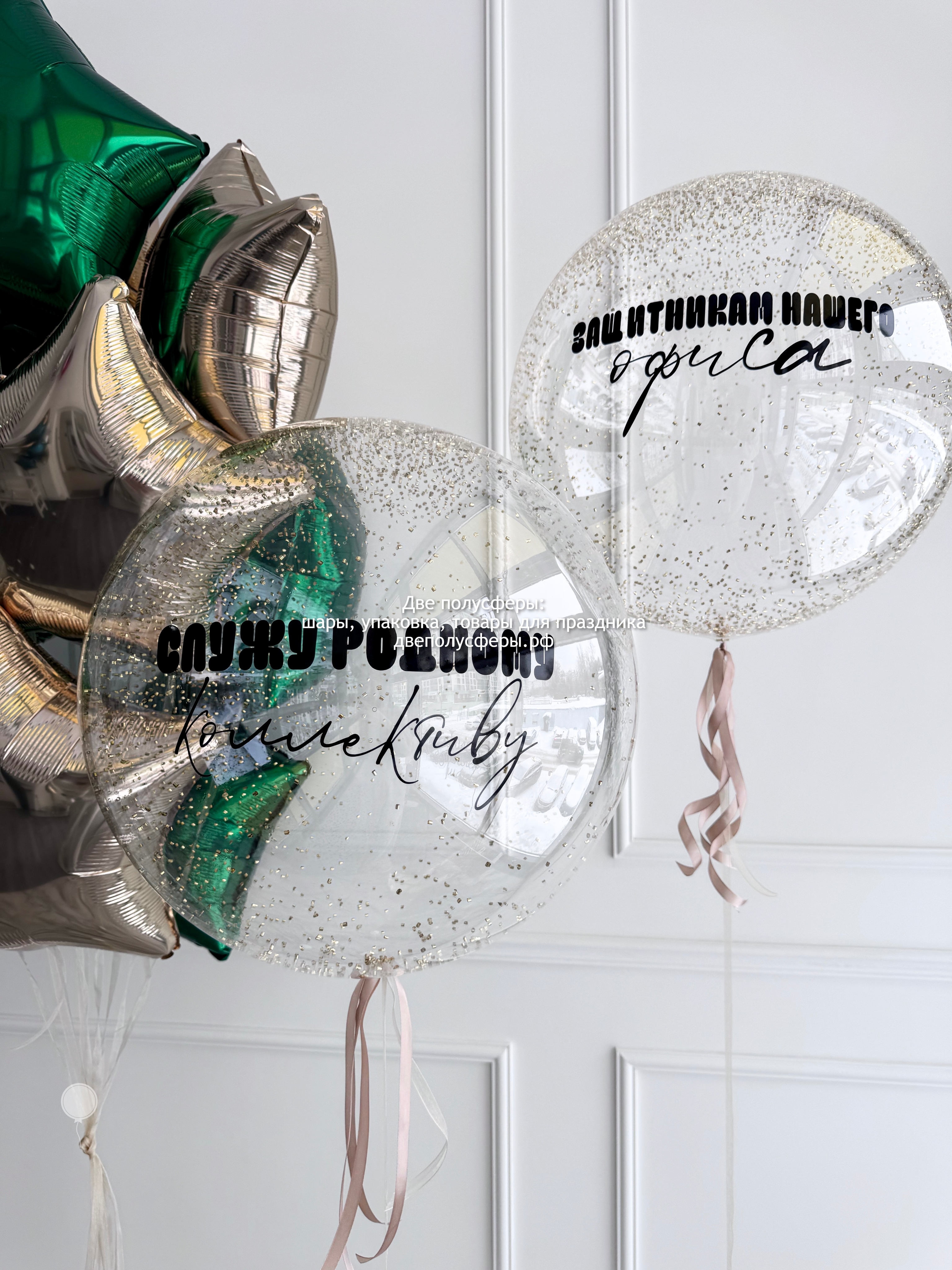 2 сферы 45 см с конфетти и надписями, фонтан из 10 фольгированных звезд 45 см, грузики и пакеты входят в стоимость