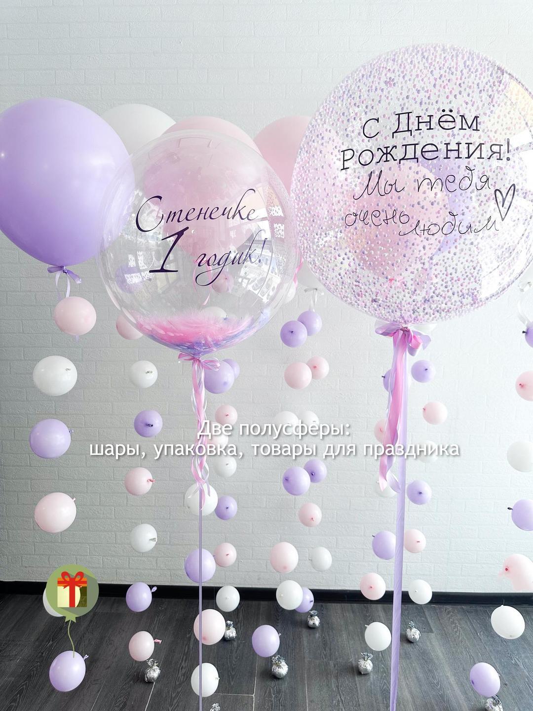 Сфера с пенопластом 80 см+ надпись, сфера 60 см с перьями+ надпись; 7 шаров пастель 45 см на цепочках из шаров. Грузики и пакеты включены в стоимость.