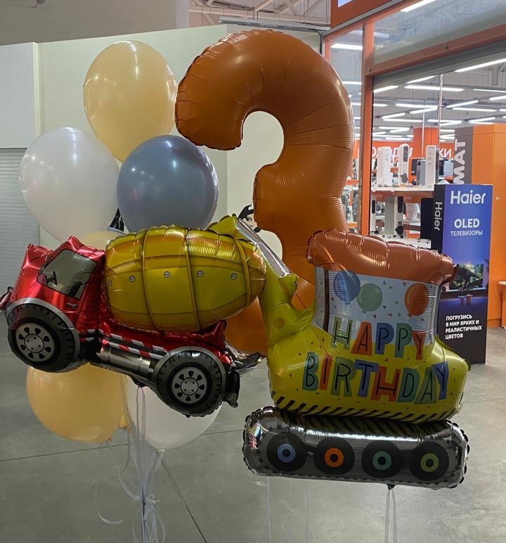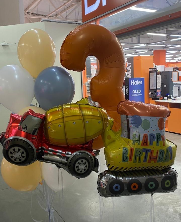 Цифра фольгированная 102 см, 2 фольгированные фигуры строительной техники, фонтан из 7 классических Шаров